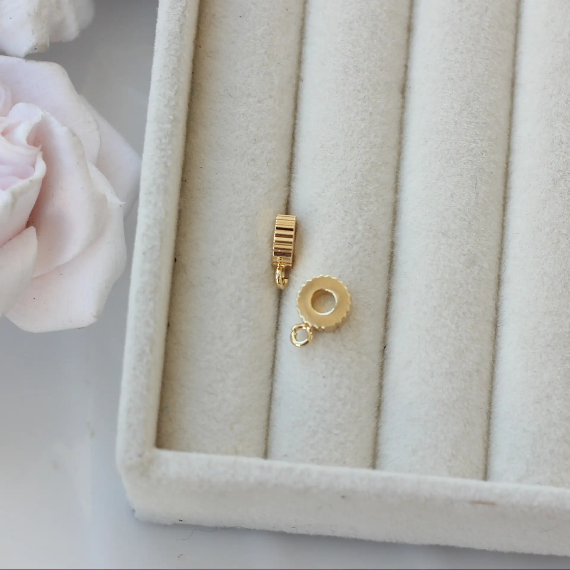 Аккуратный бейл — незаменимый элемент для крепления подвесок к цепочкам, шнурам или браслетам. Благодаря лаконичному дизайну он гармонично вписывается в любые украшения, не перетягивая внимание на себя.