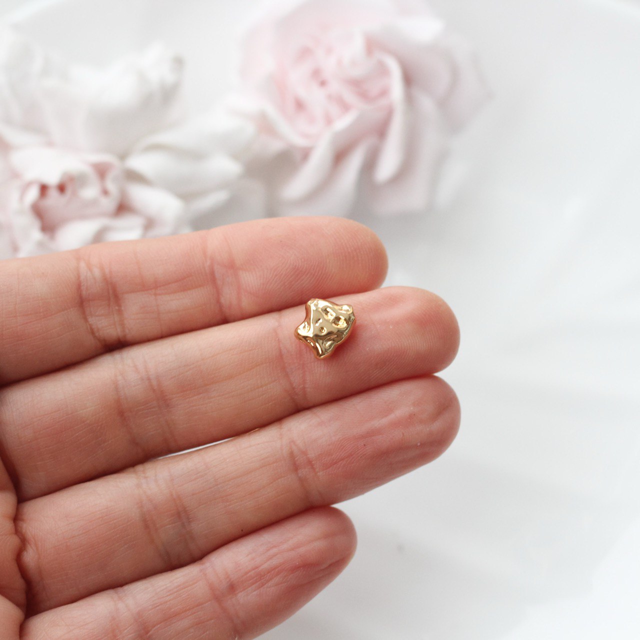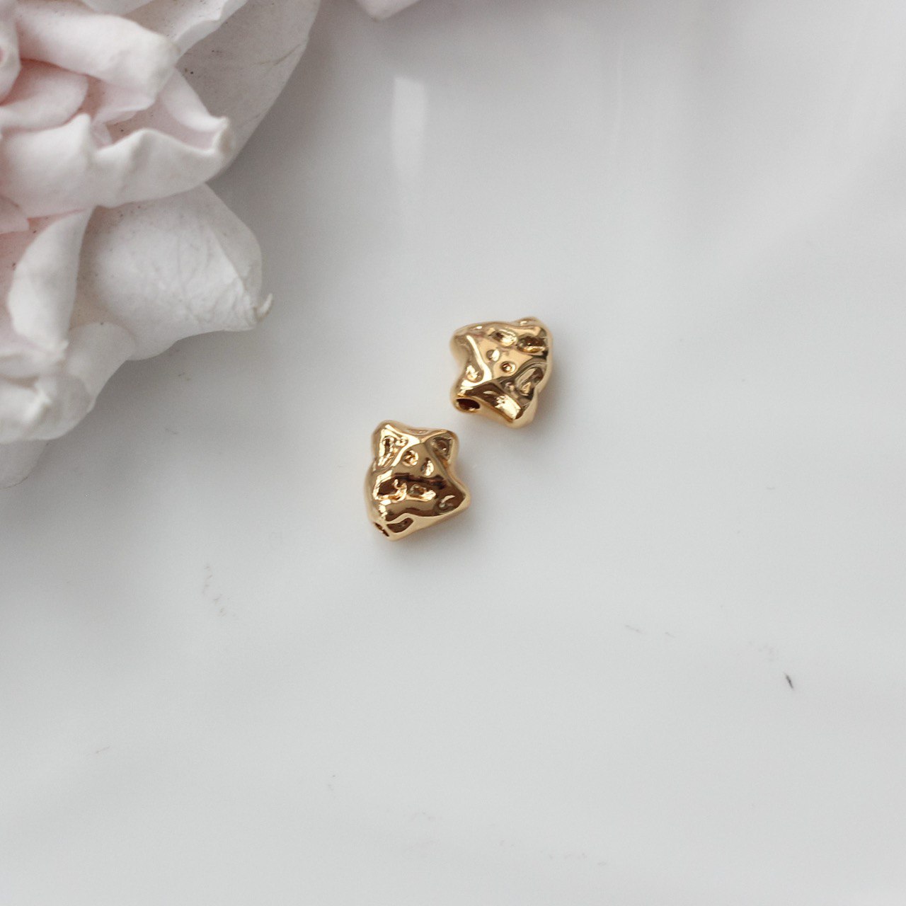 Декоративная металлическая бусина в стиле фриформ с выразительной абстрактной формой. Каждая бусина выглядит как миниатюрный арт-объект — с плавными линиями, асимметрией и живой пластикой, напоминающей расплавленный металл.