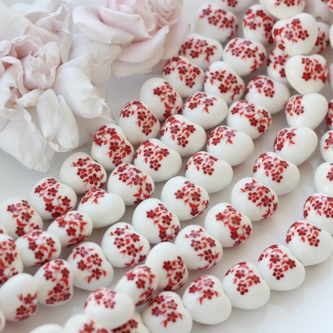 Бусина Сердце, керамика, белая с красной росписью, 17 мм, 1 нить, К125