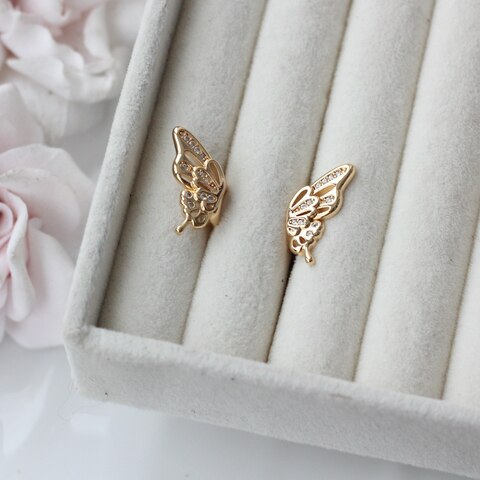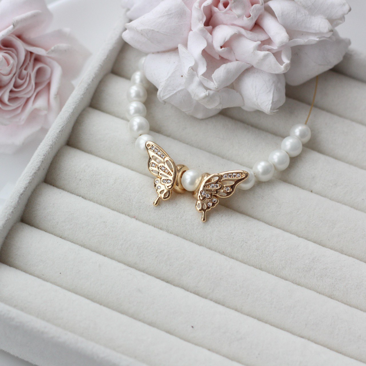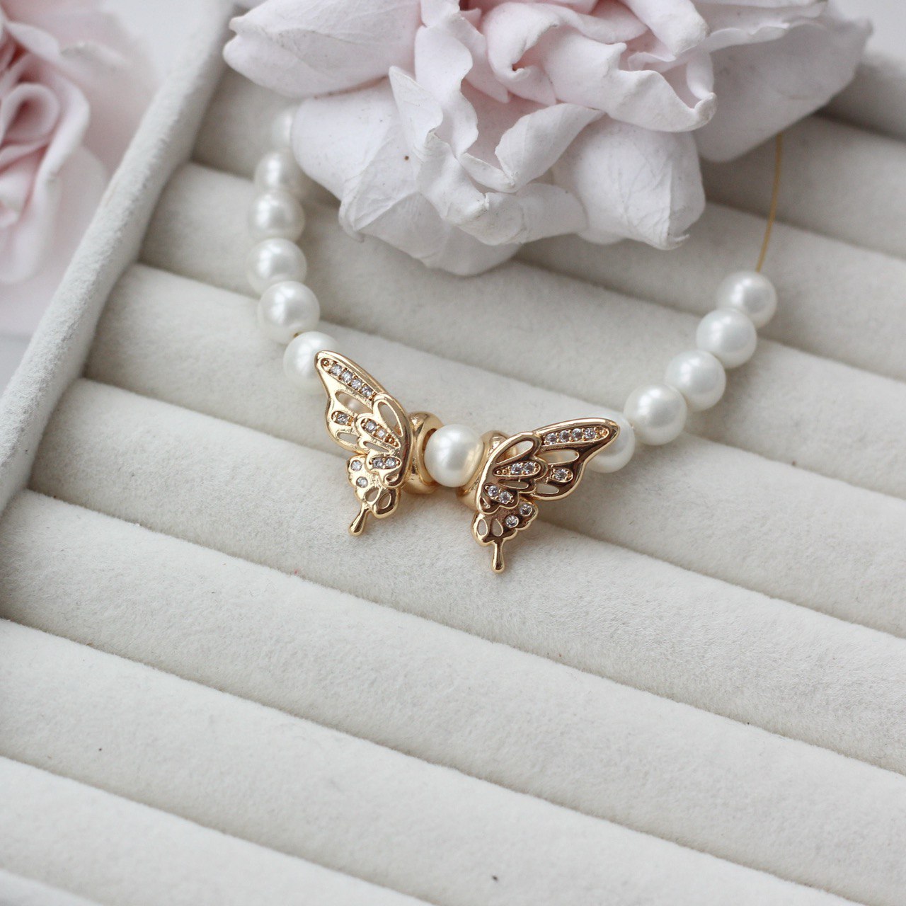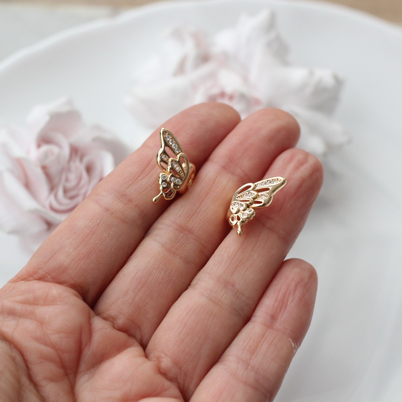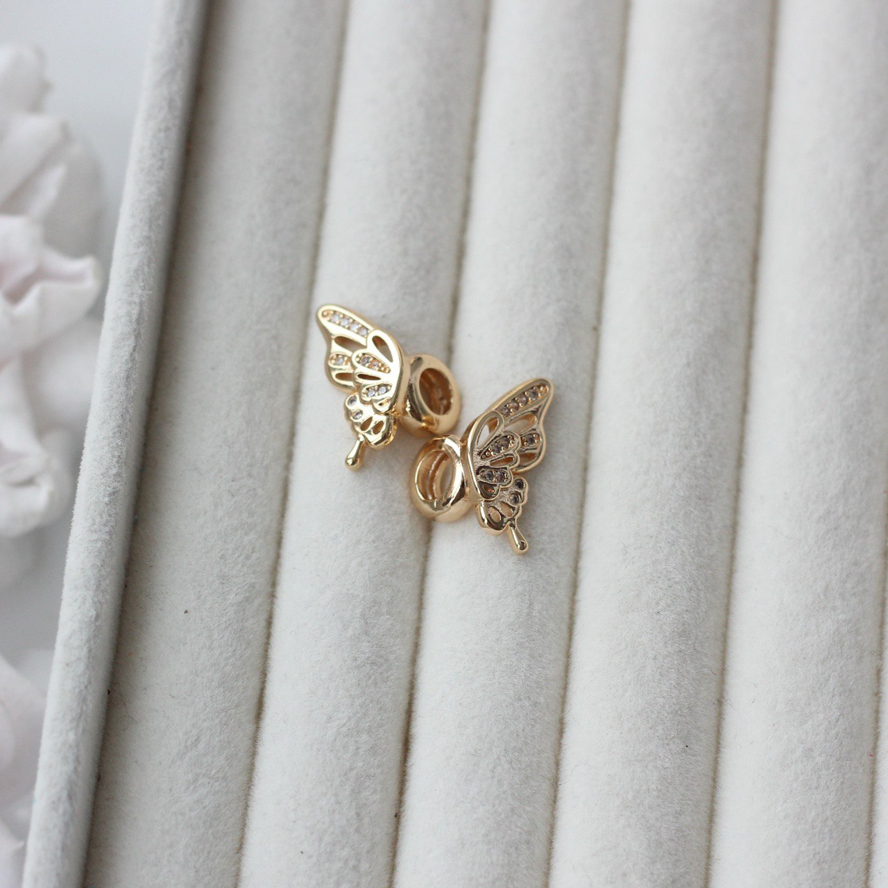 Декоративные металлические бусины в форме бабочки с инкрустацией фианитами. Лёгкий и изящный элемент для украшений с символикой трансформации, нежности и свободы. Подходят для браслетов, колье и акцентных деталей в авторских украшениях.