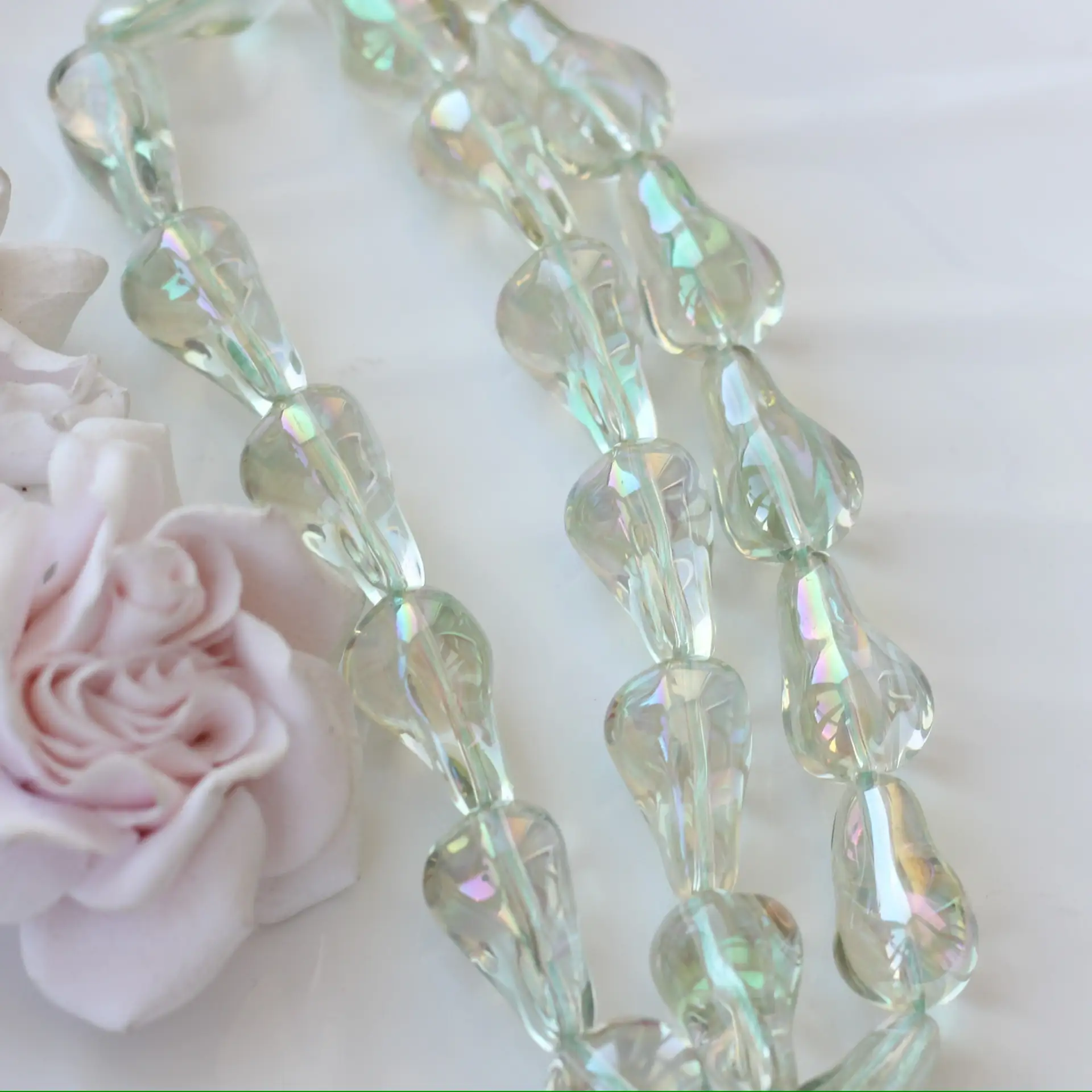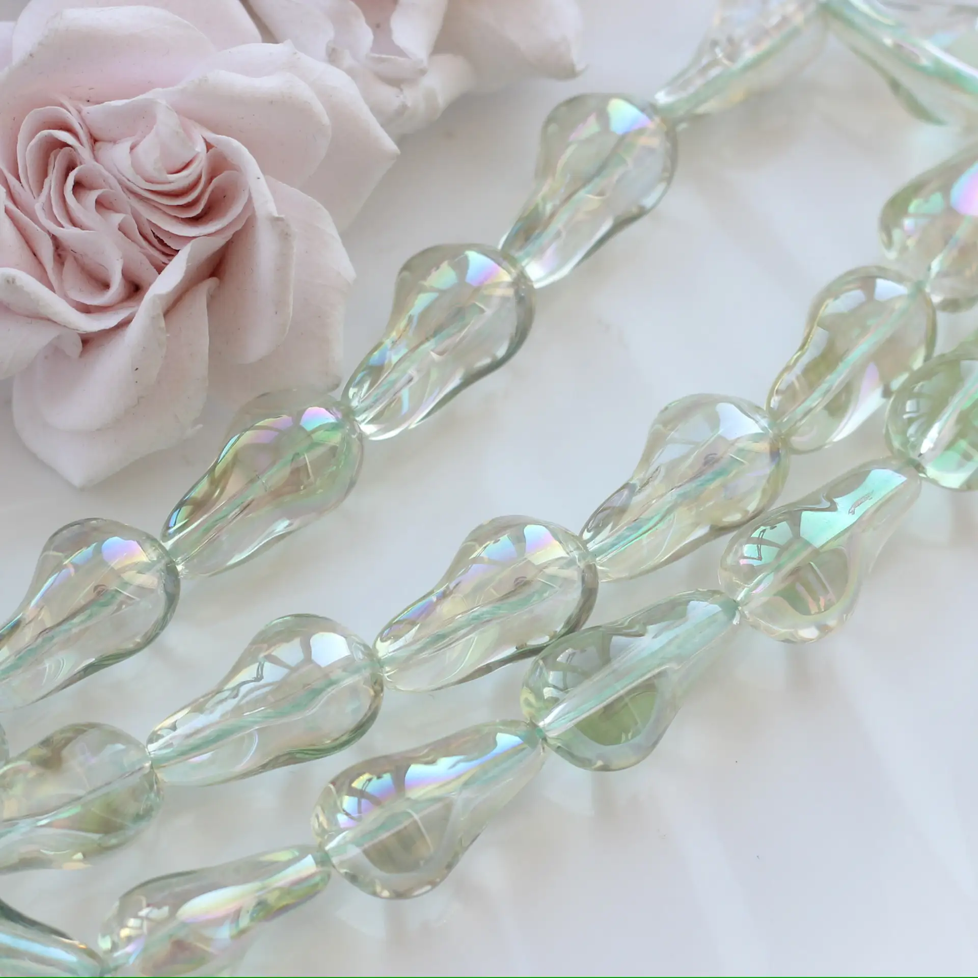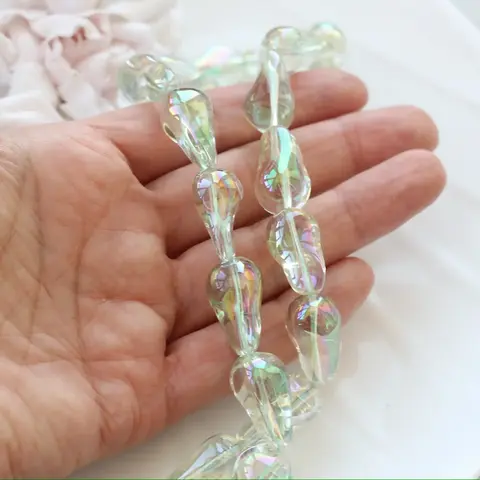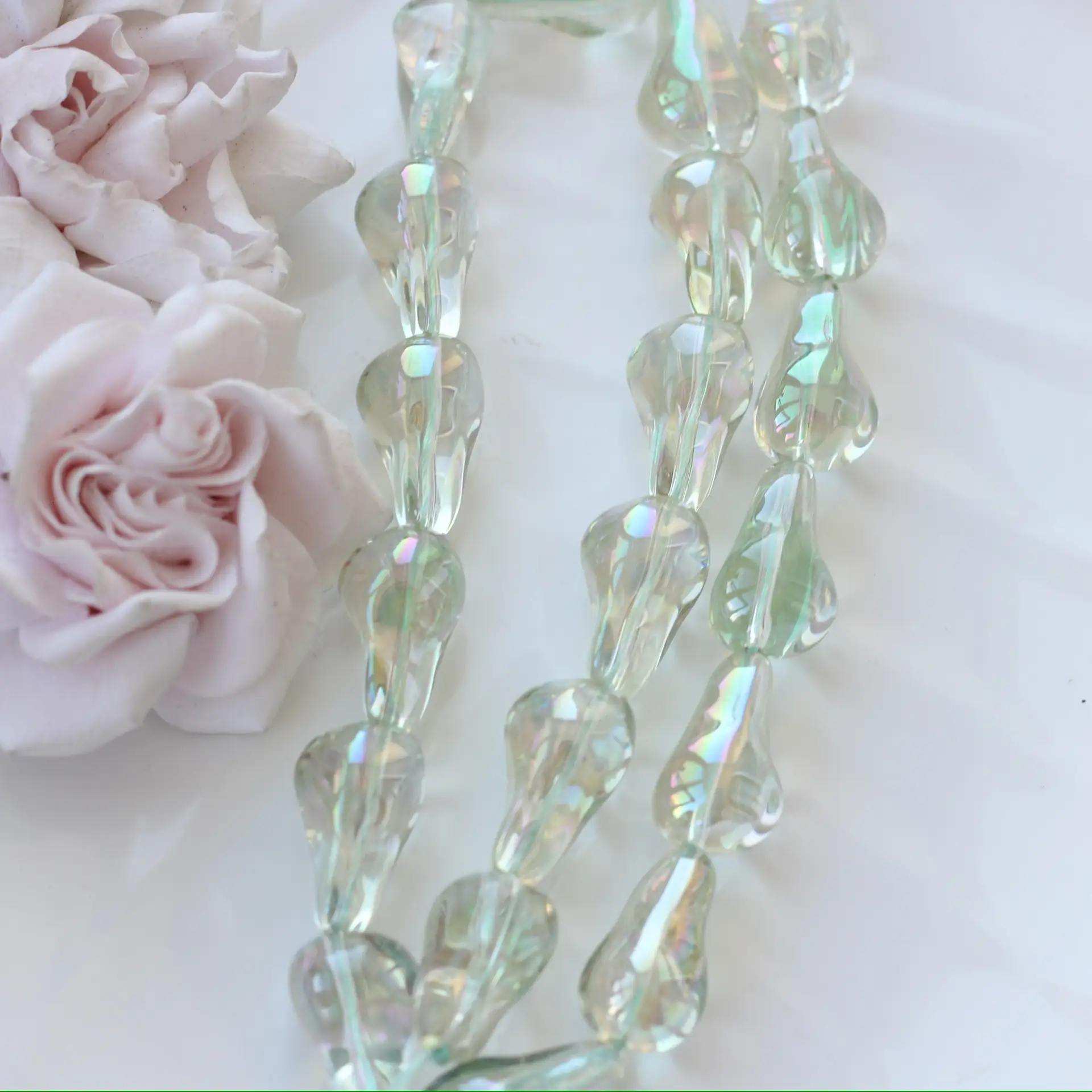 Эти стеклянные бусины свободной формы словно поймали свет и превратили его в мягкое переливчатое сияние. Каждая бусина уникальна: плавные, асимметричные линии и глянцевая поверхность создают ощущение живого стекла, будто слегка расплавленного и застывшего в движении.