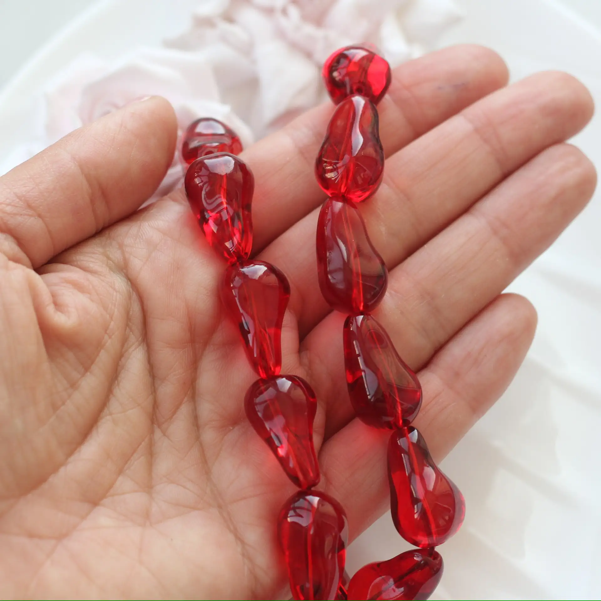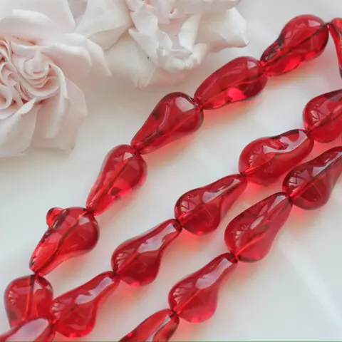 Эти стеклянные бусины свободной формы словно поймали свет и превратили его в мягкое переливчатое сияние. Каждая бусина уникальна: плавные, асимметричные линии и глянцевая поверхность создают ощущение живого стекла, будто слегка расплавленного и застывшего в движении.