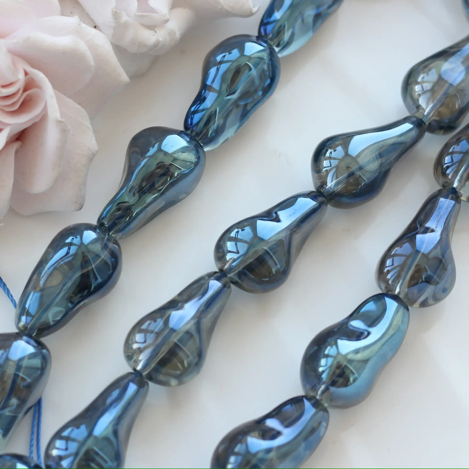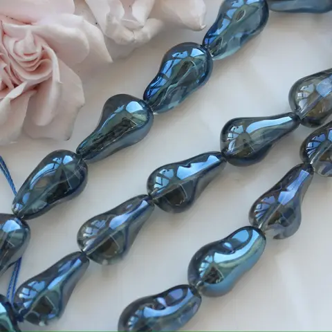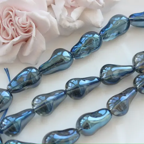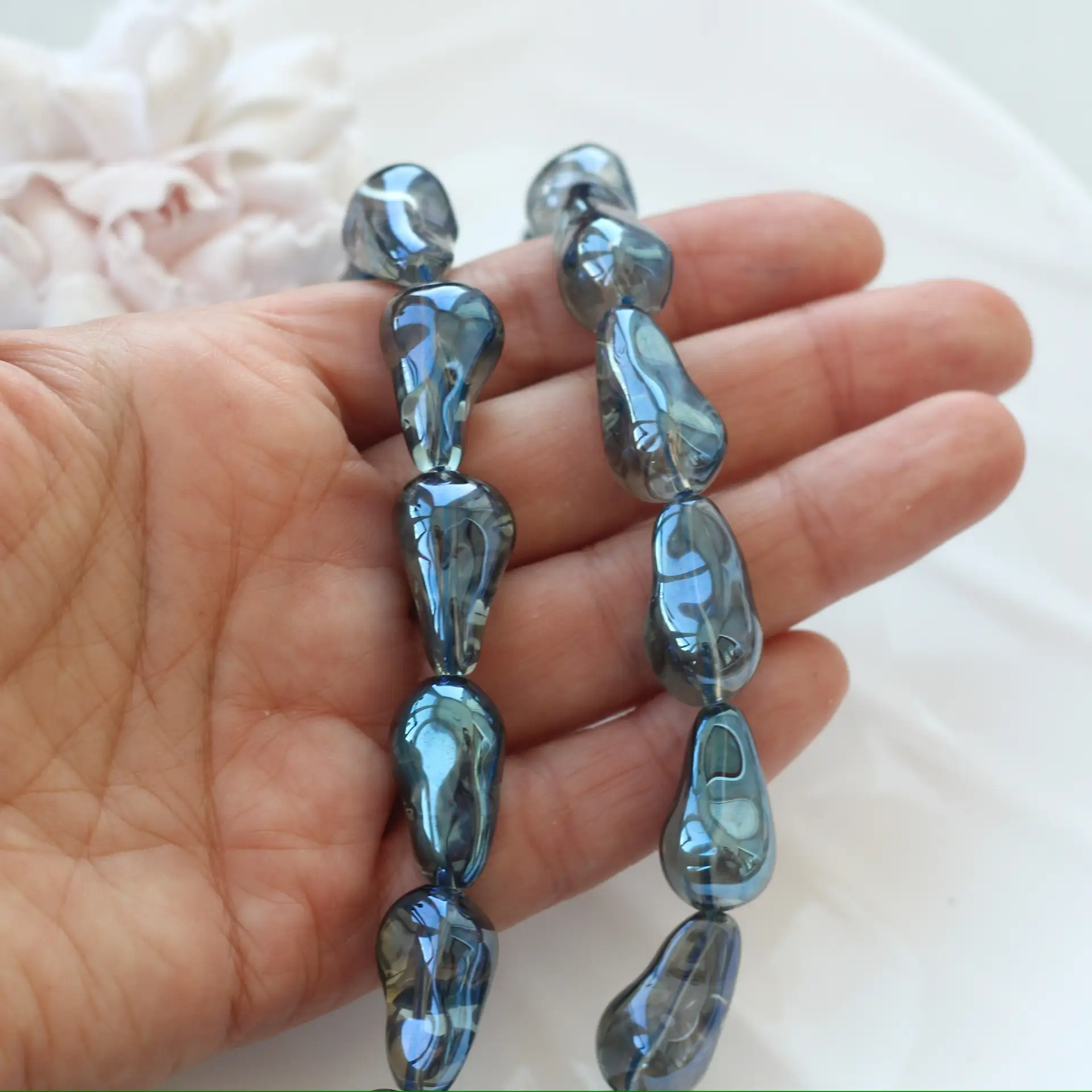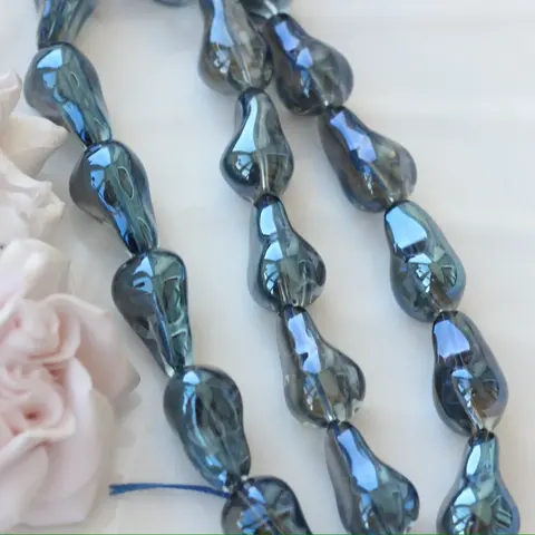 Эти стеклянные бусины свободной формы словно поймали свет и превратили его в мягкое переливчатое сияние. Каждая бусина уникальна: плавные, асимметричные линии и глянцевая поверхность создают ощущение живого стекла, будто слегка расплавленного и застывшего в движении.