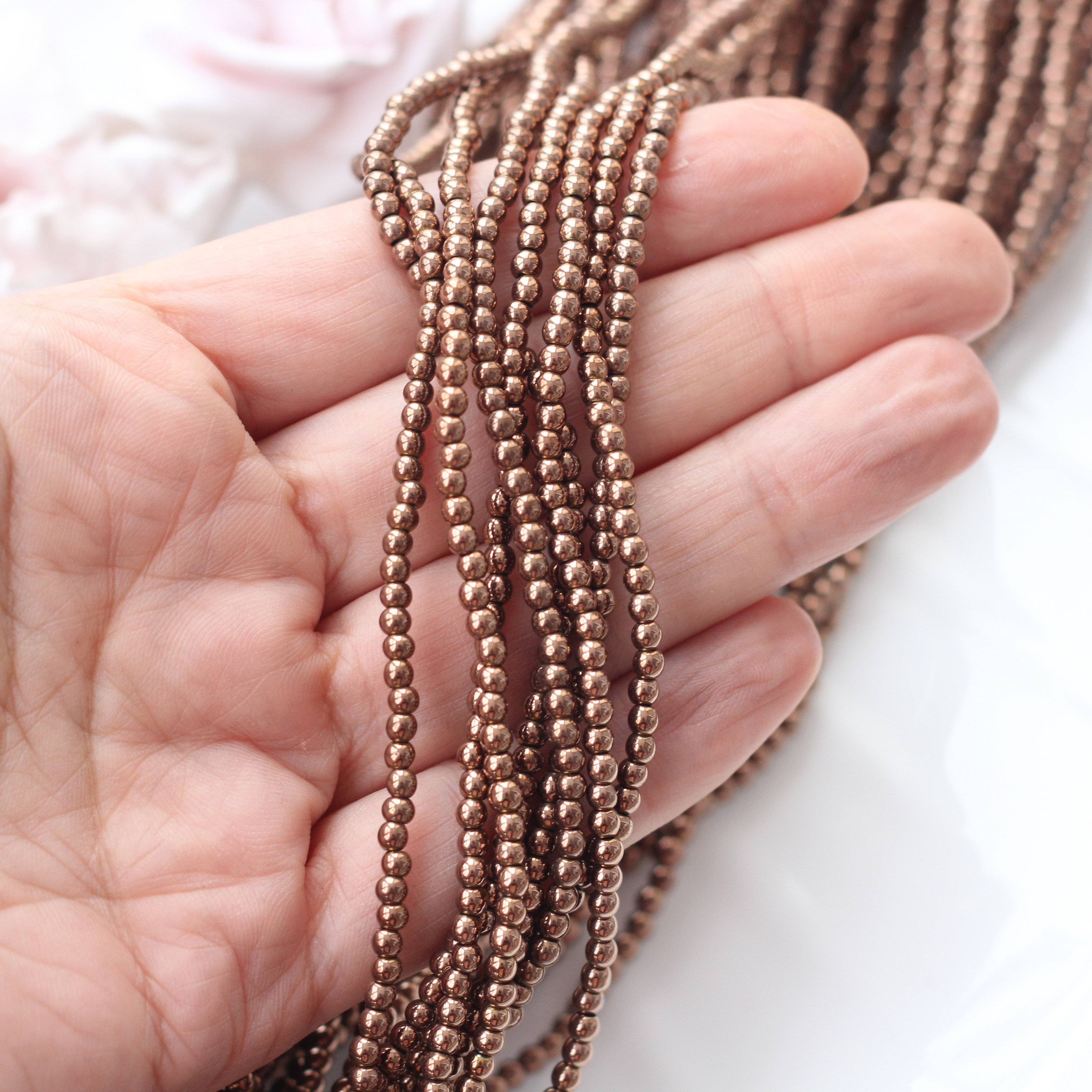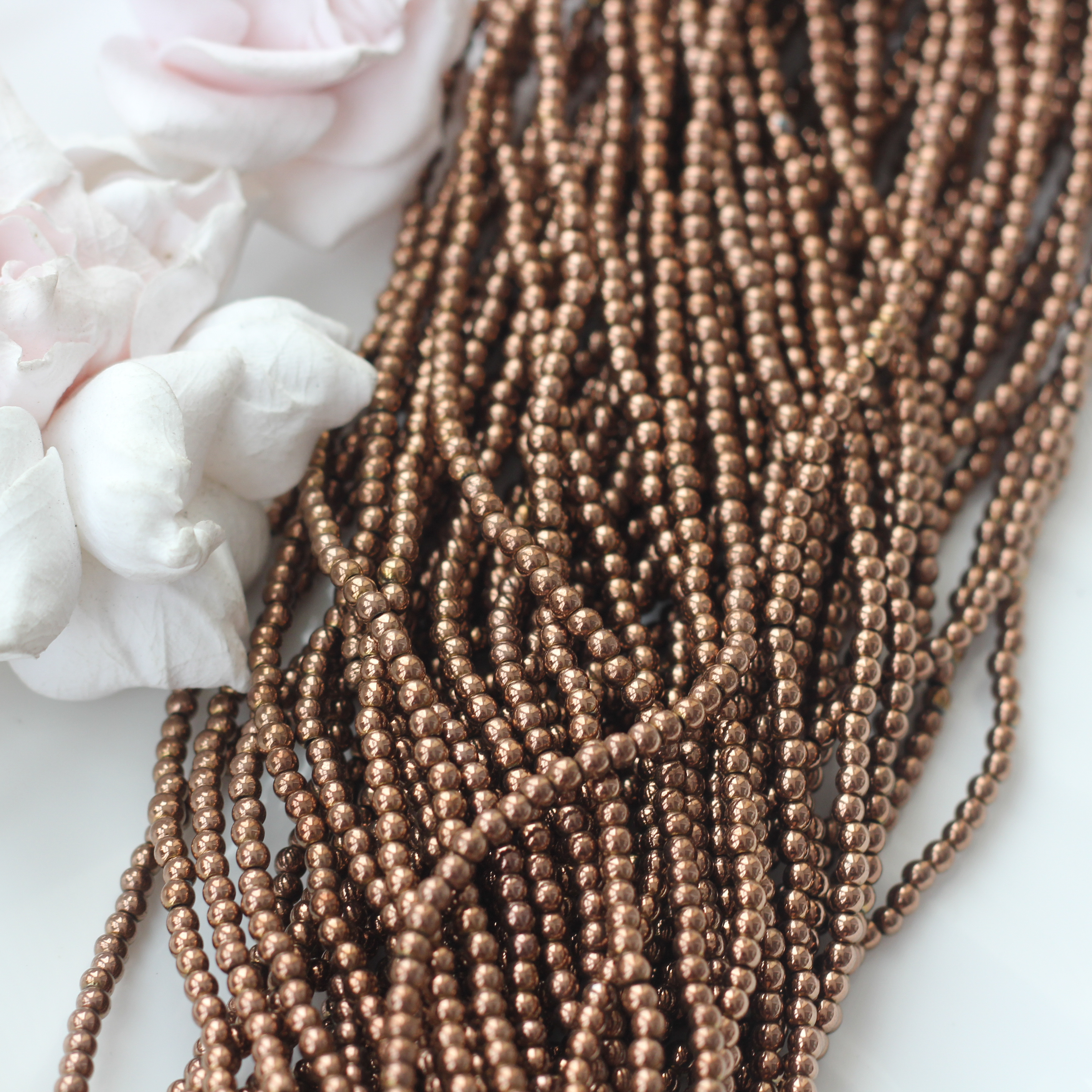 Гематин шоколадного оттенка с выразительным металлическим блеском — качественная имитация натурального гематита, популярная в современном дизайне. Тёплый, насыщенный цвет с зеркальной поверхностью напоминает оттенки какао и тёмного шоколада, красиво отражает свет и придаёт украшениям аккуратный, собранный вид.