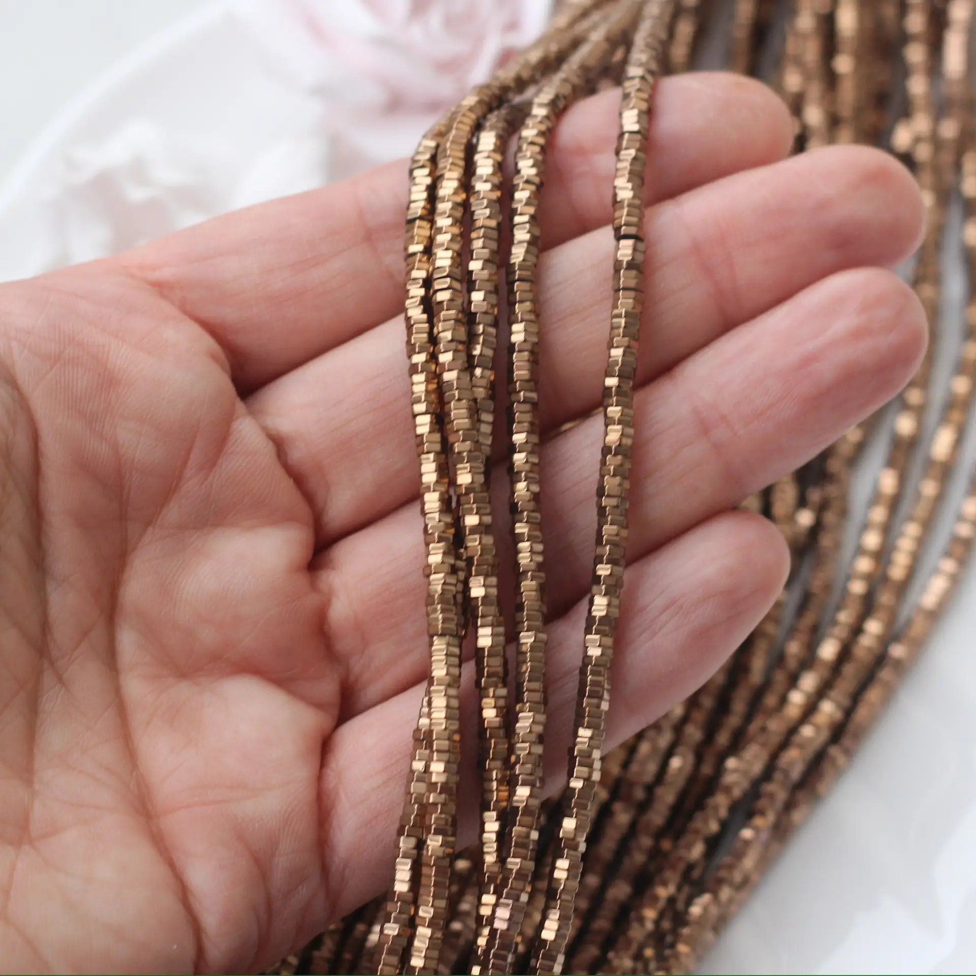 Шоколадные бусины из синтетического гематита с изящной шестигранной формой отражают свет тёплым металлическим блеском, добавляя украшениям стильную графичность и элегантность. Их компактный размер отлично подойдёт для браслетов, колье, серёг или в качестве аккуратных разделителей в авторских изделиях. Тёплый, насыщенный цвет с зеркальной поверхностью напоминает оттенки какао и тёмного шоколада, красиво отражает свет и придаёт украшениям аккуратный, собранный вид. Каждая бусина уникальна, что придаёт украшениям особую выразительность и авторский стиль. Отлично подходят для браслетов, колье, серёг и акцентных элементов.