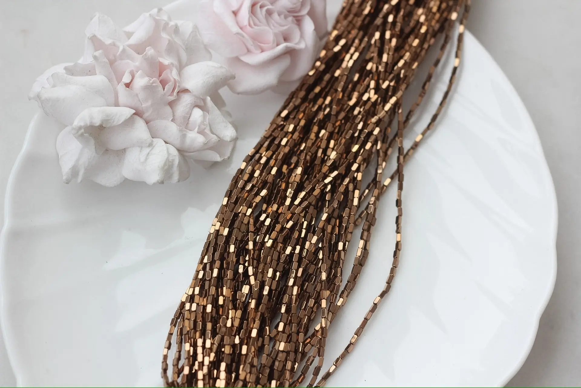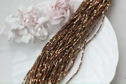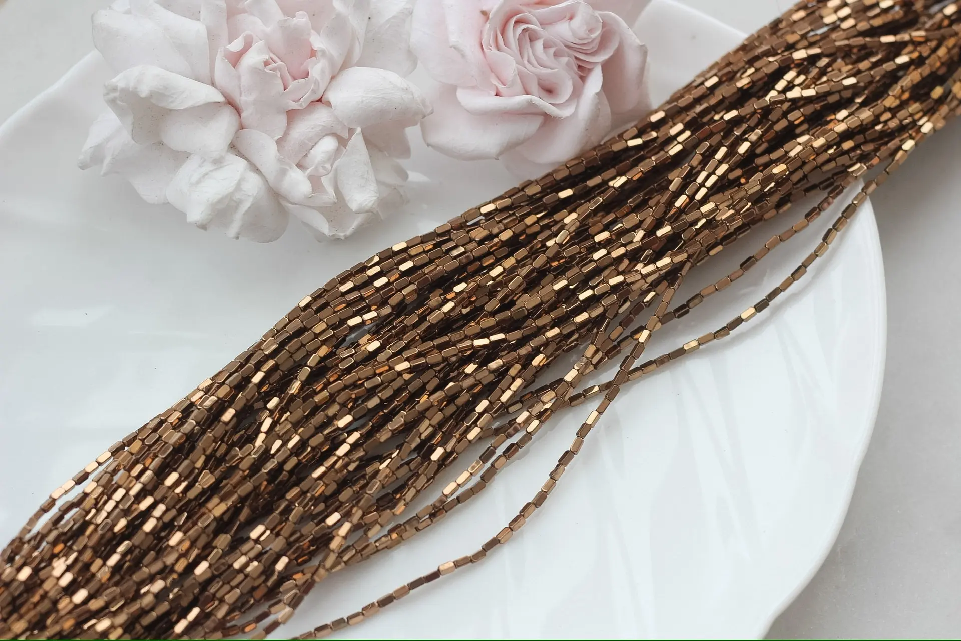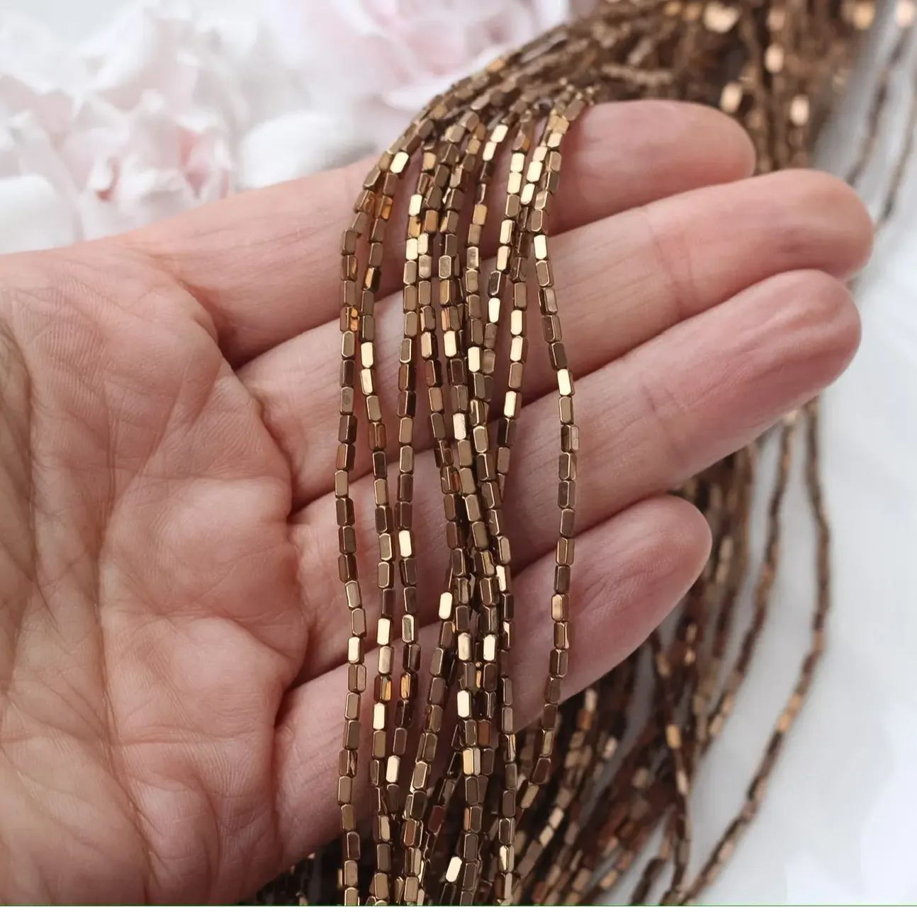 Миниатюрные бусины из синтетического гематита с прямоугольной формой и гладкой полировкой переливаются тёплым шоколадным блеском и эффектом дорогого металла. Их аккуратный размер идеально подходит для деликатных браслетов, колье, серёг или в качестве разделителей в сложных дизайнерских композициях.