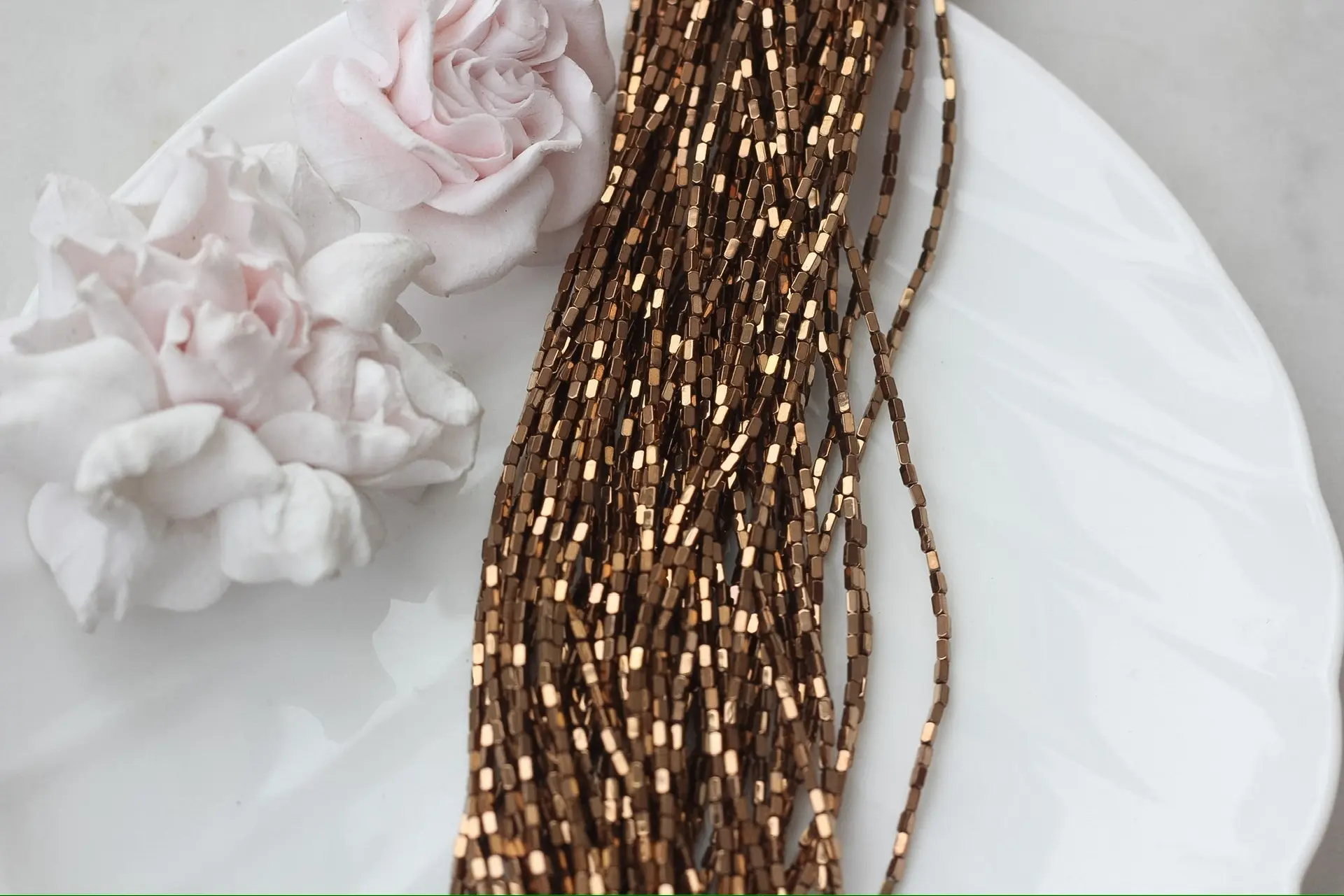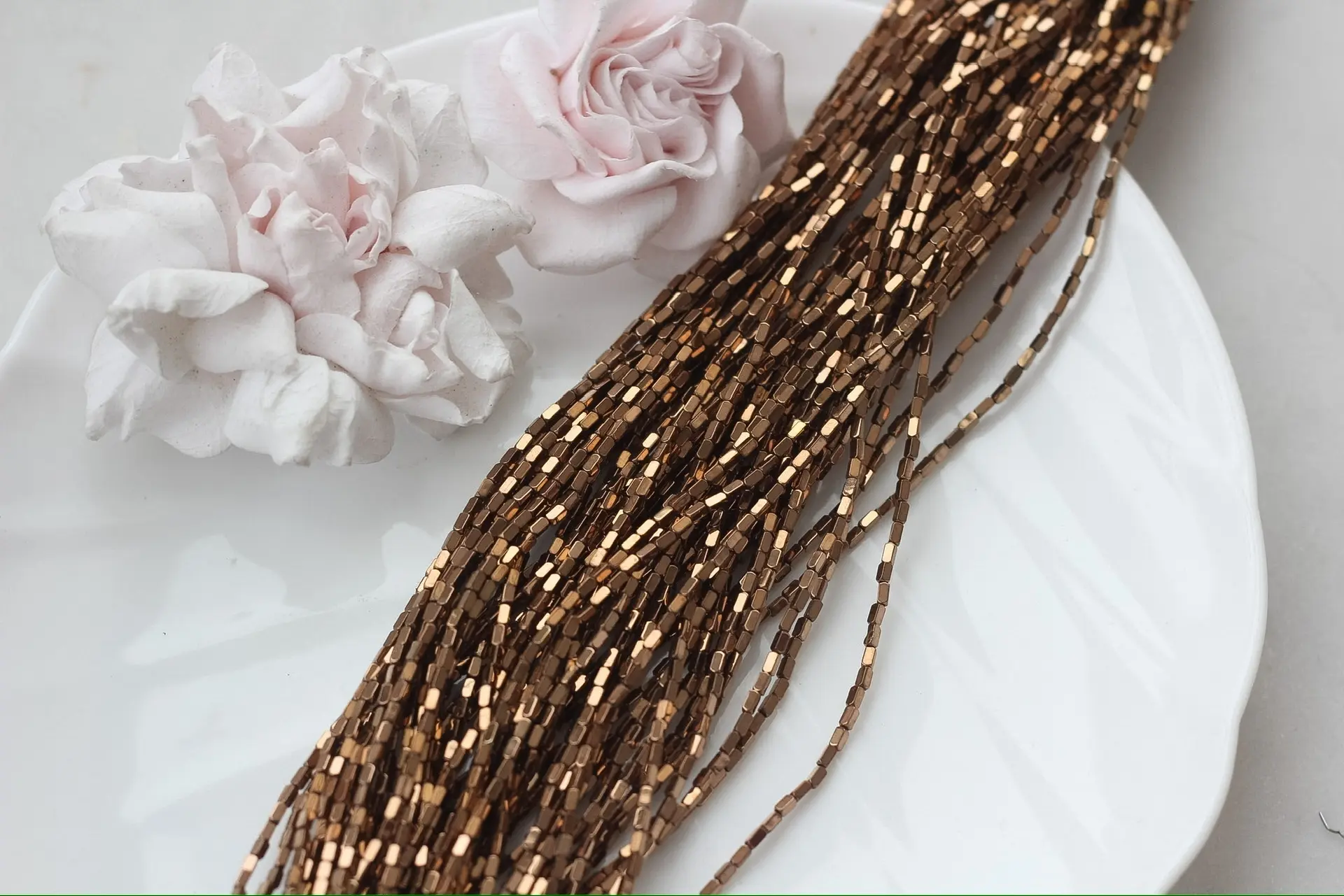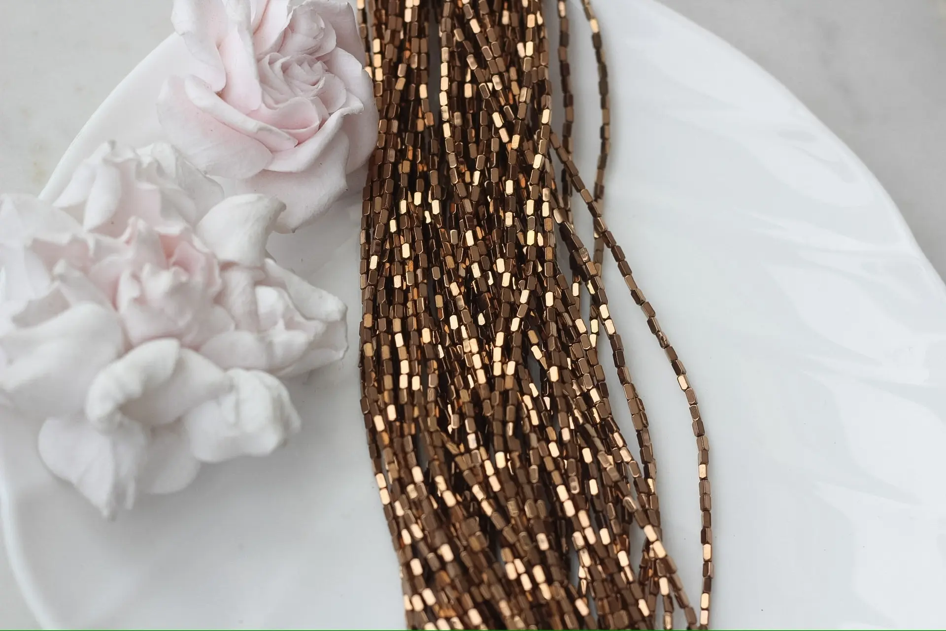 Миниатюрные бусины из синтетического гематита с прямоугольной формой и гладкой полировкой переливаются тёплым шоколадным блеском и эффектом дорогого металла. Их аккуратный размер идеально подходит для деликатных браслетов, колье, серёг или в качестве разделителей в сложных дизайнерских композициях.