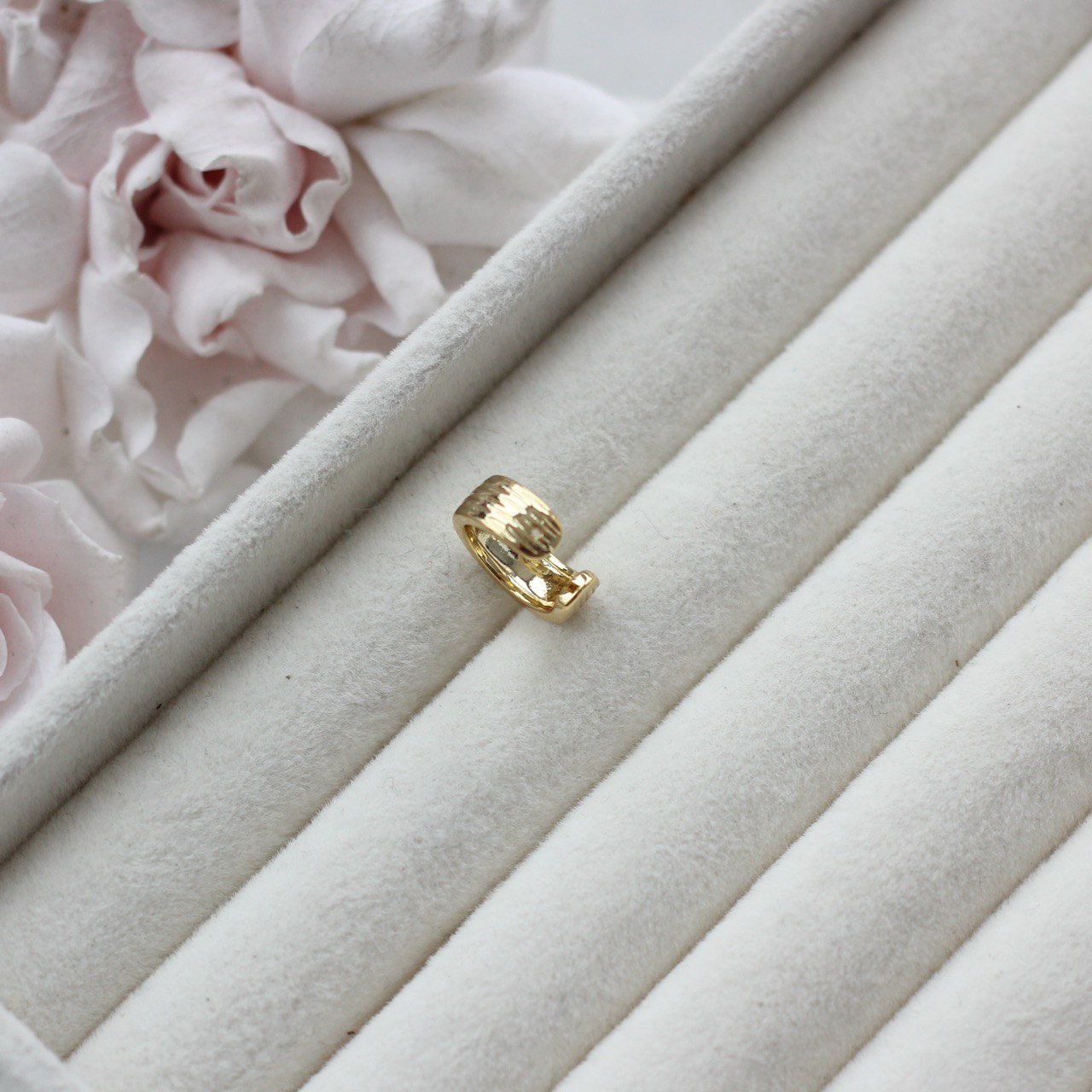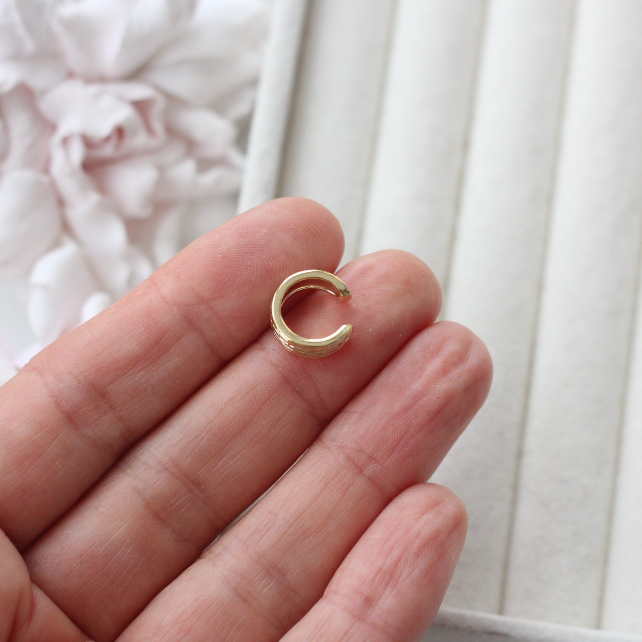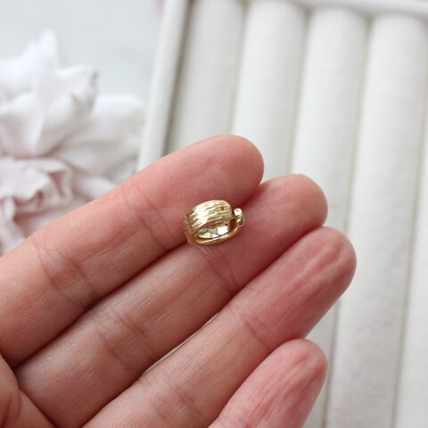 Минималистичный кафф с фактурной поверхностью — универсальная основа для создания современных украшений без прокола уха. Рельефный металл с мягкими продольными линиями создаёт эффект объёма и живого блеска, напоминая текстуру настоящего ювелирного изделия.