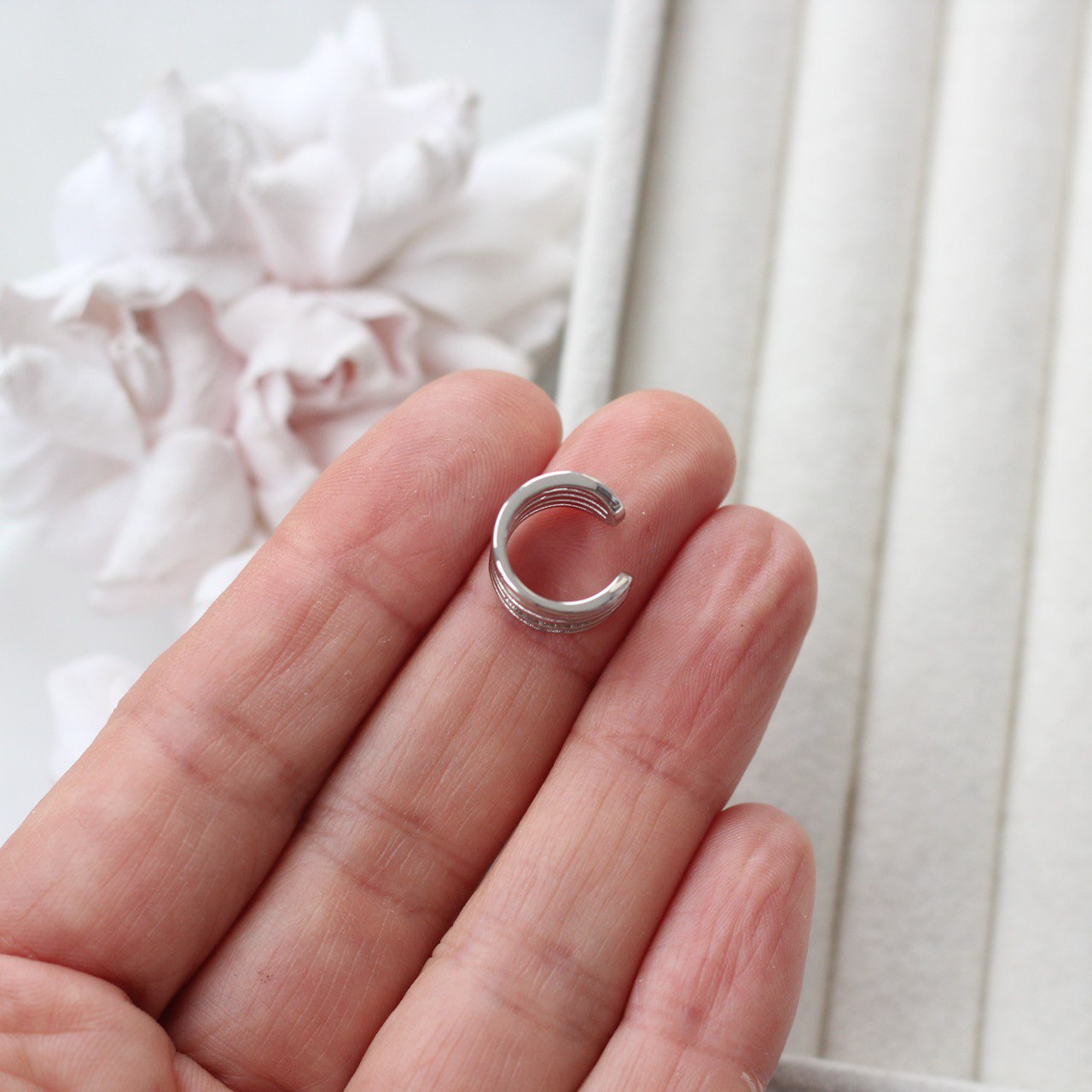 Кафф не требует прокола уха и легко фиксируется на хряще — идеальное решение для тех, кто хочет добавить образу трендовый акцент без дополнительных отверстий. Смотрится как самостоятельное украшение или в комбинации с классическими серьгами и пусетами.