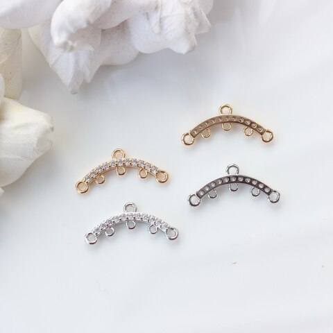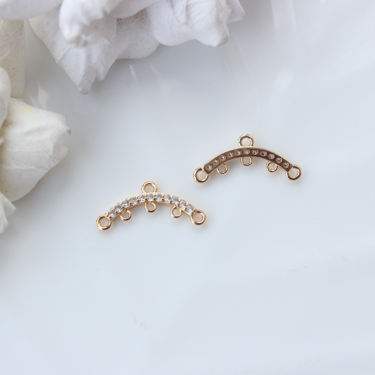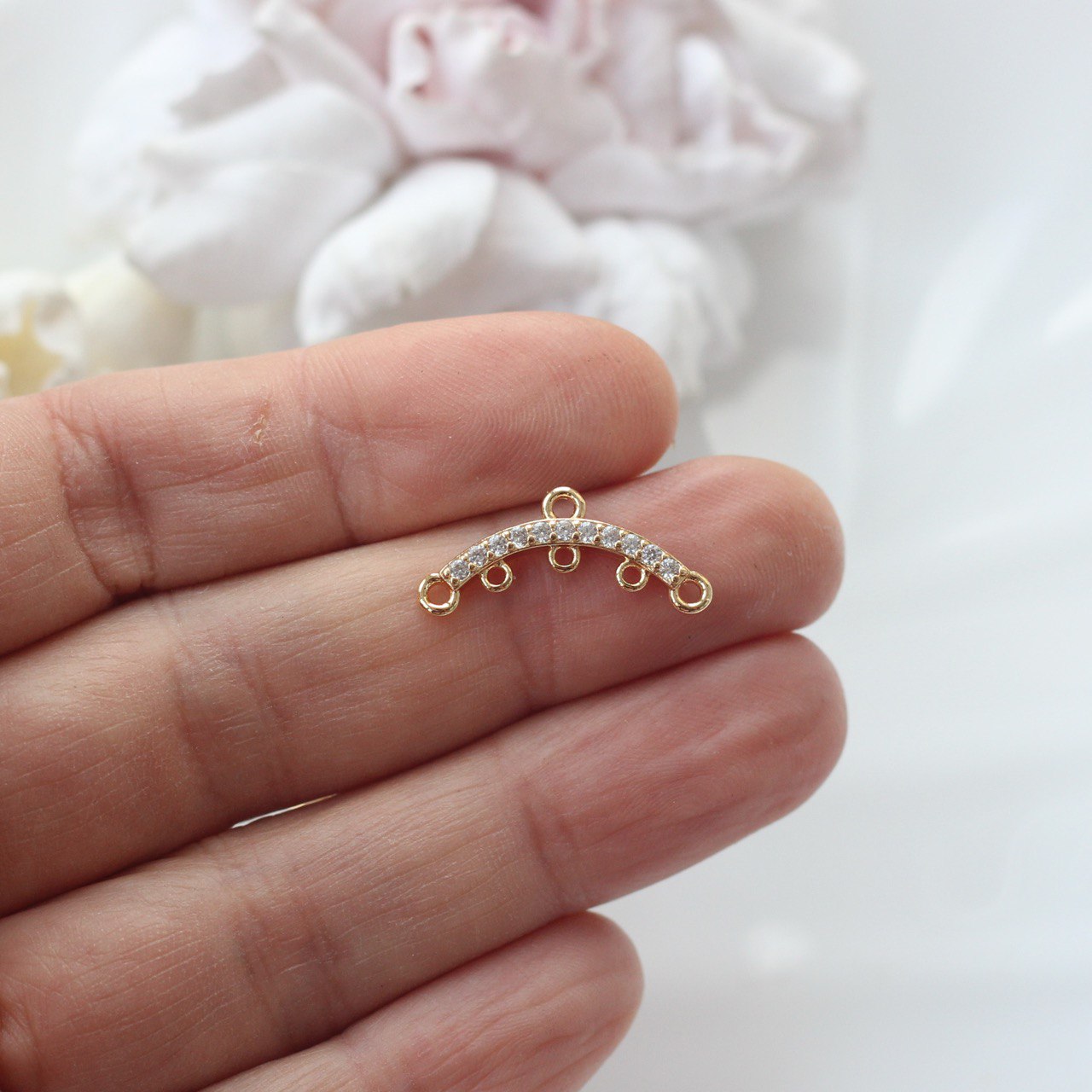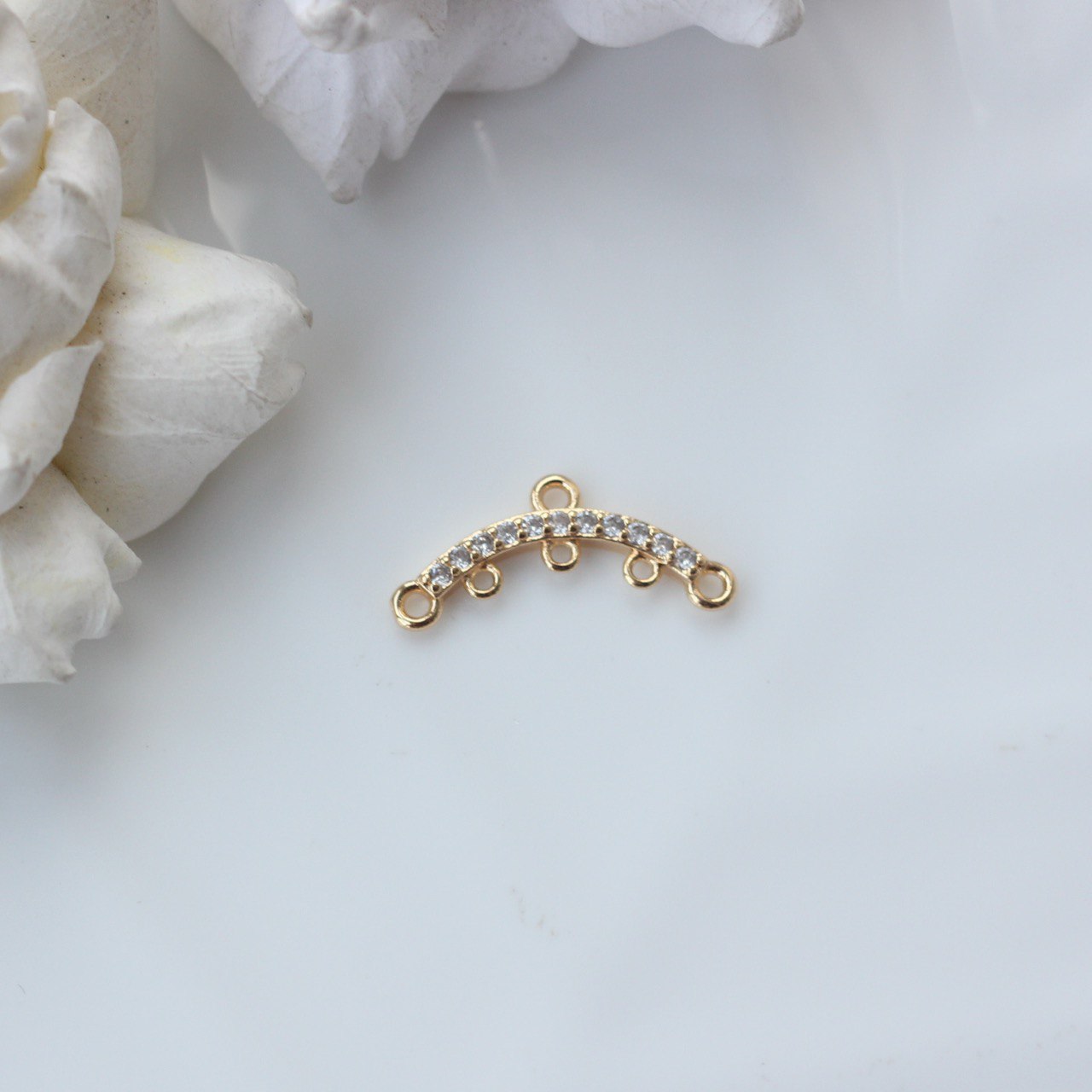 Изящный подвеска-коннектор дугообразной формы — универсальный элемент для создания многорядных колье и браслетов. Центральная линия декорирована сияющими фианитами, которые добавляют украшению лёгкий блеск и визуальный акцент, не утяжеляя композицию.