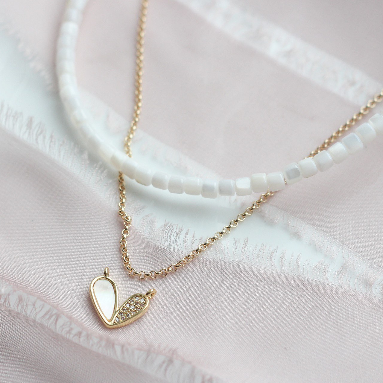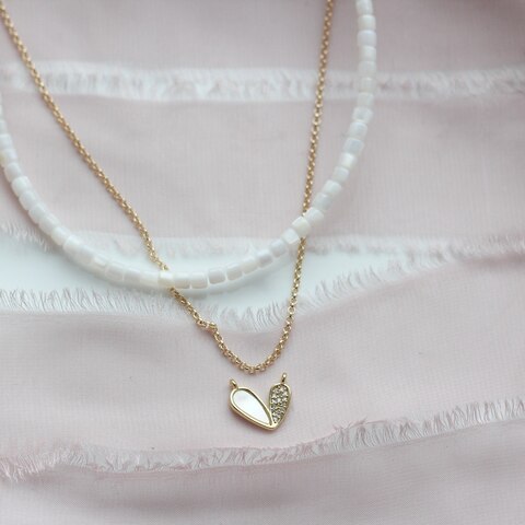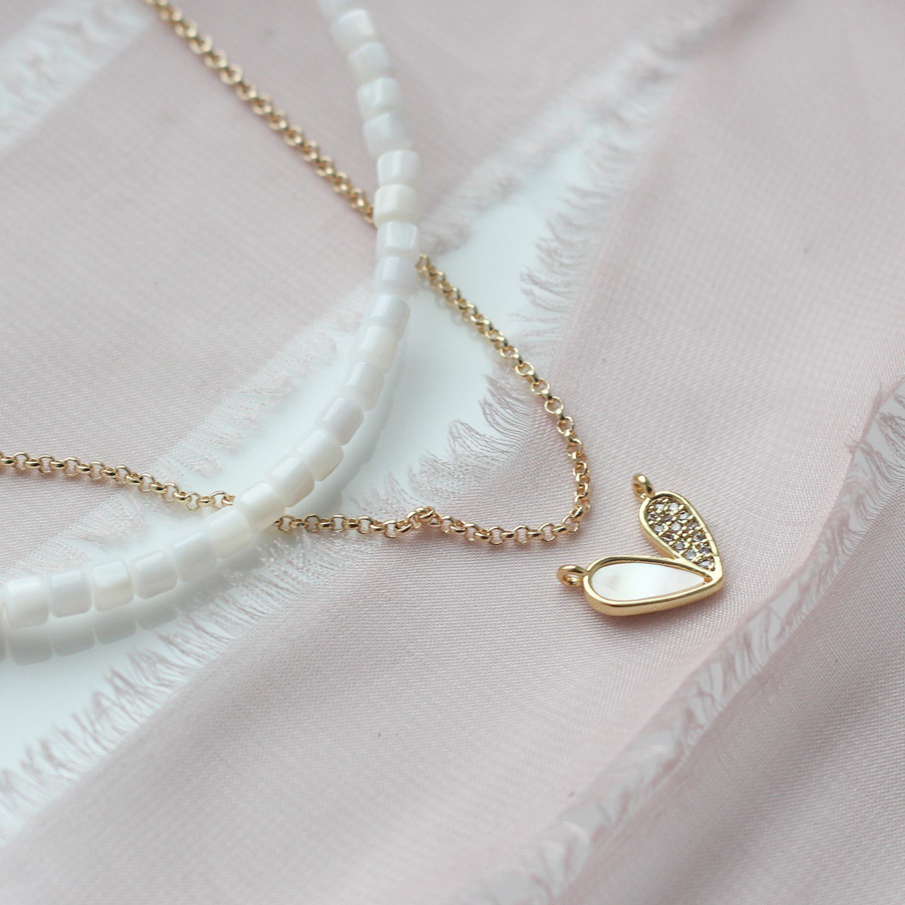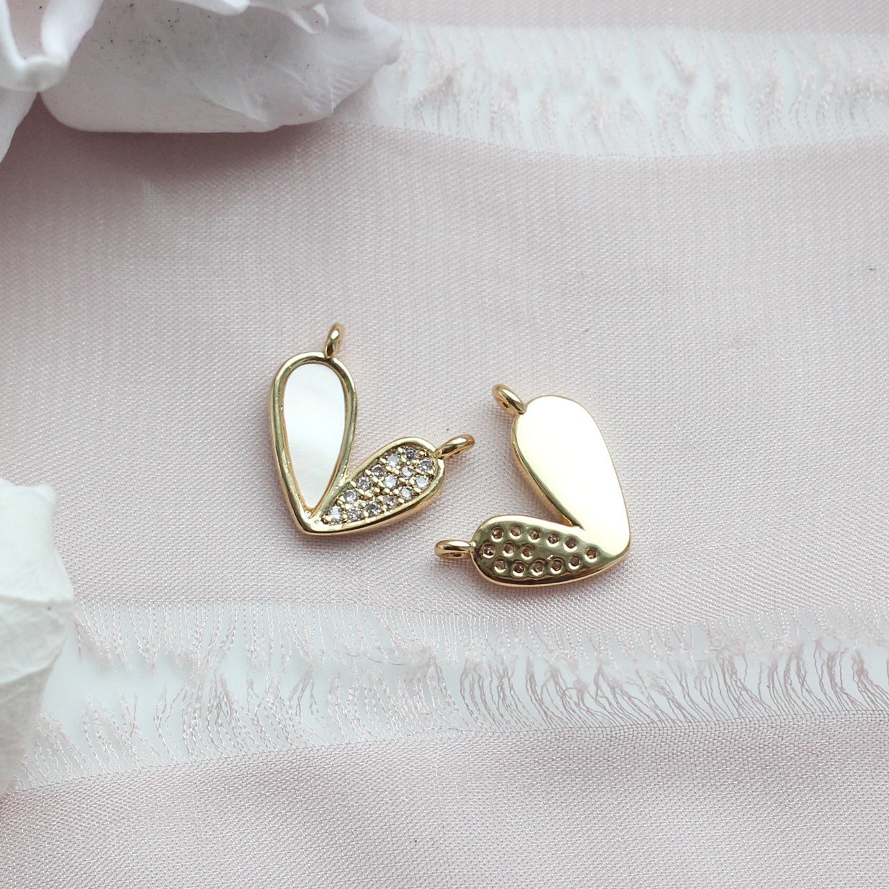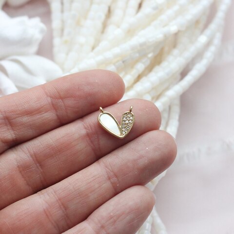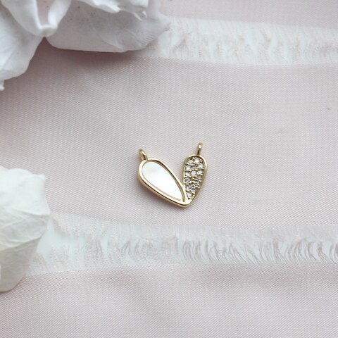 Коннектор с молочным перламутром и фианитами в форме сердца.