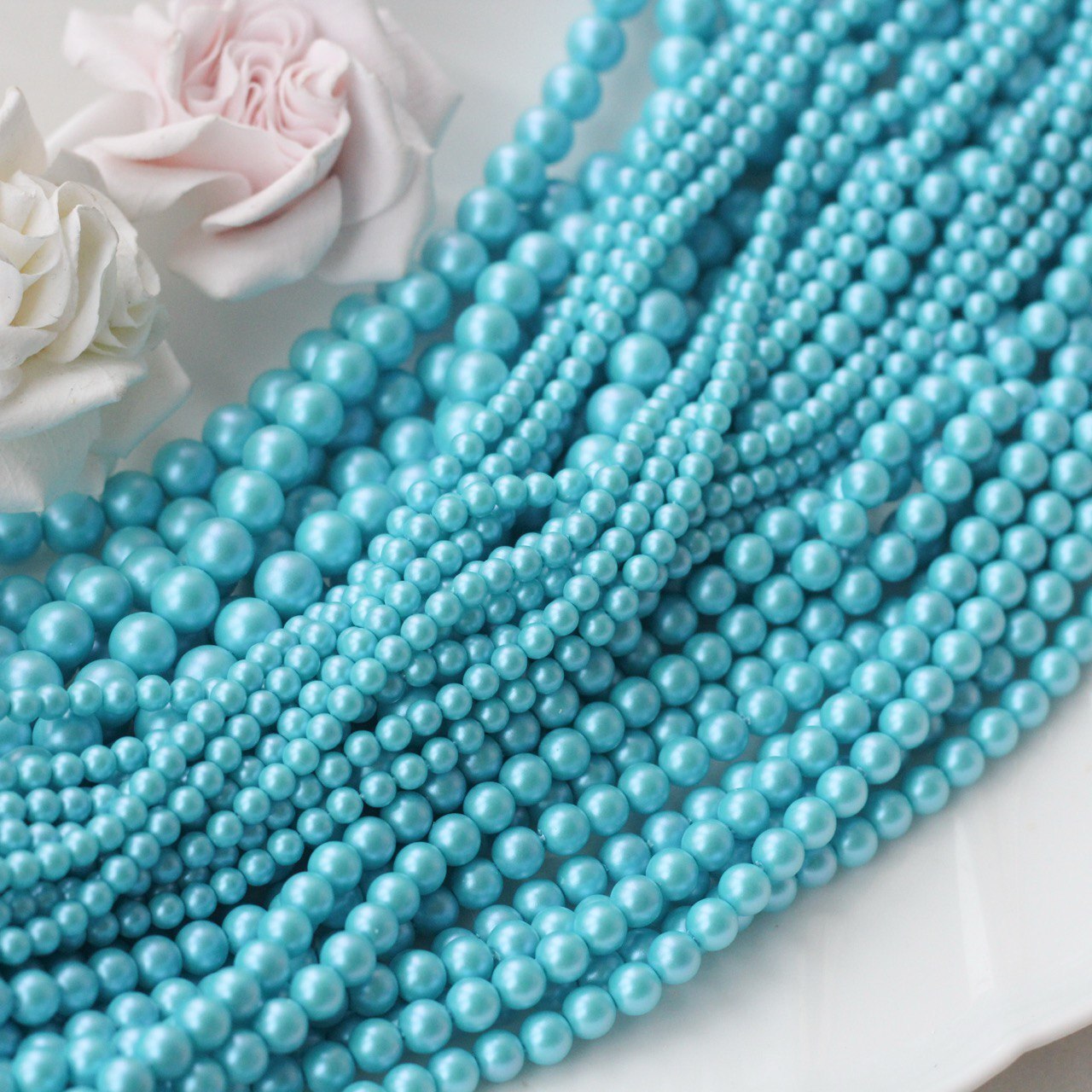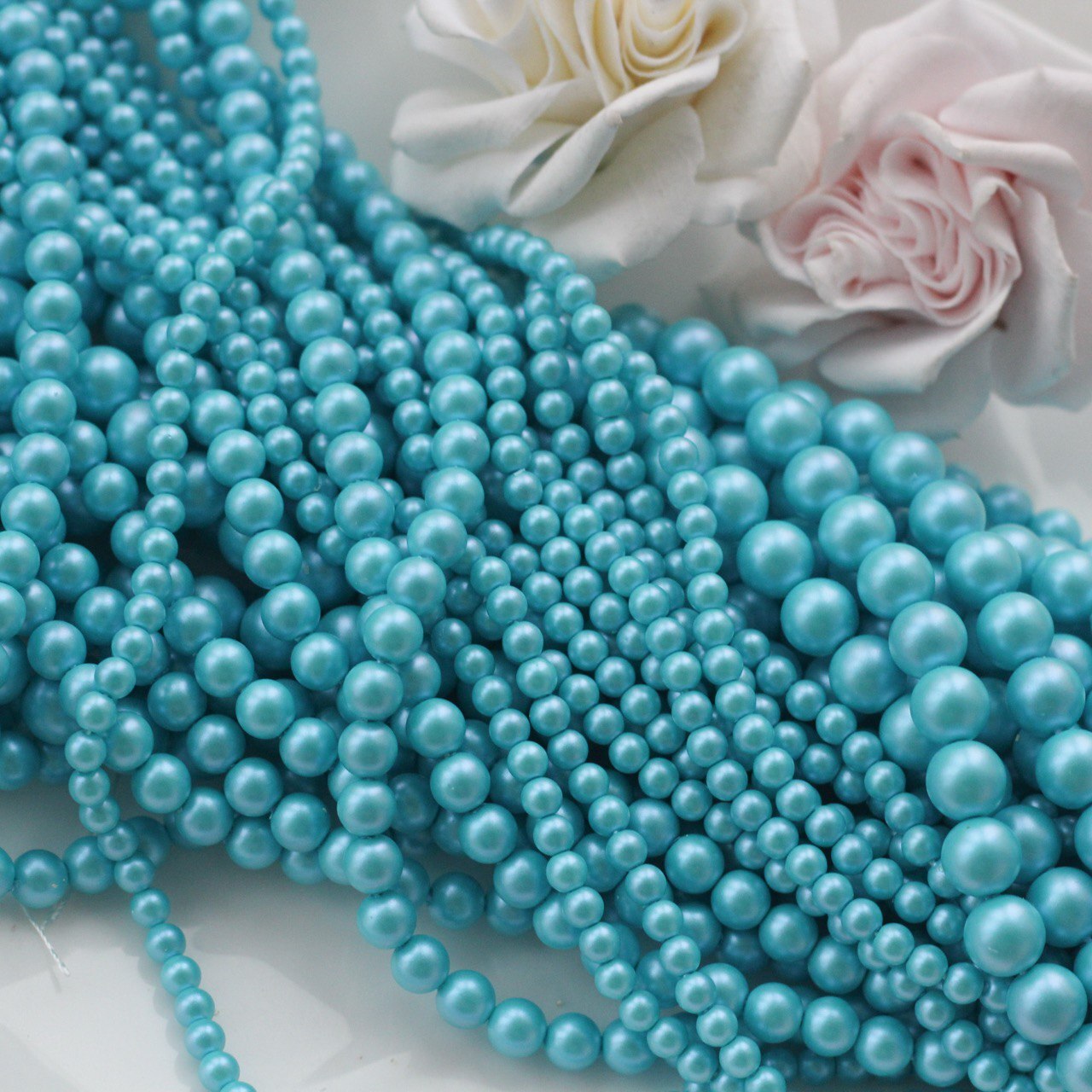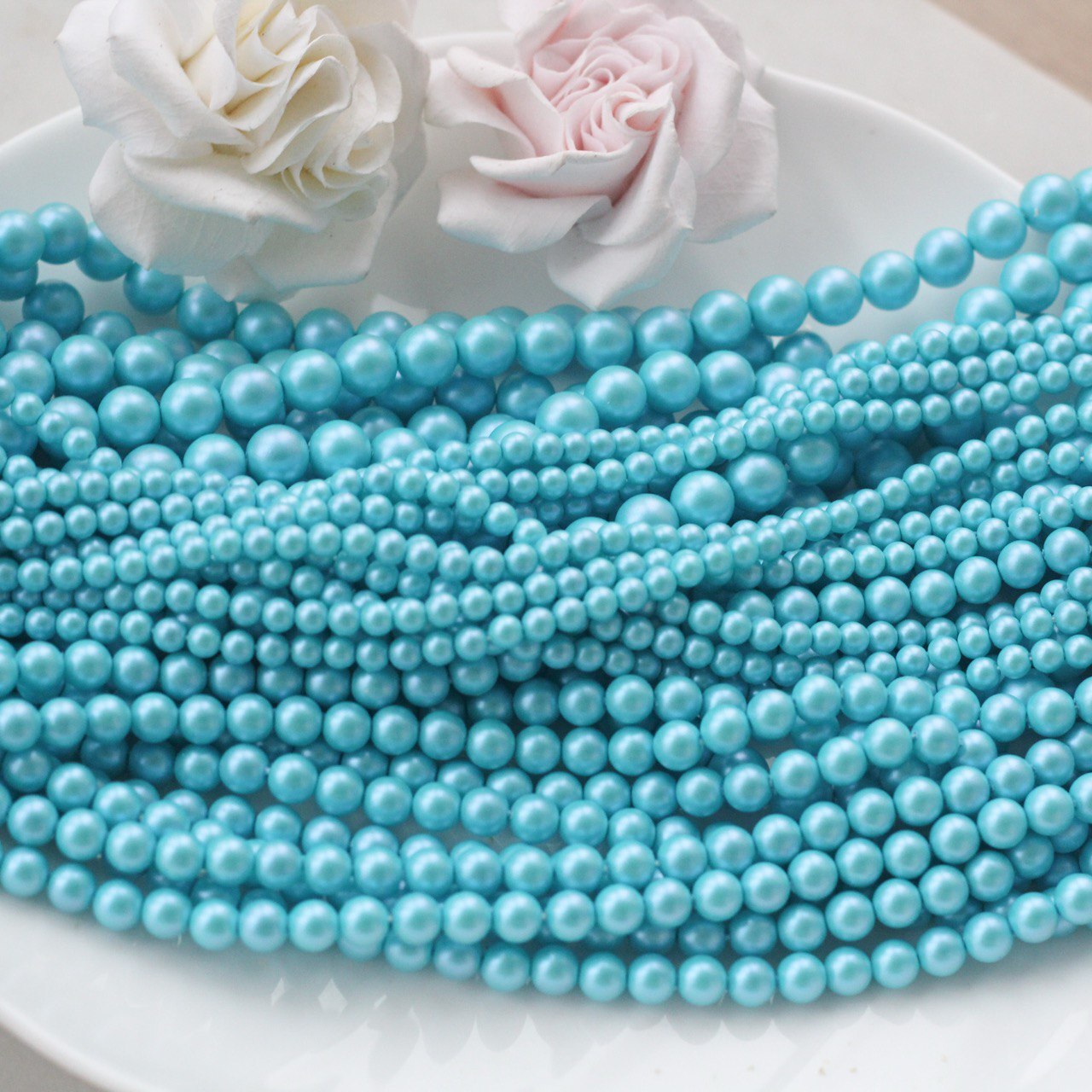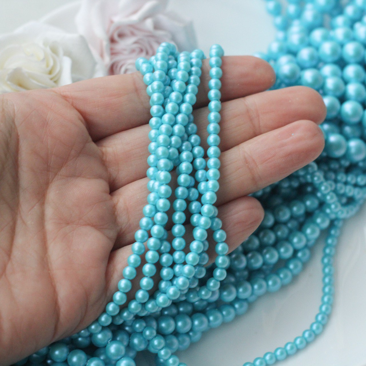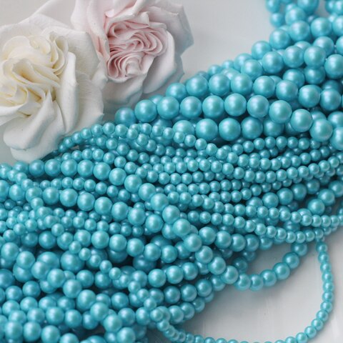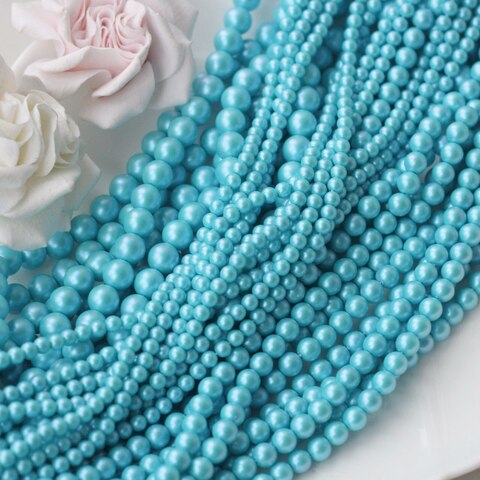Нежные и освежающие бусины в оттенке голубой бирюзы с деликатным перламутровым блеском. Цвет напоминает прозрачную морскую воду в солнечный день — лёгкий, чистый и воздушный. Гладкая полуматовая поверхность красиво отражает свет, создавая эффект настоящего жемчуга.