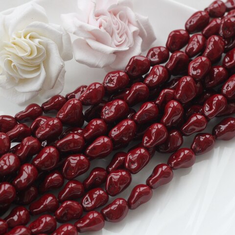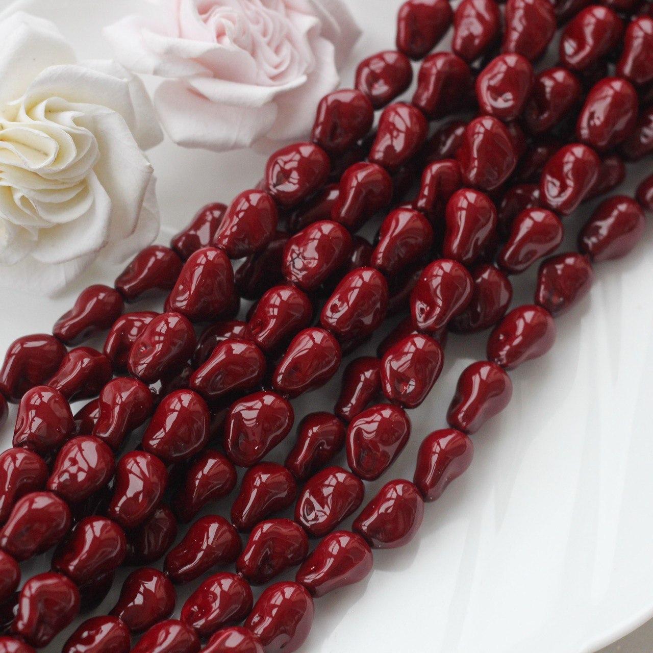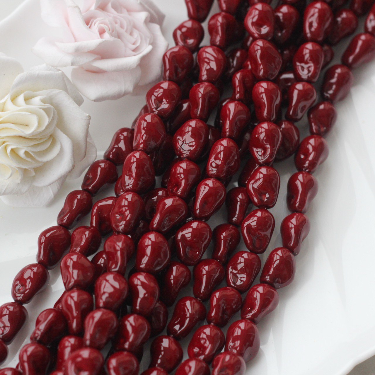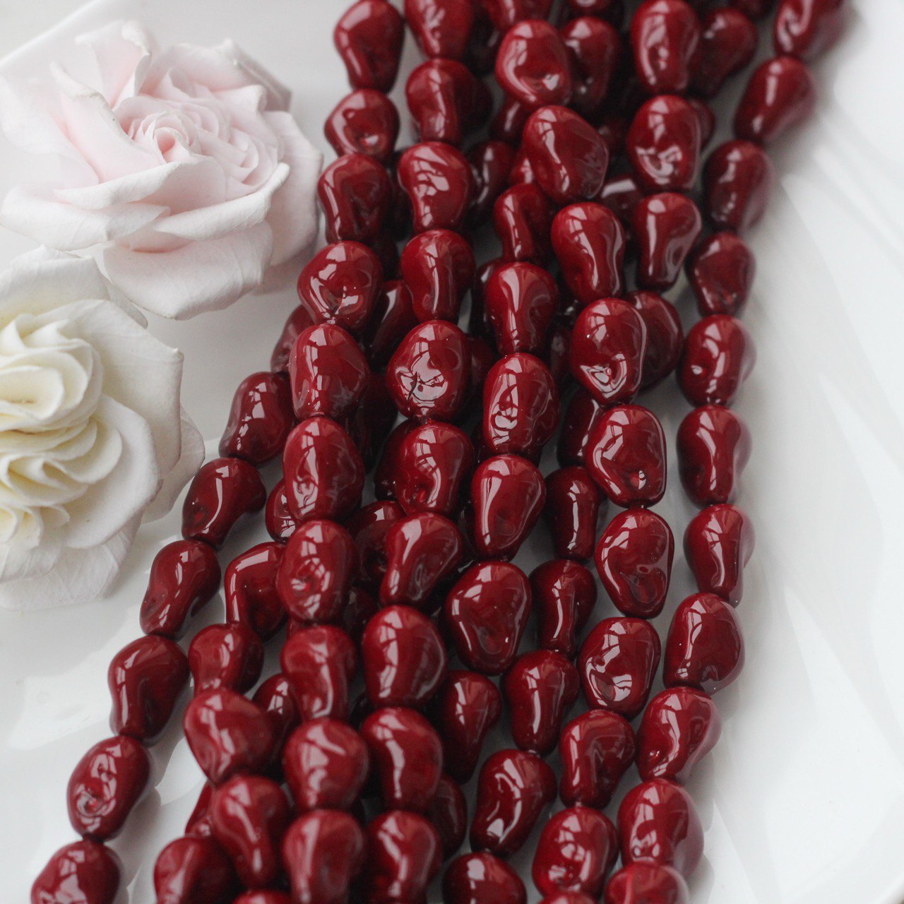 Барочные бусины глубокого тёмно-бордового оттенка придают украшениям особую насыщенность и выразительность. Цвет напоминает спелую вишню или тёмное вино, добавляя композициям благородства и драматичности. Глянцевая поверхность отражает свет, создавая эффект объёма и лёгкого сияния.