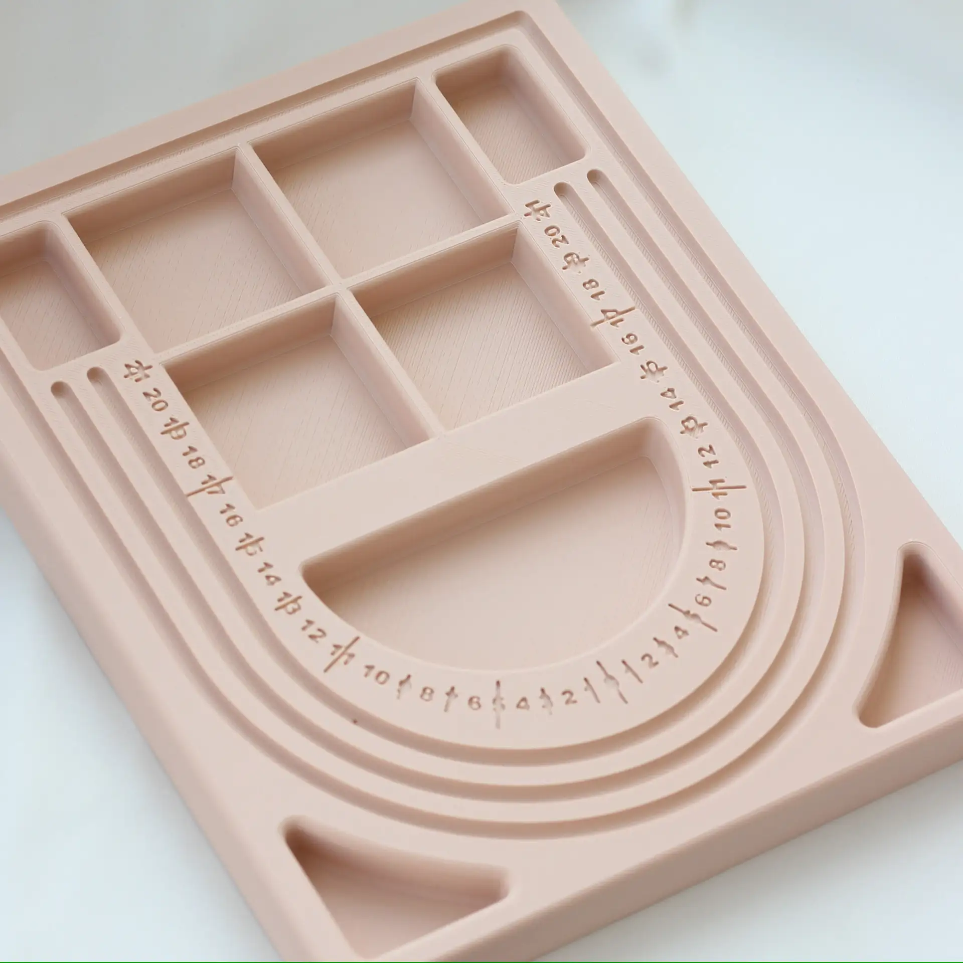 Специальная разметка с делениями помогает точно выставить длину колье, а углубления шириной всего 5 мм, надёжно фиксируют небольшие бусины, фурнитуру и камни, предотвращая их скатывание.