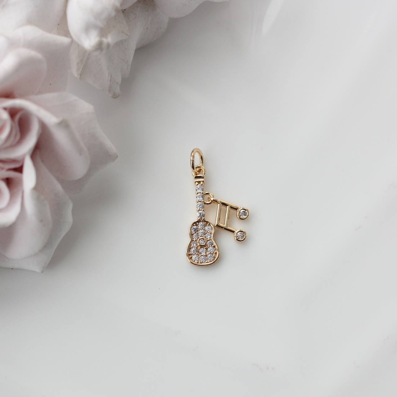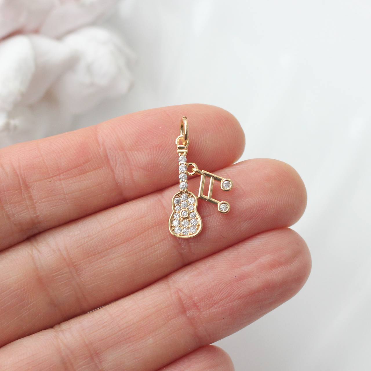 Эффектная подвеска в виде гитары с музыкальными нотами — выразительный акцент для украшений с характером. Мерцающие фианиты добавляют блеск и делают форму более объёмной и «живой», красиво отражая свет при движении.