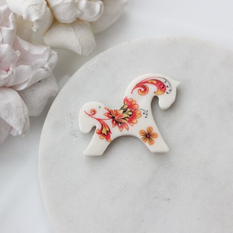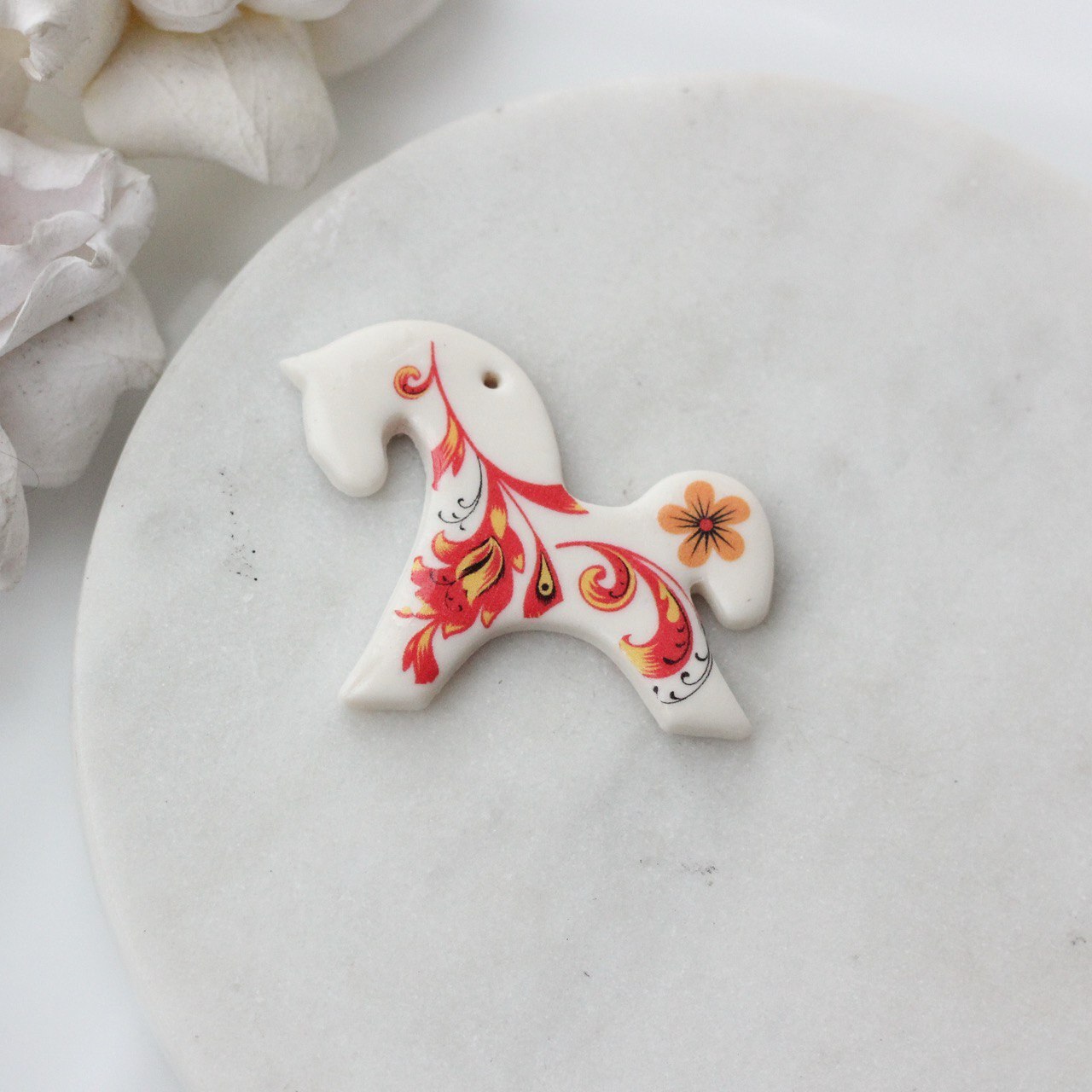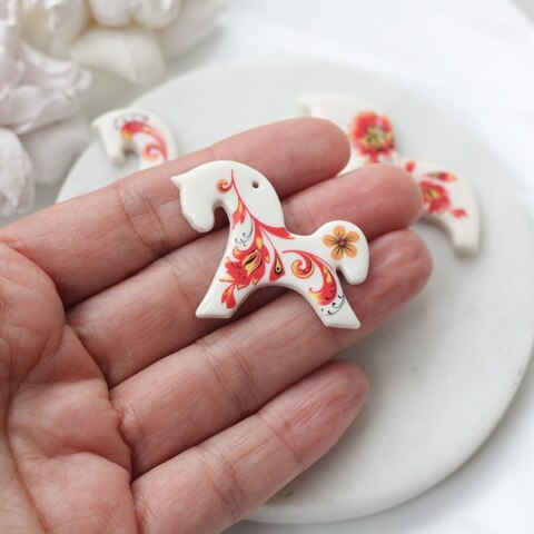 Подвеска выполнена из полимерной глины и создаётся вручную. Обе стороны украшены росписью в стиле хохлома. Рисунок и его расположение рандомные, поэтому каждая лошадка имеет свой характер и индивидуальный узор.