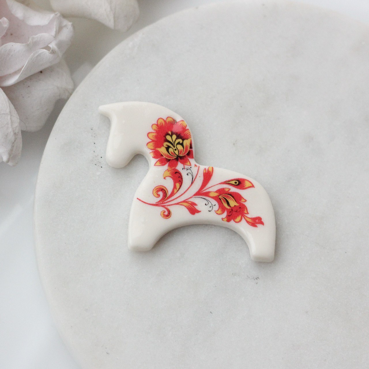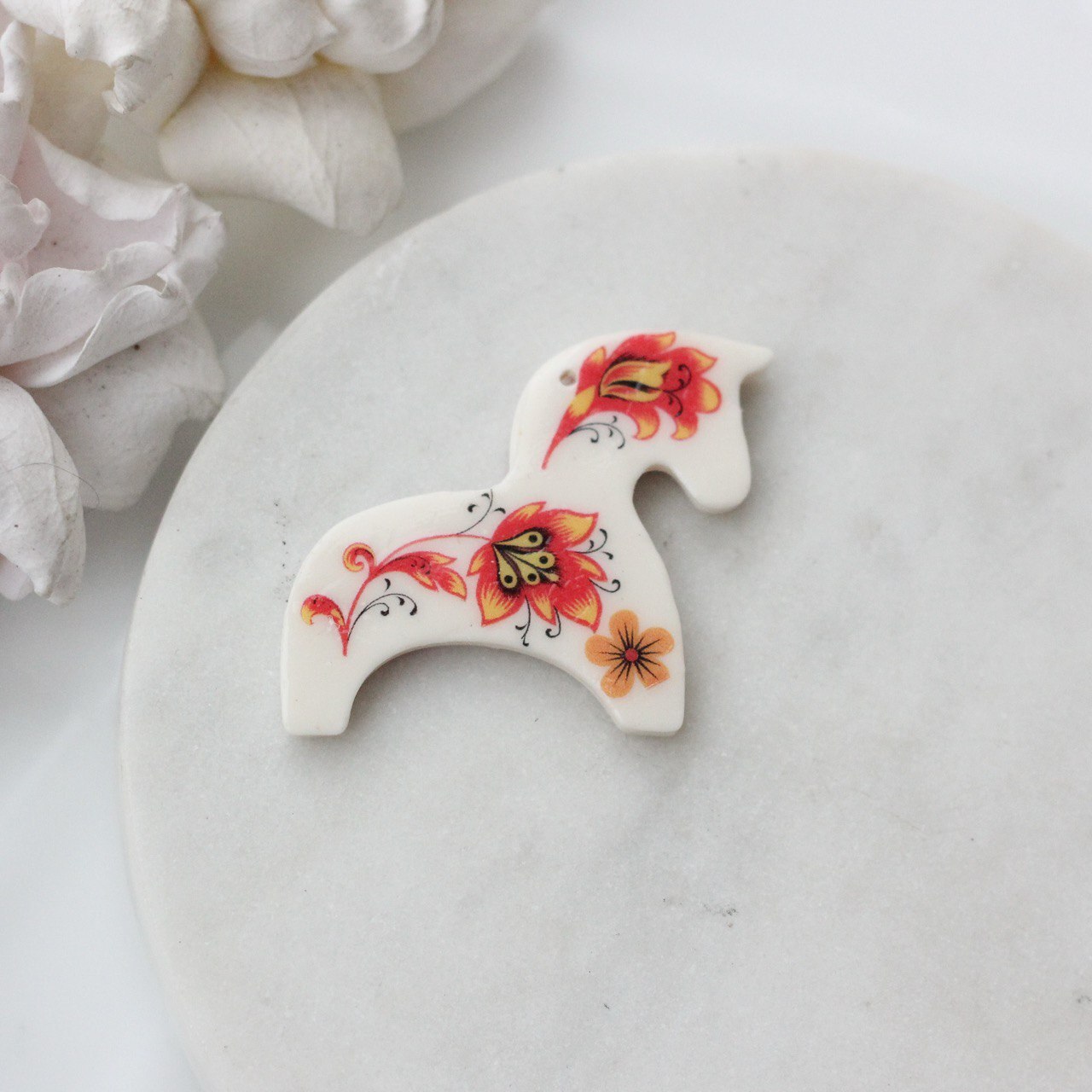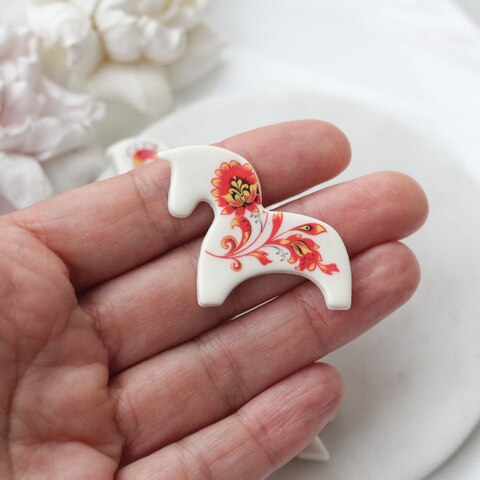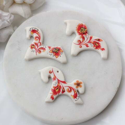 Подвеска выполнена из полимерной глины и создаётся вручную. Обе стороны украшены росписью в стиле хохлома. Рисунок и его расположение рандомные, поэтому каждая лошадка имеет свой характер и индивидуальный узор.