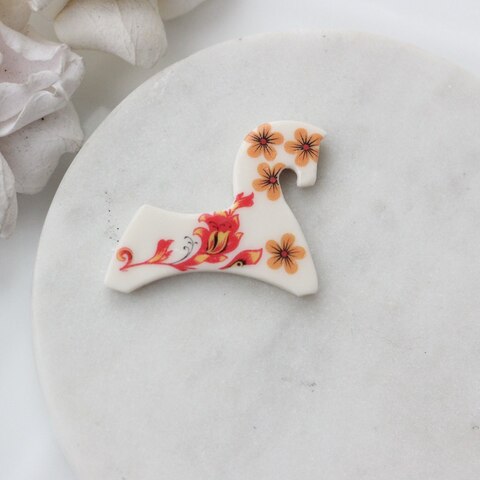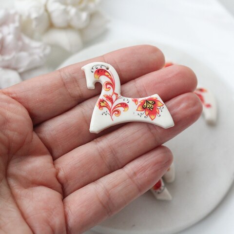 Подвеска выполнена из полимерной глины и создаётся вручную. Обе стороны украшены росписью в стиле хохлома. Рисунок и его расположение рандомные, поэтому каждая лошадка имеет свой характер и индивидуальный узор.