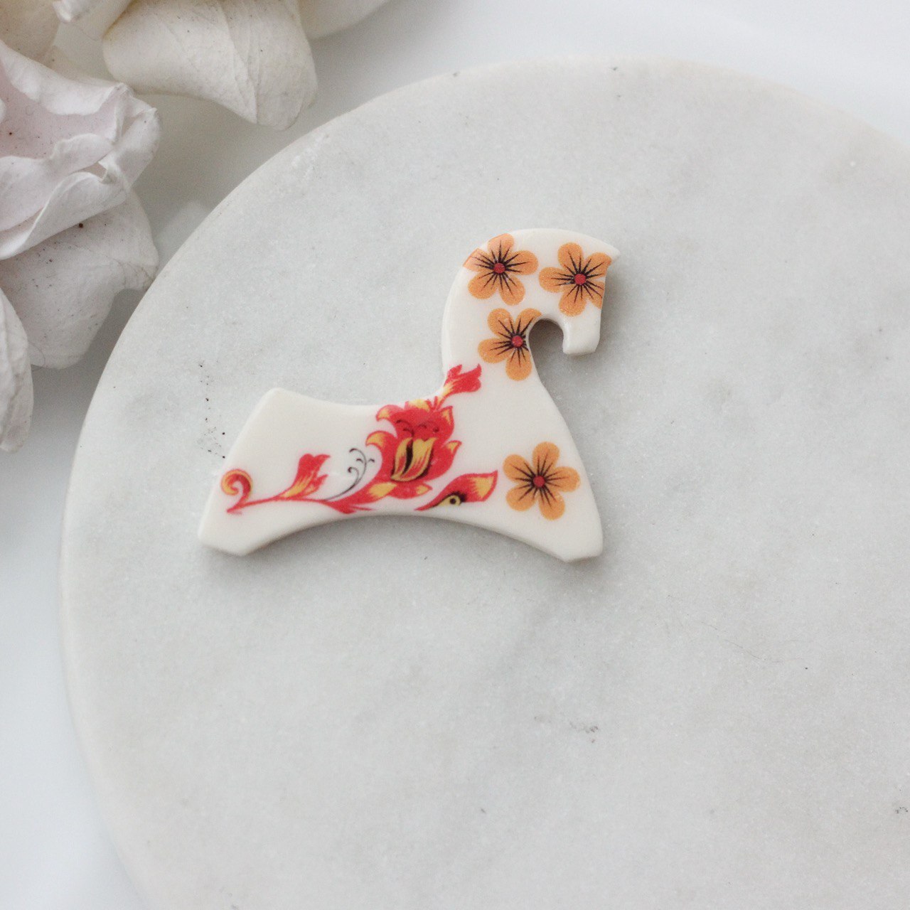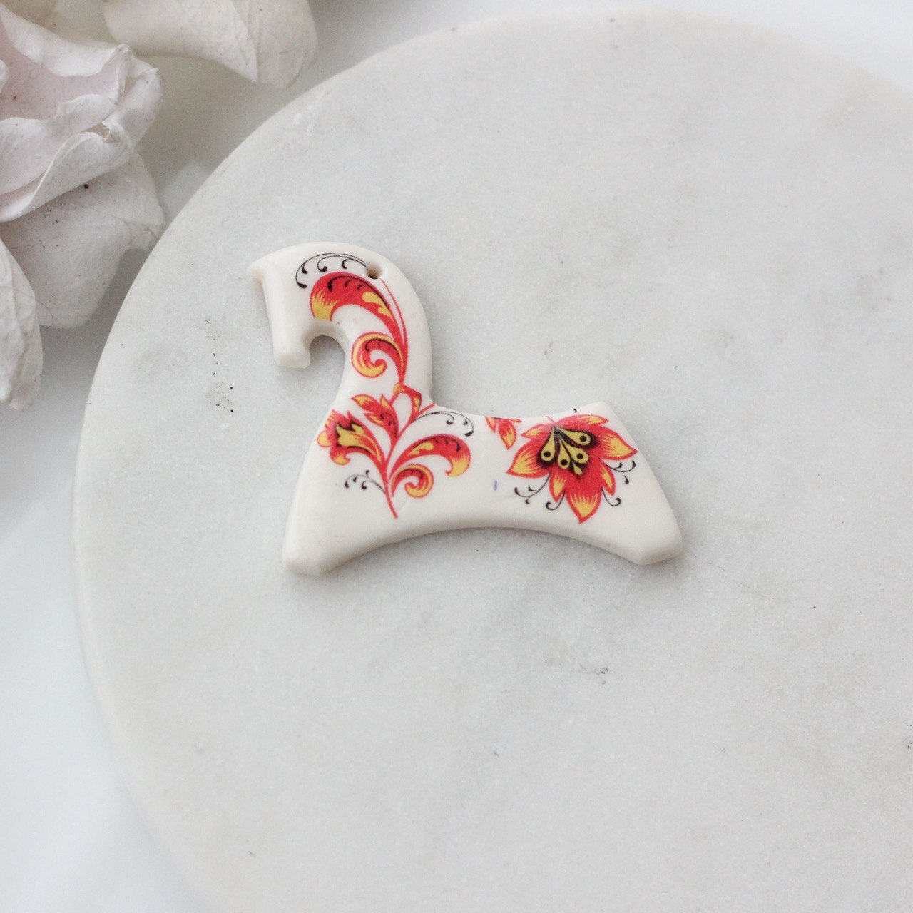 Декоративная подвеска в форме лошадки с росписью под хохлому — образ, наполненный движением, силой и народной символикой. Подойдёт для авторских украшений, тематических коллекций и изделий с этническим характером.