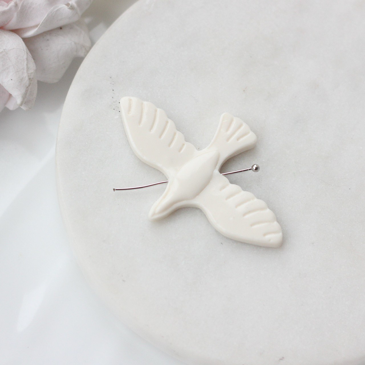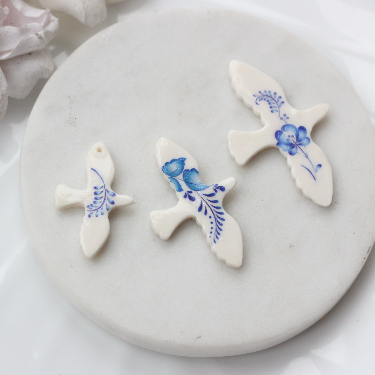 Минималистичная подвеска в форме птицы-голубя — символ мира, свободы и лёгкости. Изделие выполнено из полимерной глины вручную. Одна сторона с аккуратно проработанным рельефом крыльев, вторая гладкая с росписью под гжель и мягкими, плавными линиями силуэта.
