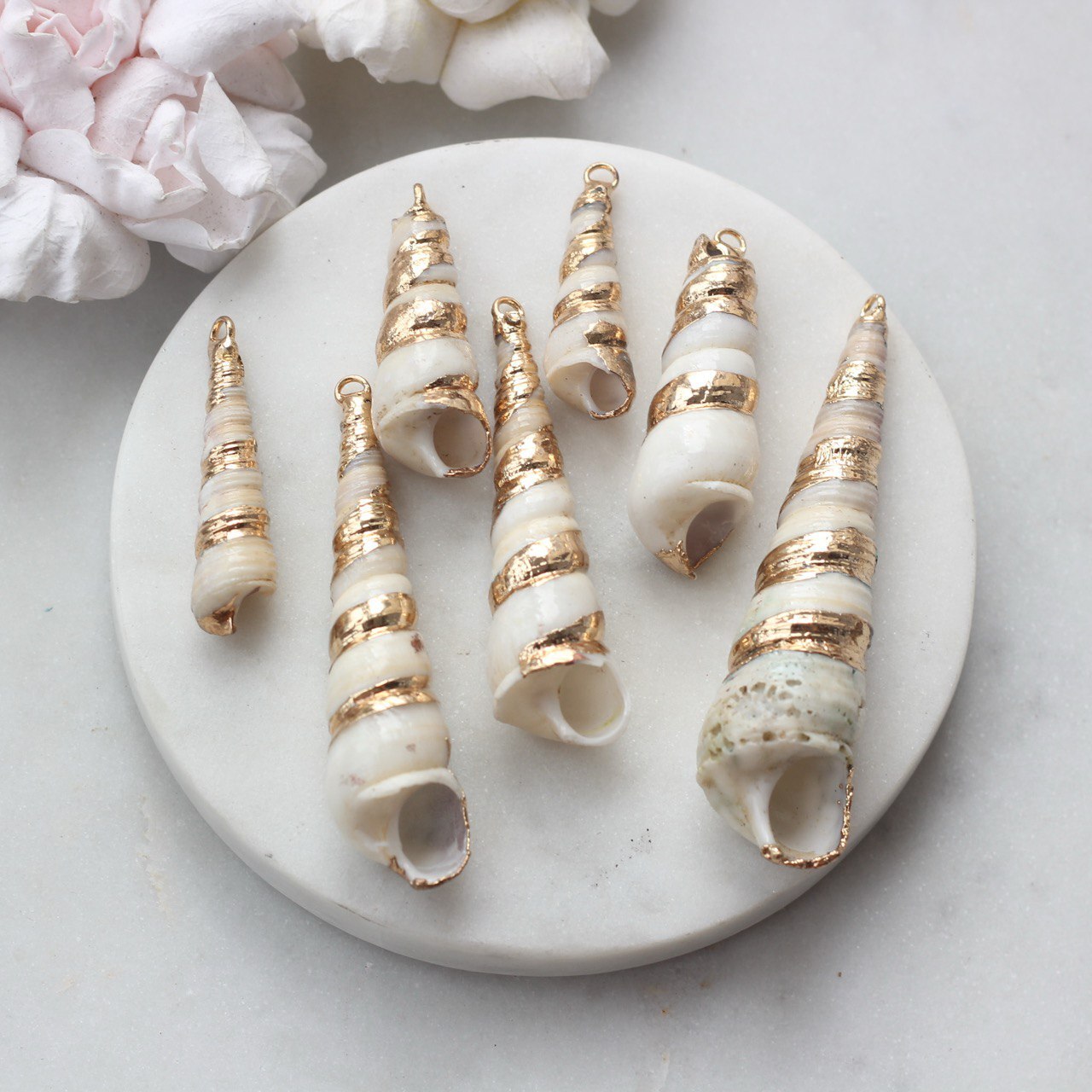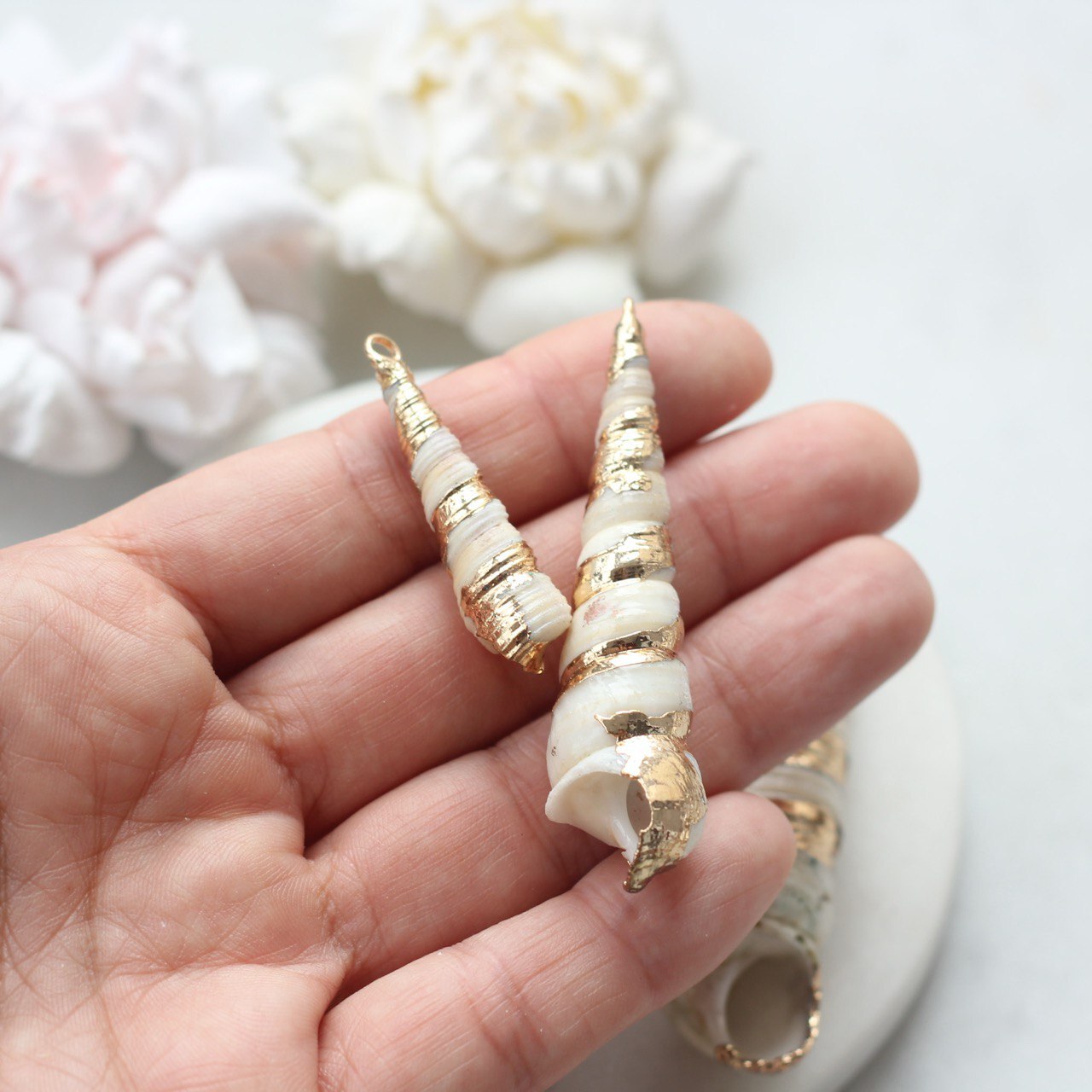 Натуральная ракушка вытянутой спиральной формы, напоминающая изящный морской колокольчик, украшена тонкими золотистыми акцентами, которые подчёркивают плавные линии витков. Молочно-белая поверхность ракушки с лёгким перламутровым блеском создает ощущение свежести и морского бриза. Золотистое покрытие добавляет подвеске утончённости и делает её универсальной для украшений в стиле бохо или морской тематики.