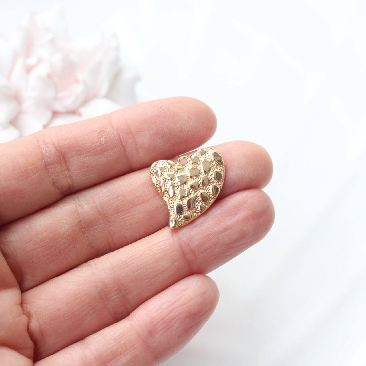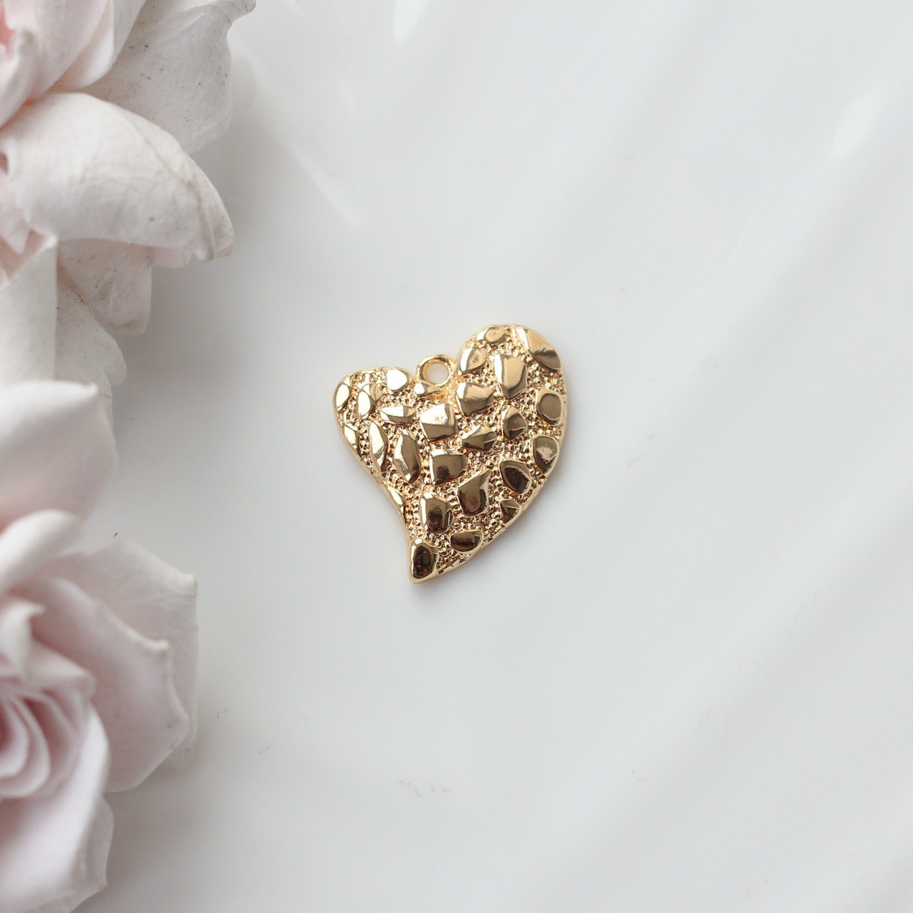 Металлическая подвеска в форме сердца с выразительной рельефной текстурой. Фактура сочетает гладкие и зернистые участки, создавая интересную игру света и ощущение объёма. Поверхность напоминает органичную, «живую» структуру — украшение выглядит эффектно и небанально.