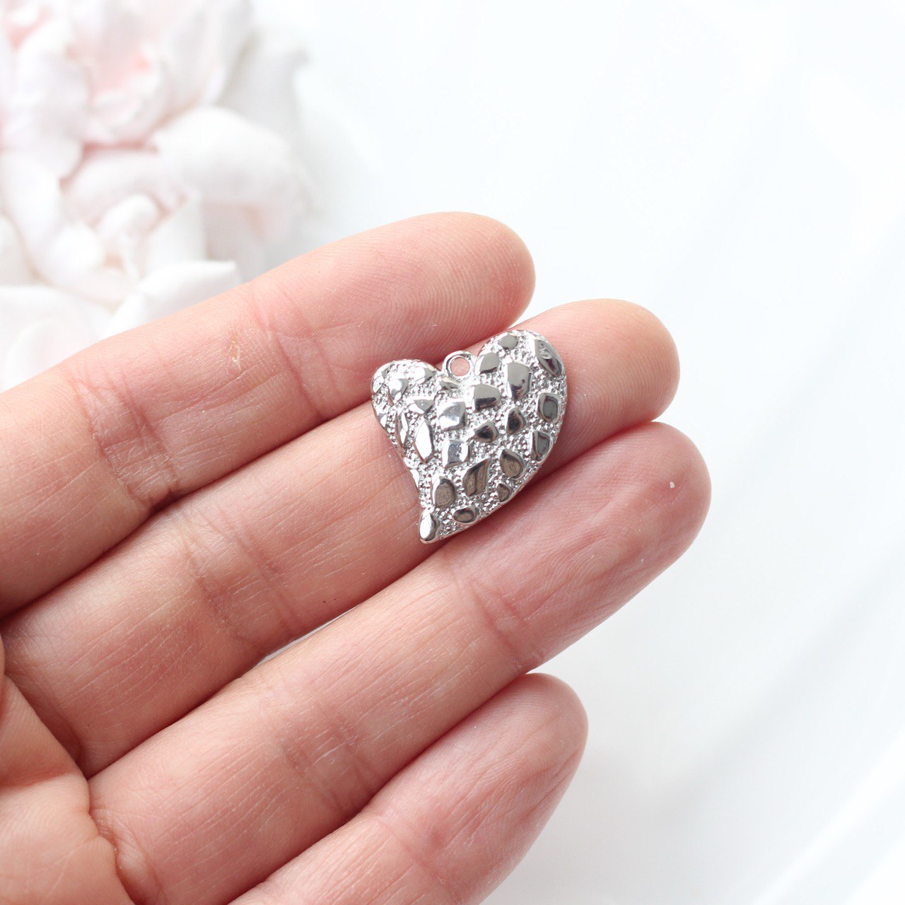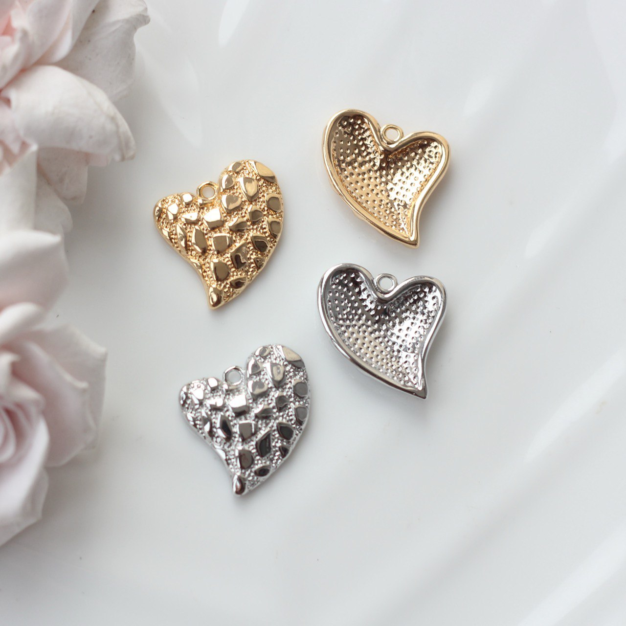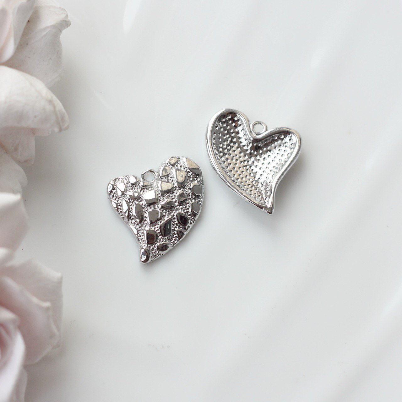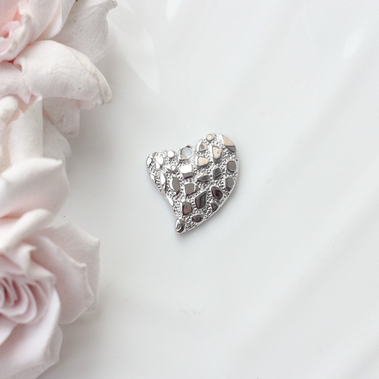Металлическая подвеска в форме сердца с выразительной рельефной текстурой. Фактура сочетает гладкие и зернистые участки, создавая интересную игру света и ощущение объёма. Поверхность напоминает органичную, «живую» структуру — украшение выглядит эффектно и небанально.