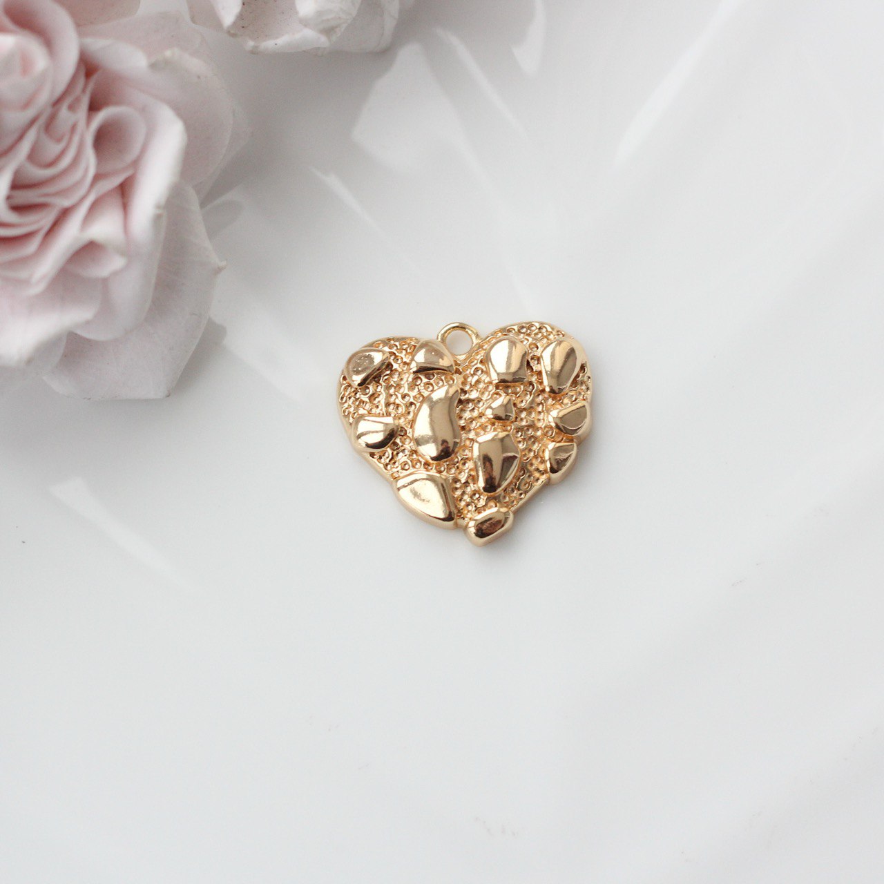 Металлическая подвеска в форме сердца с выразительной рельефной текстурой. Фактура сочетает гладкие и зернистые участки, создавая интересную игру света и ощущение объёма. Поверхность напоминает органичную, «живую» структуру — украшение выглядит эффектно и небанально.