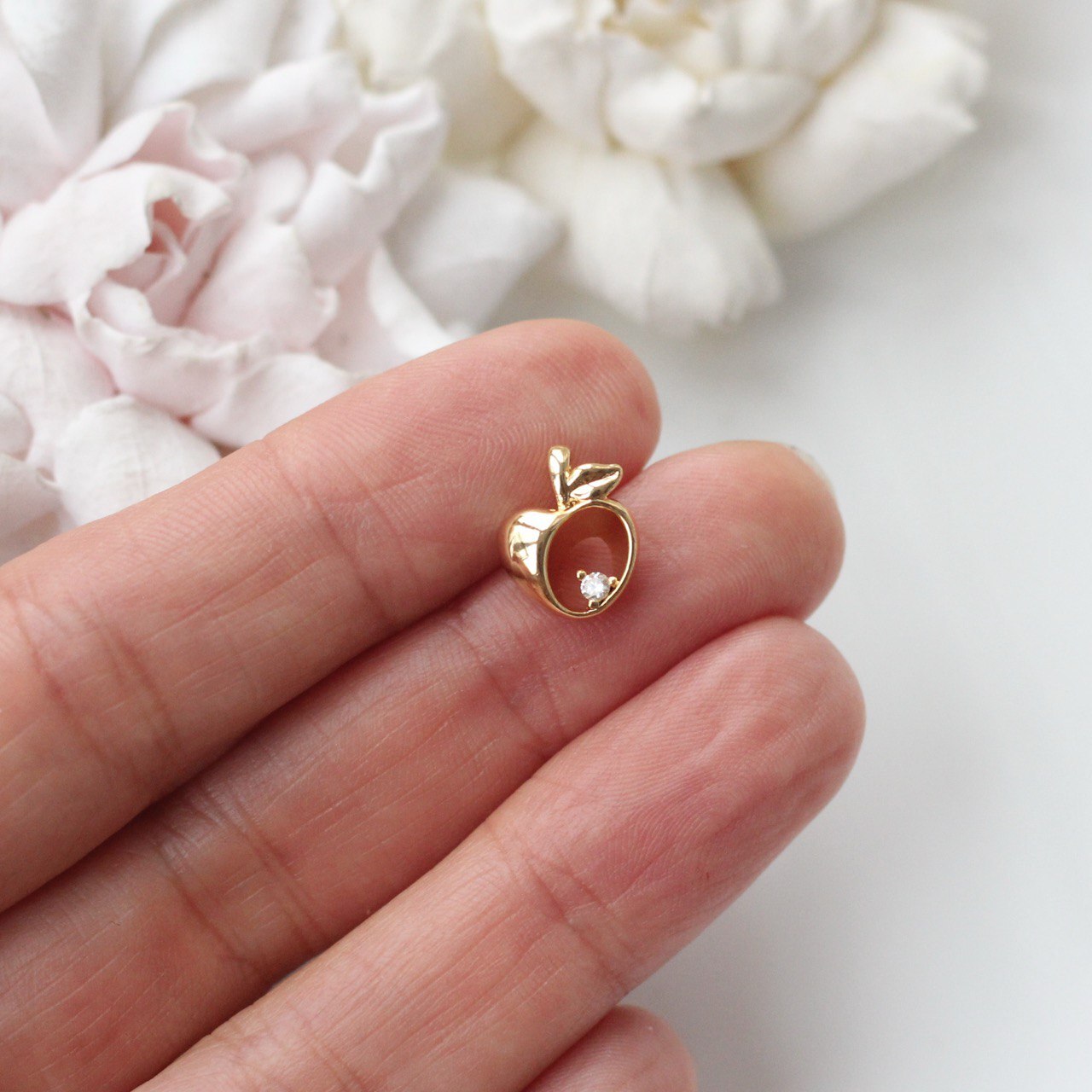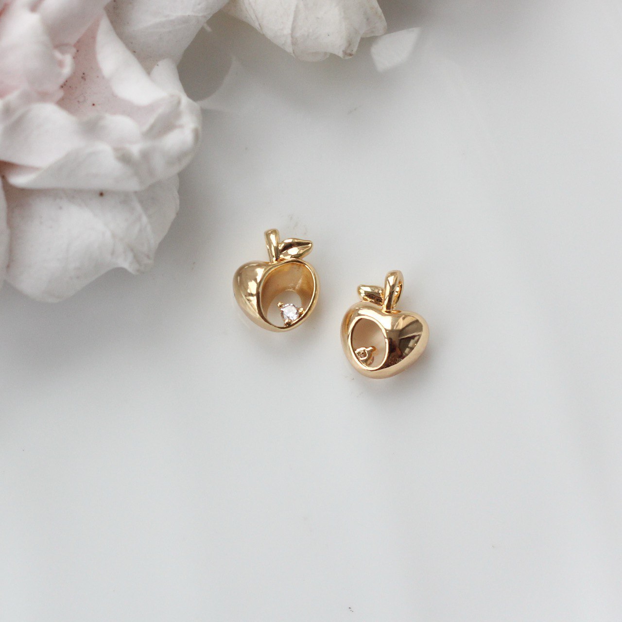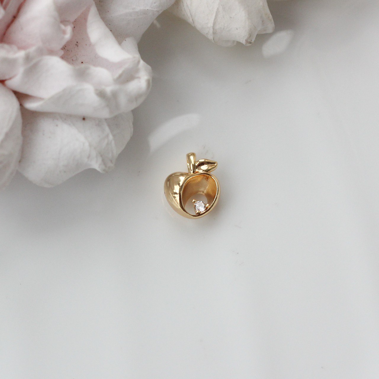 Миниатюрная подвеска в форме яблока — гладкая, блестящая, с аккуратным фианитом внутри, который красиво ловит свет. Лаконичный дизайн делает её универсальной: она станет нежным соло-акцентом или частью композиции в комплекте с бусинами и цепочками.