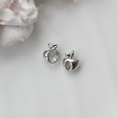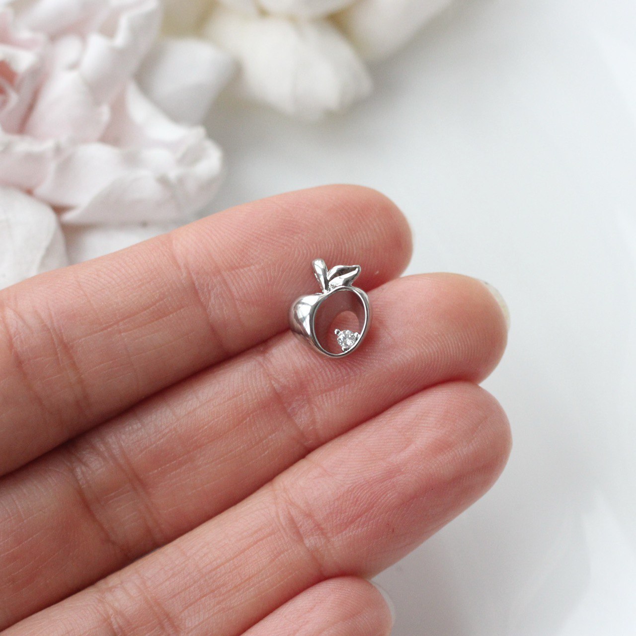 Миниатюрная подвеска в форме яблока — гладкая, блестящая, с аккуратным фианитом внутри, который красиво ловит свет. Лаконичный дизайн делает её универсальной: она станет нежным соло-акцентом или частью композиции в комплекте с бусинами и цепочками.