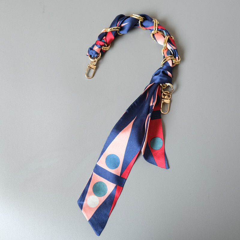 Эта декоративная ручка выполнена из золотистой металлической цепи, аккуратно переплетённой с атласным платком с графичным принтом. Длина — 30–32 см, удобна для ношения на сгибе локтя или в руке. Оснащена карабинами по краям для быстрой замены.