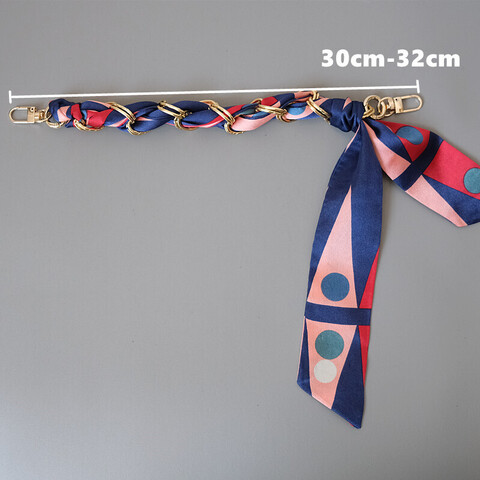 Эта декоративная ручка выполнена из золотистой металлической цепи, аккуратно переплетённой с атласным платком с графичным принтом. Длина — 30–32 см, удобна для ношения на сгибе локтя или в руке. Оснащена карабинами по краям для быстрой замены.