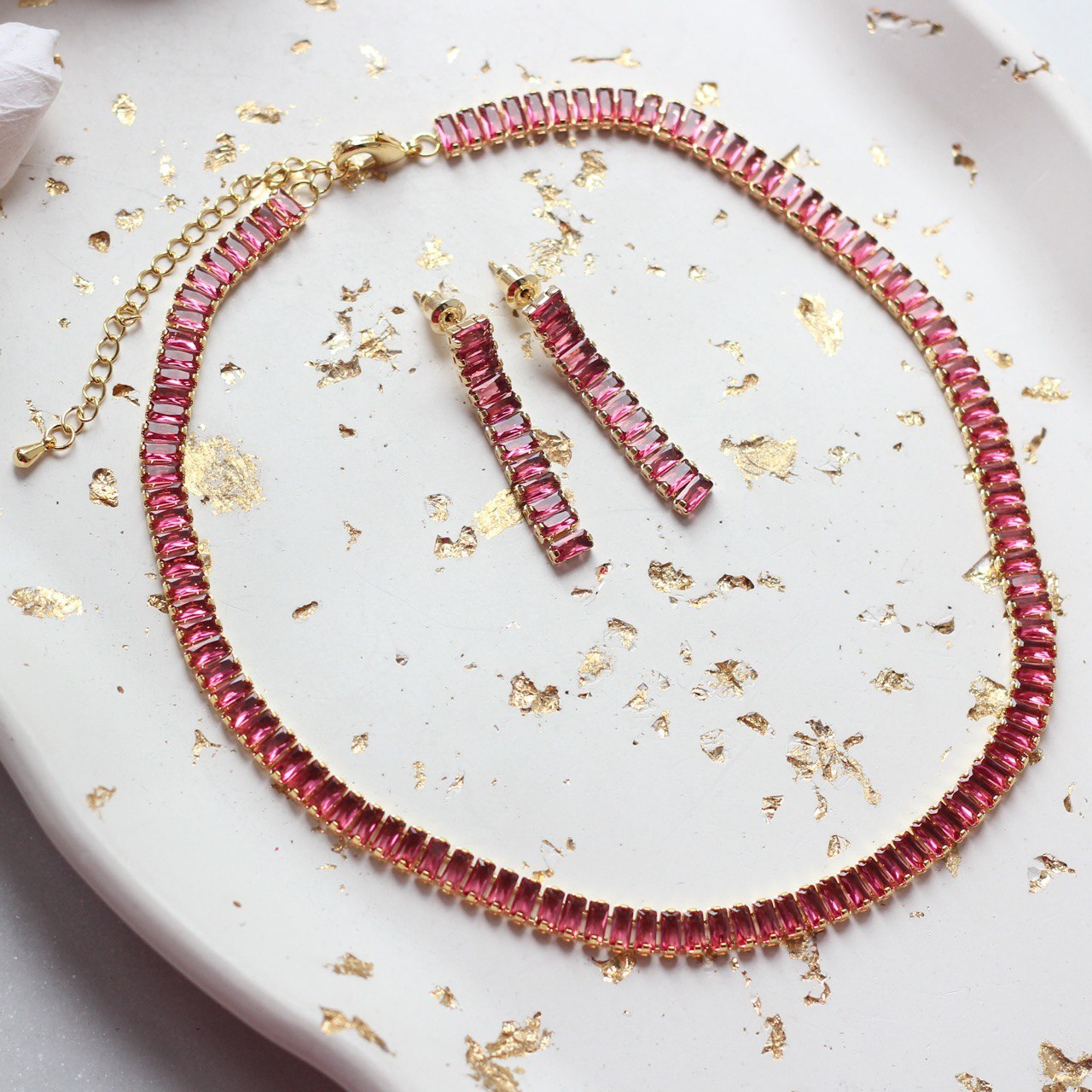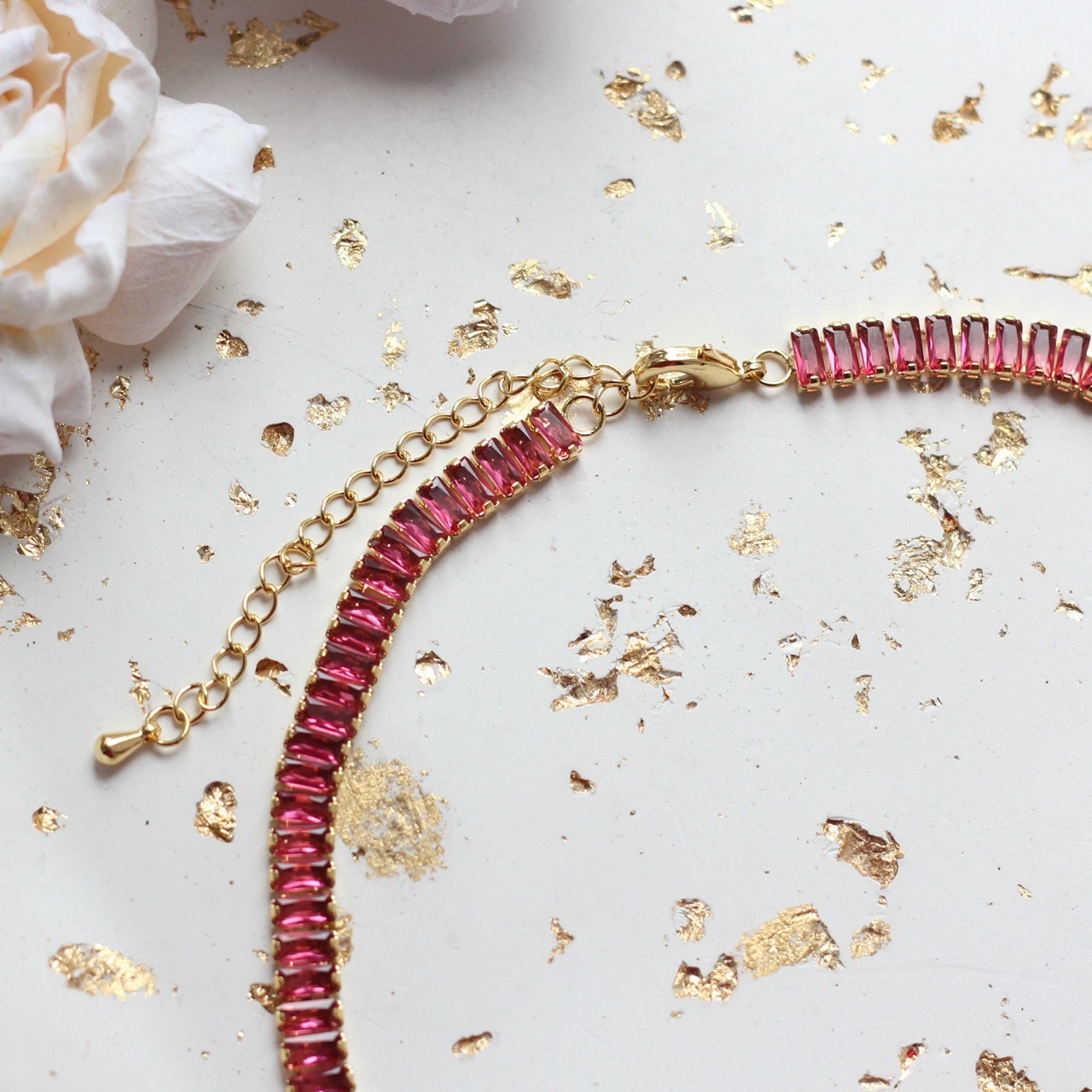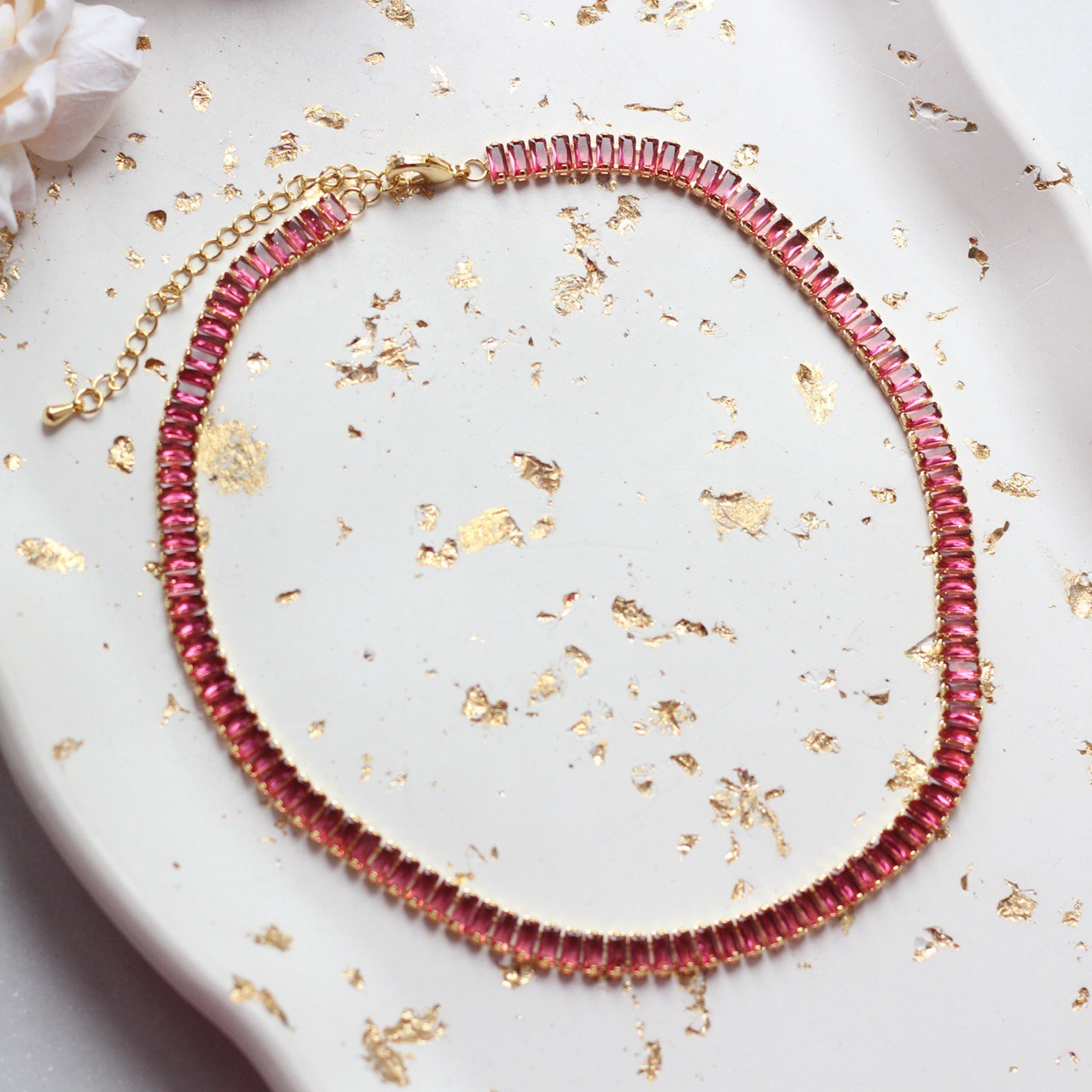 Шикарный чокер из фианитов цвета фуксии, позолота