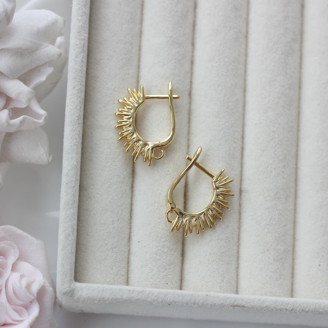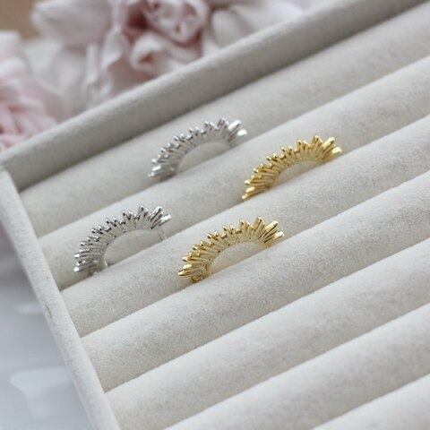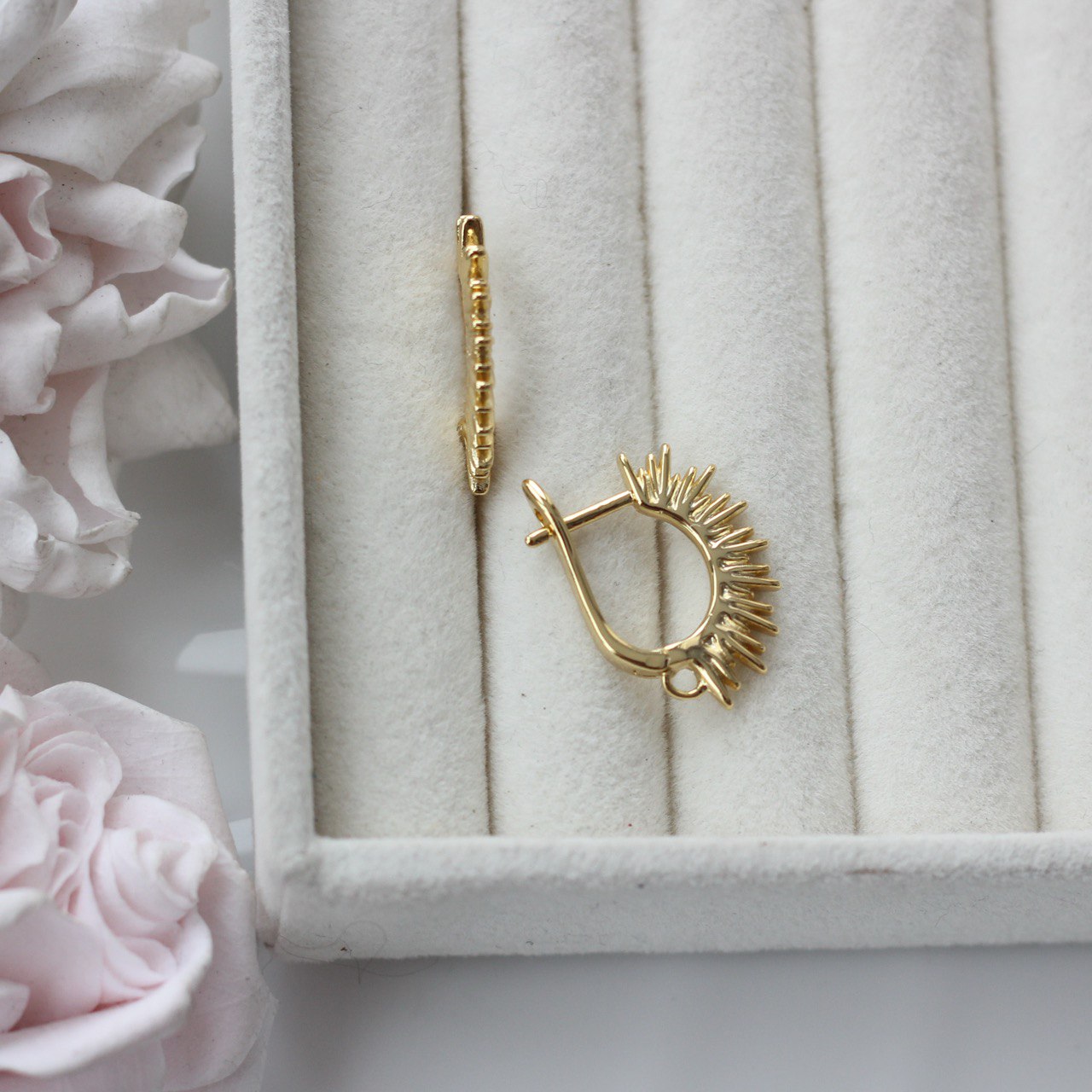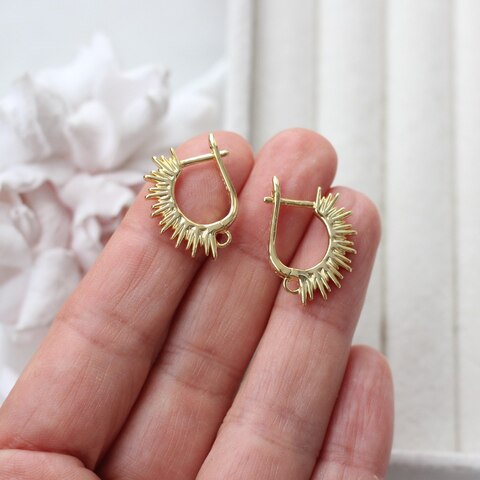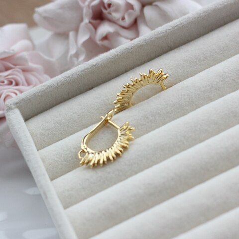 Выразительные швензы с английским замком и декоративным рельефом в виде расходящихся лучей — эффектная основа для акцентных серёг. Дизайн напоминает солнечную корону: динамичную, живую, с ярким световым бликом на каждом элементе.
