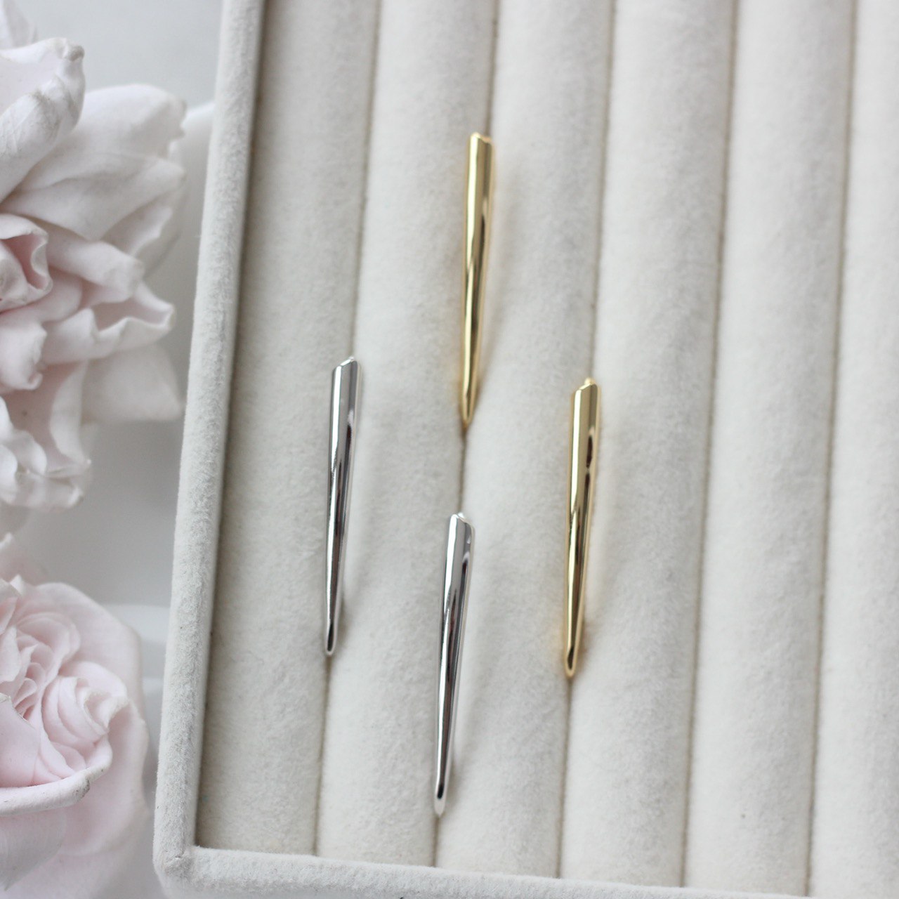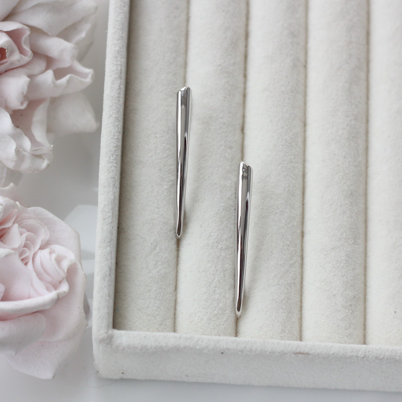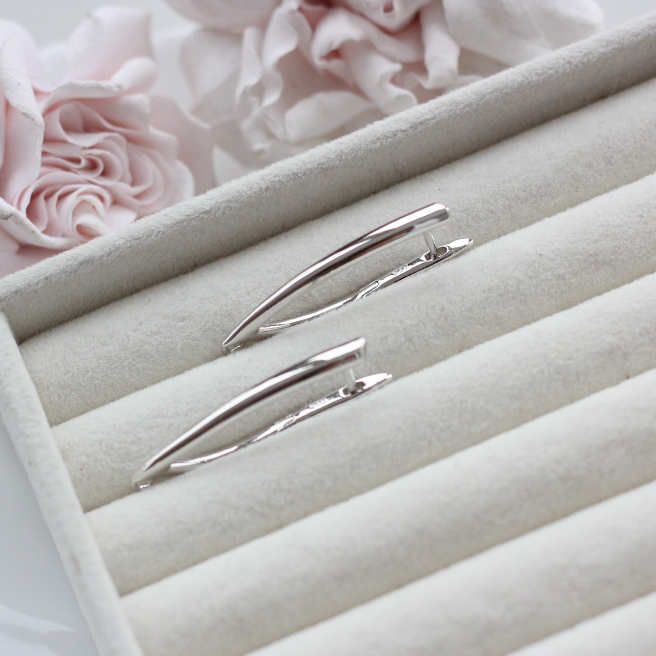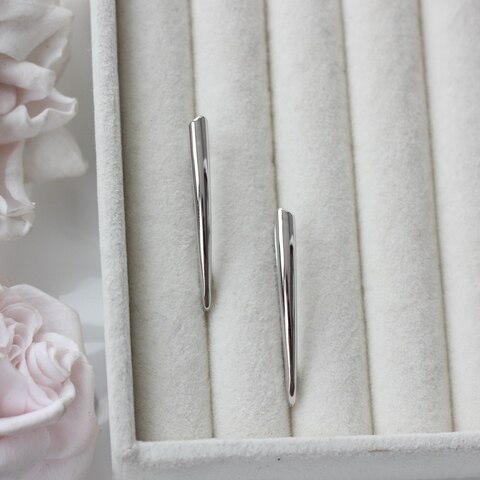 Гладкая полированная поверхность красиво отражает свет, а вытянутая форма визуально удлиняет серьгу и делает образ более лёгким и элегантным.