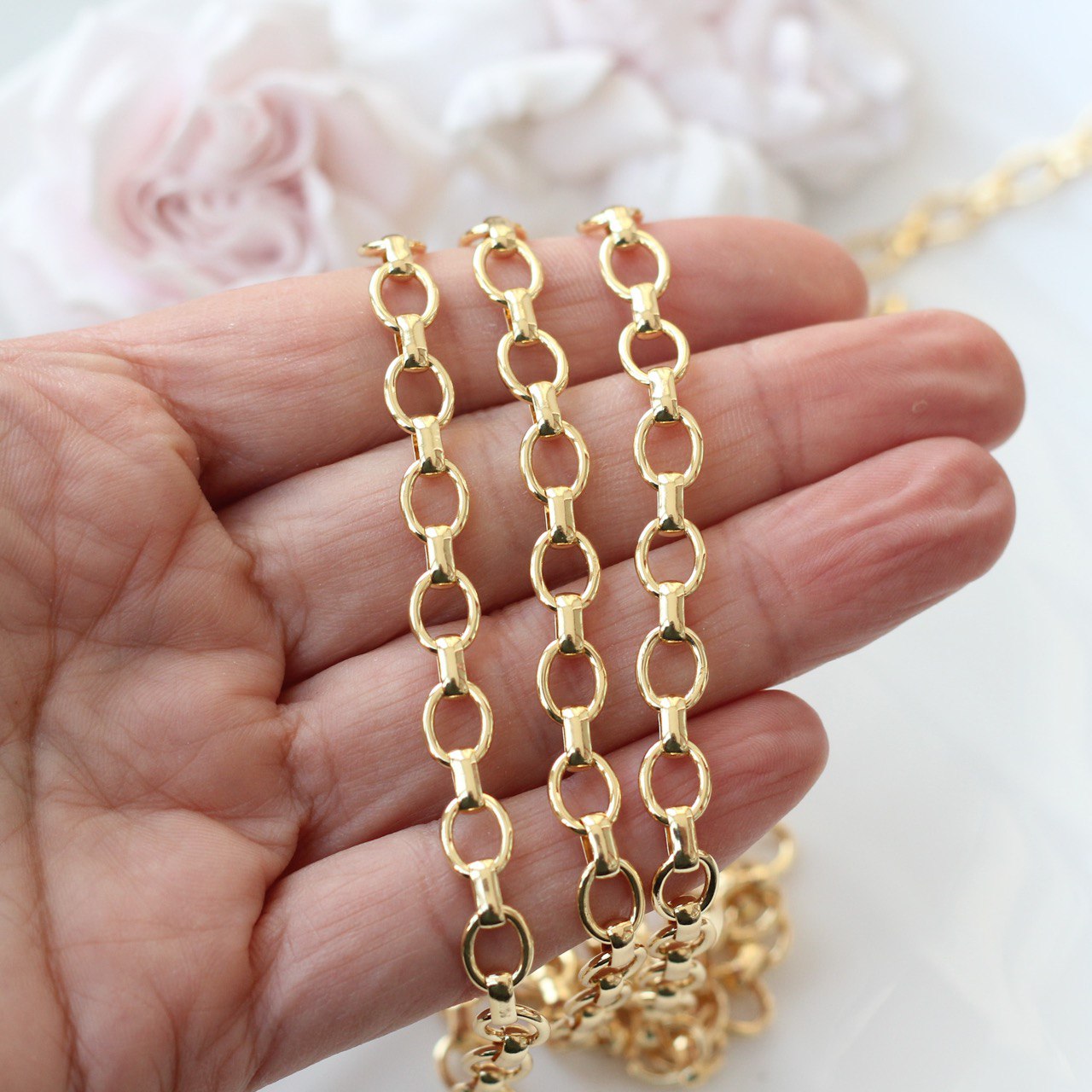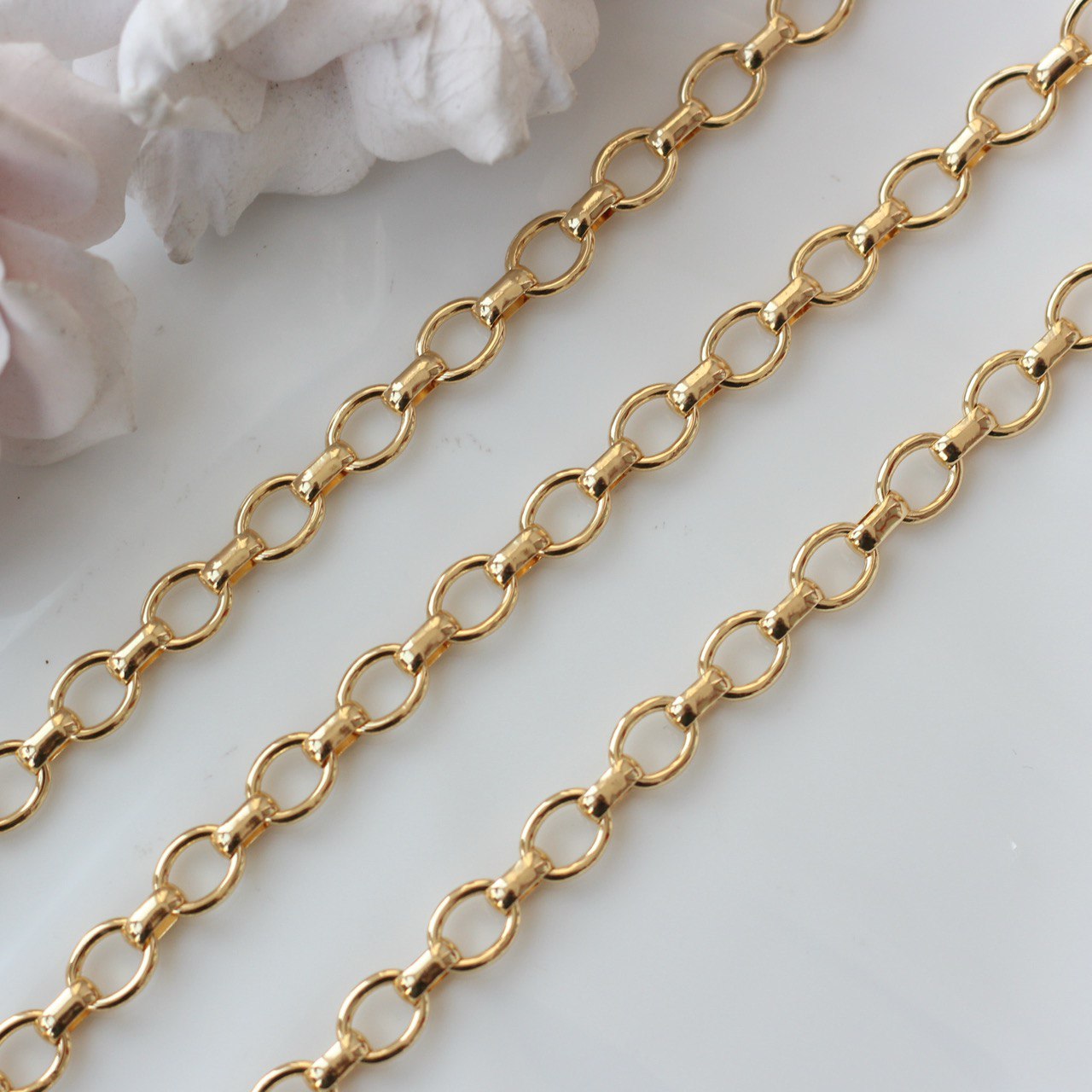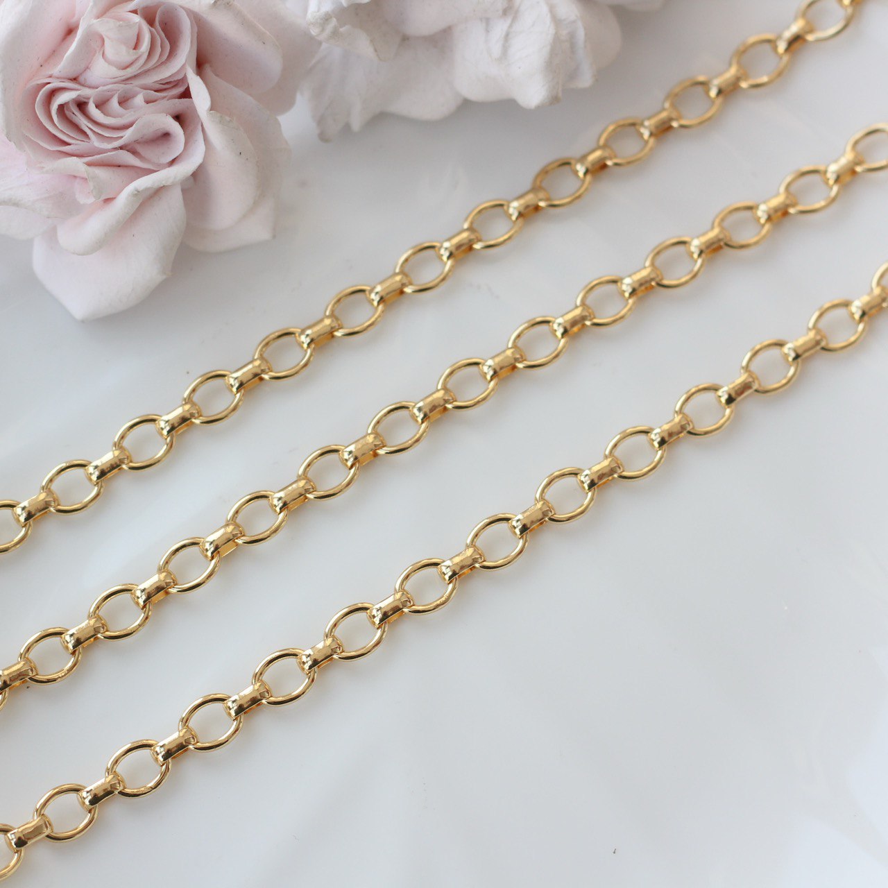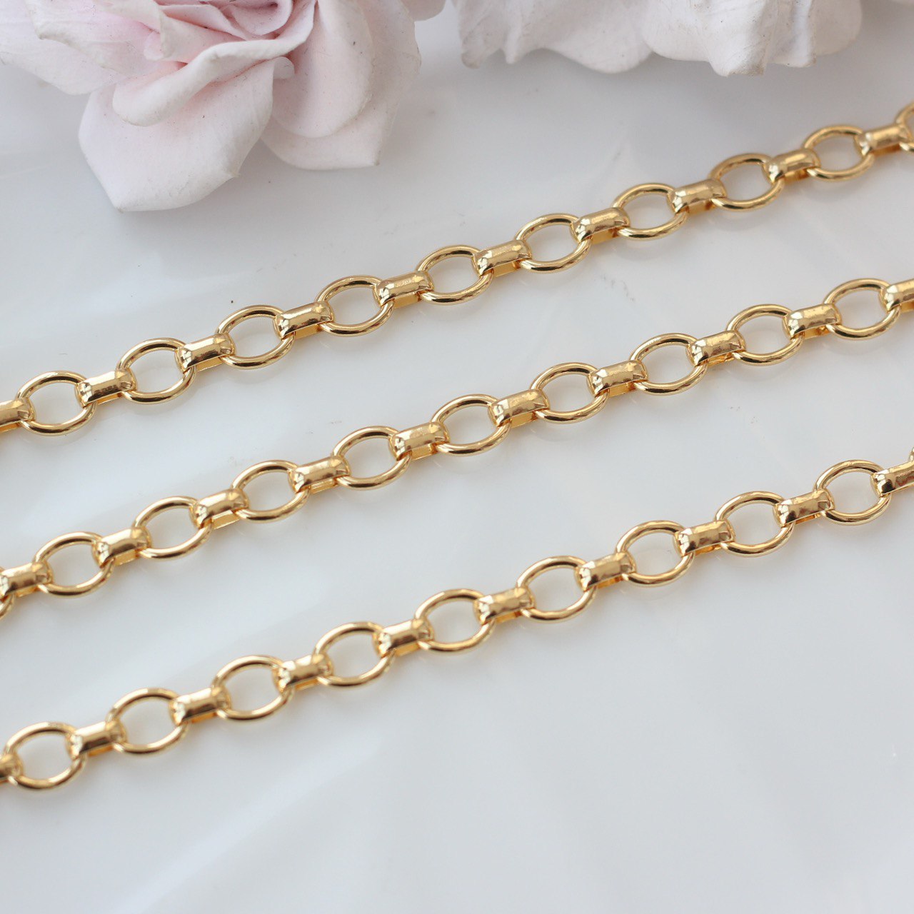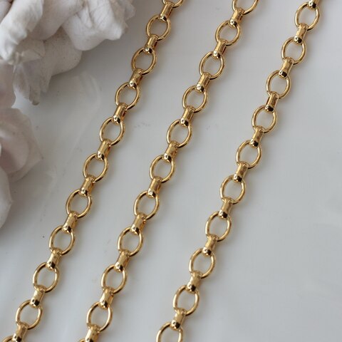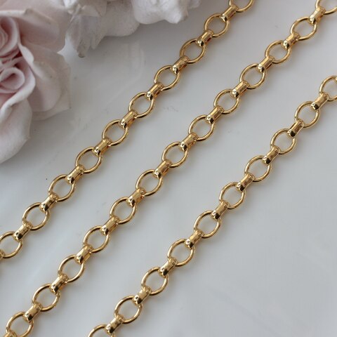 Декоративная металлическая цепь с классическими овальными звеньями аккуратной формы. Универсальный вариант для создания украшений в современном, минималистичном или базовом стиле.