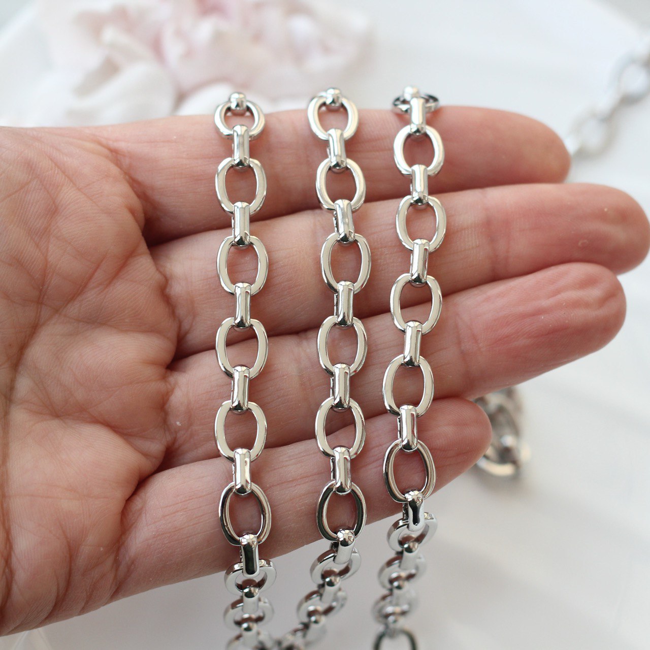 Цепь выглядит аккуратно и ровно, хорошо отражает свет и легко сочетается с подвесками, бусинами, вставками и фурнитурой. Подходит как для самостоятельных украшений, так и для сложных многослойных композиций.