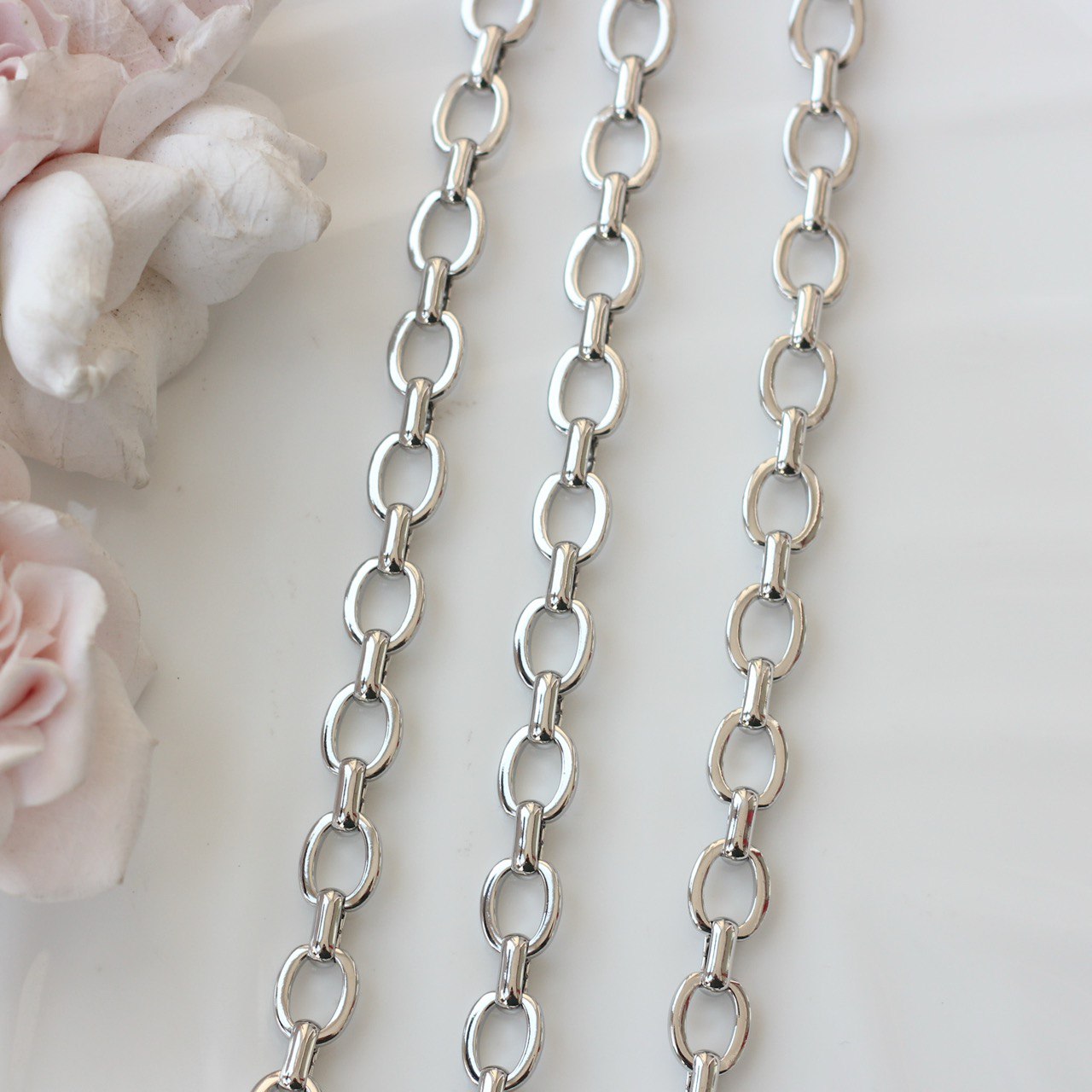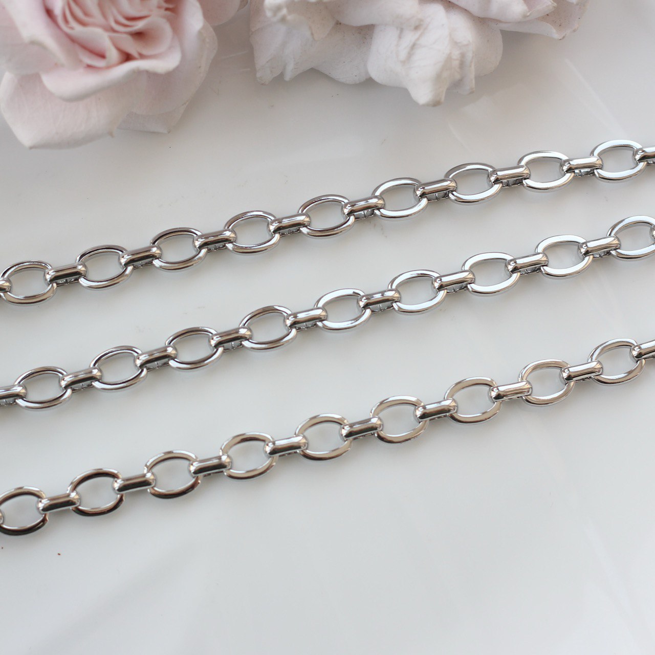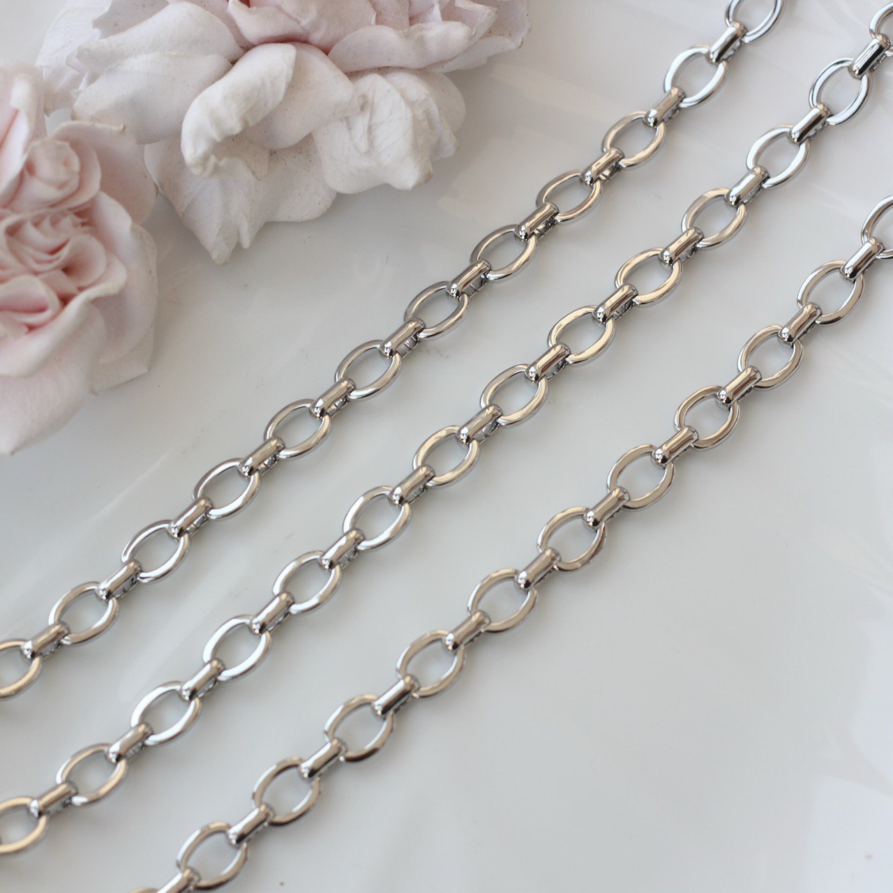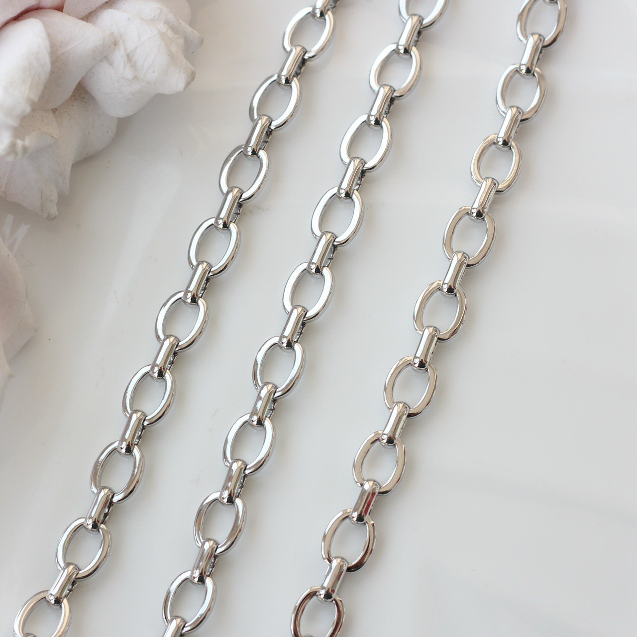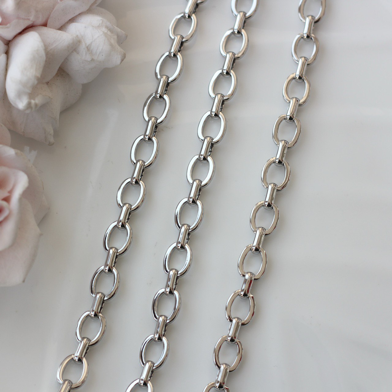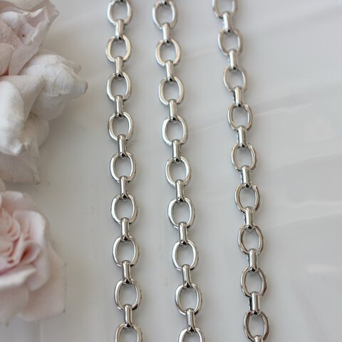 Декоративная металлическая цепь с классическими овальными звеньями аккуратной формы. Универсальный вариант для создания украшений в современном, минималистичном или базовом стиле.