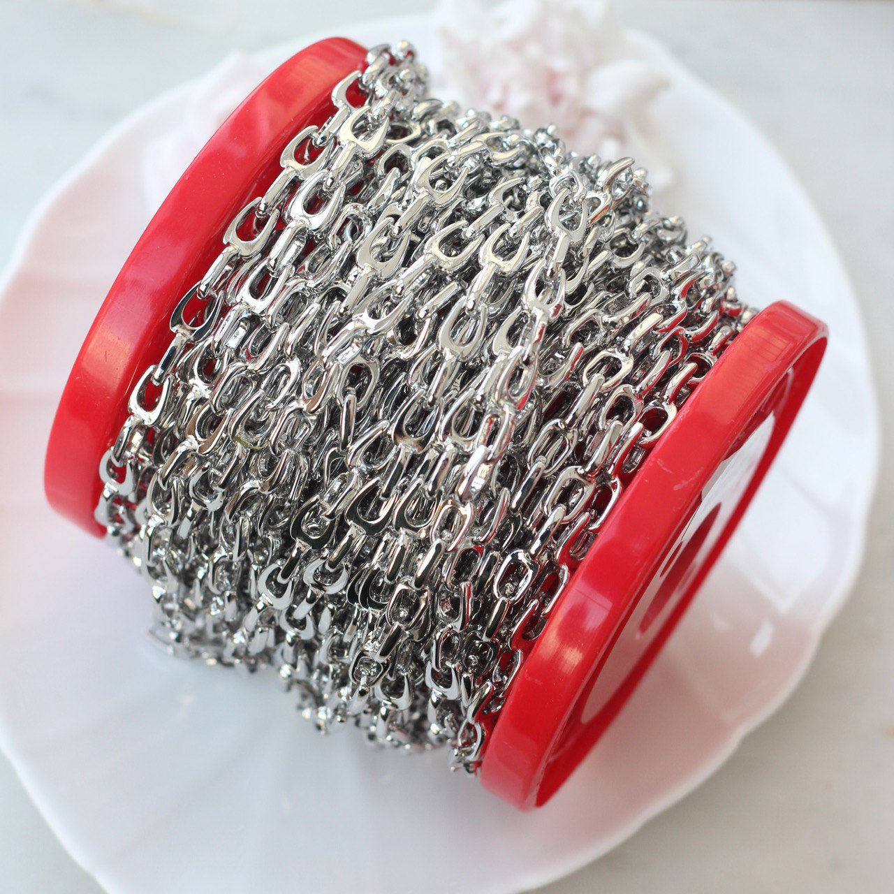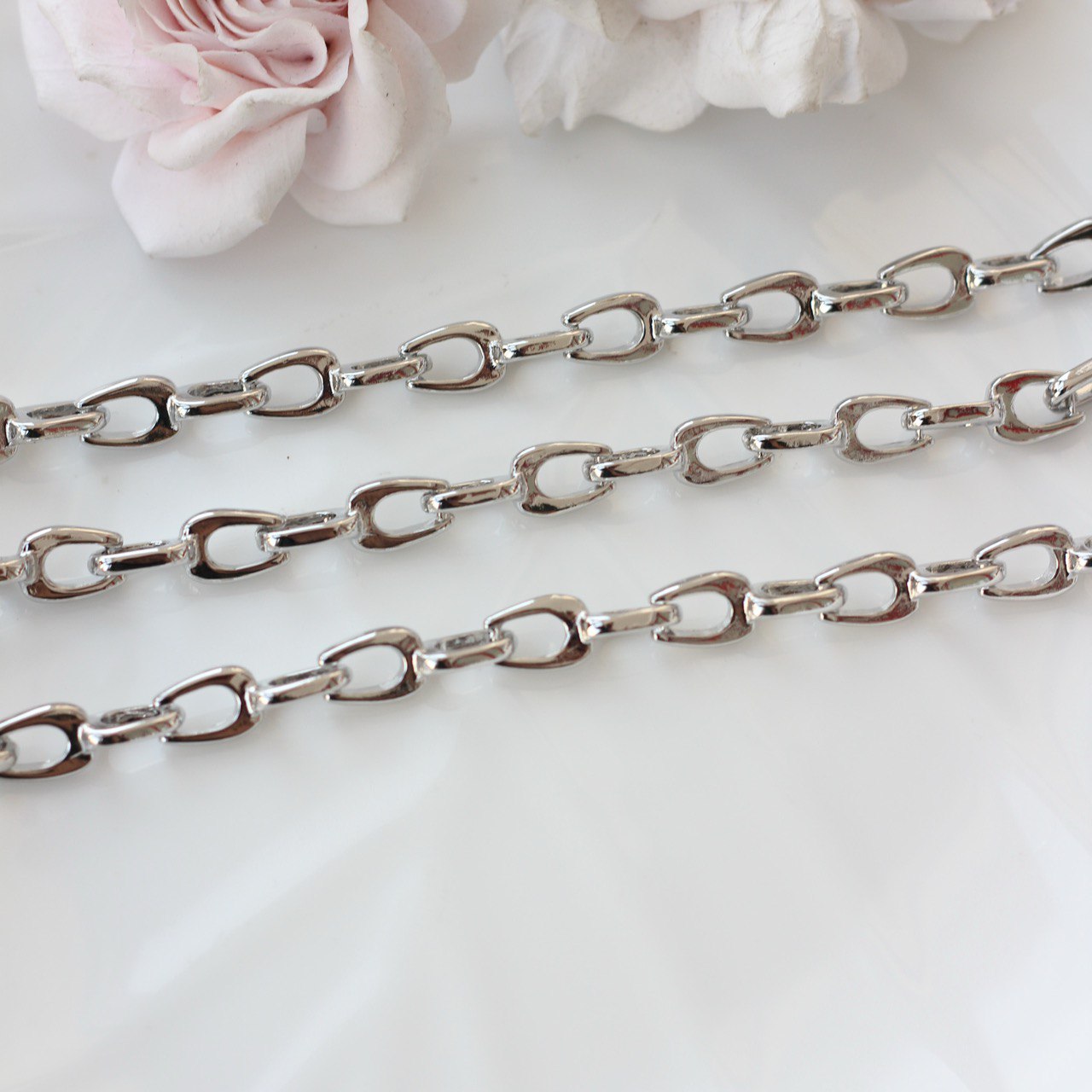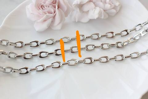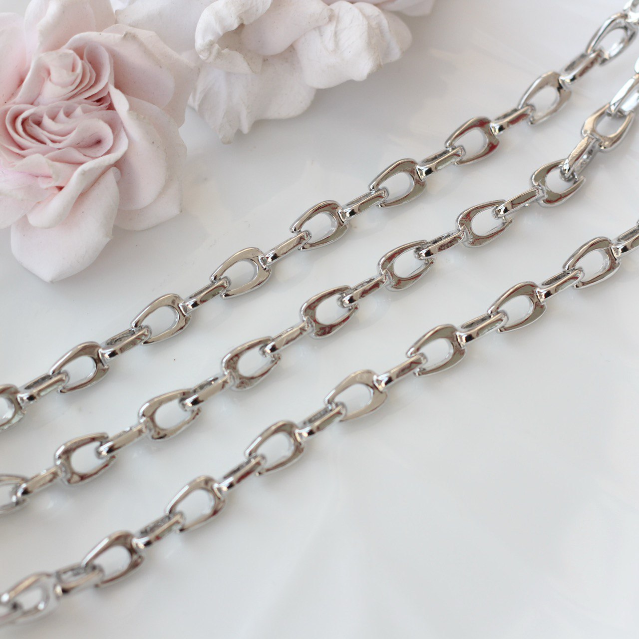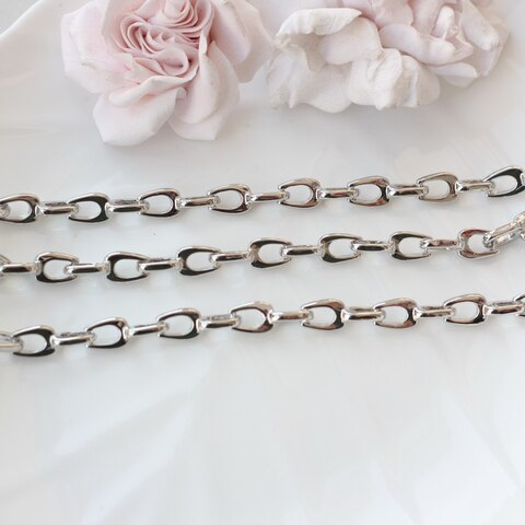 Двойное звено создаёт интересную игру света и добавляет украшению характер — цепь смотрится как самостоятельный дизайнерский элемент и не требует дополнительного декора. Отлично подходит для колье, чокеров, браслетов, а также для создания акцентных цепочек с подвесками или без них.