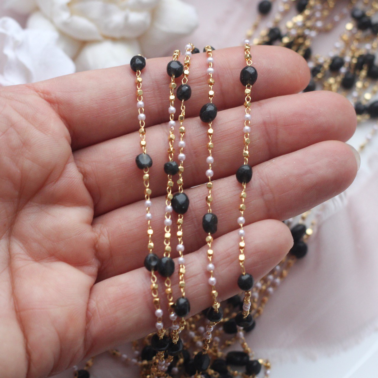 Размер: звено цепочки 2 мм, каменная бусина 3-5 мм, жемчужина 2 мм