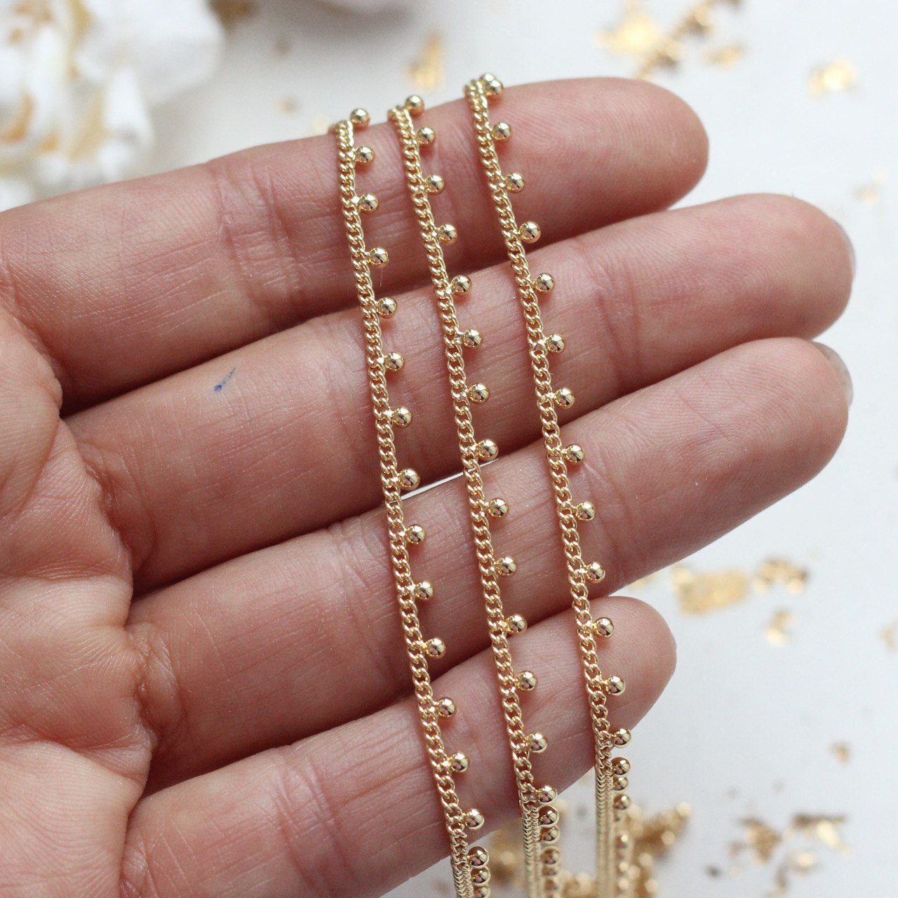 Размер звена 1,8 мм, шарик 2 мм, расстояние между шариками 5 мм