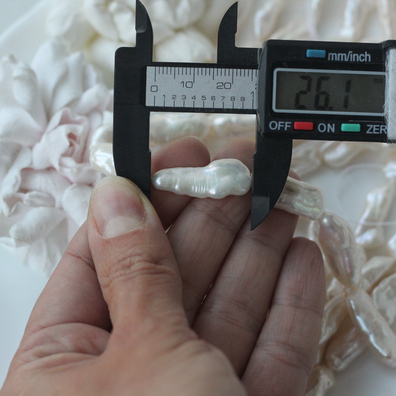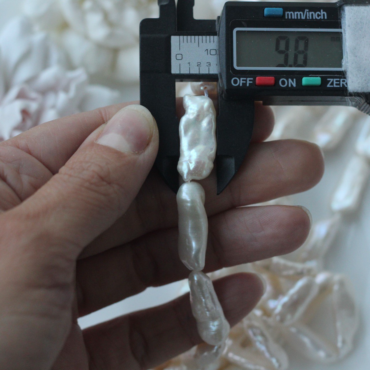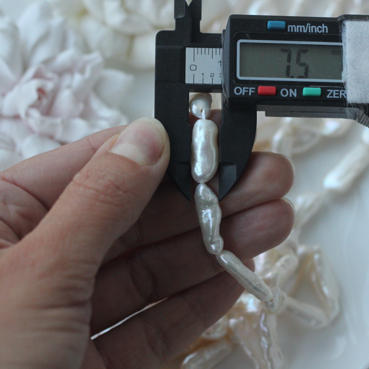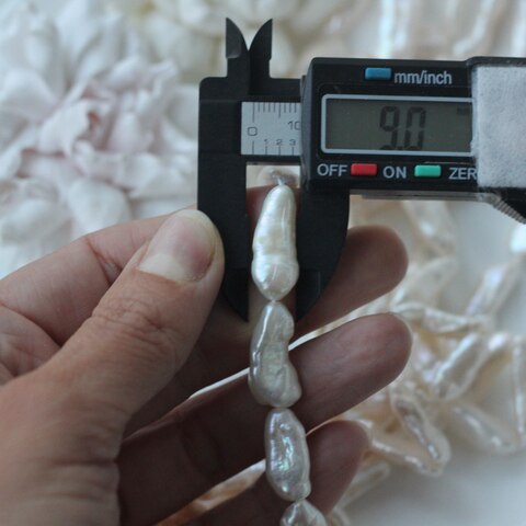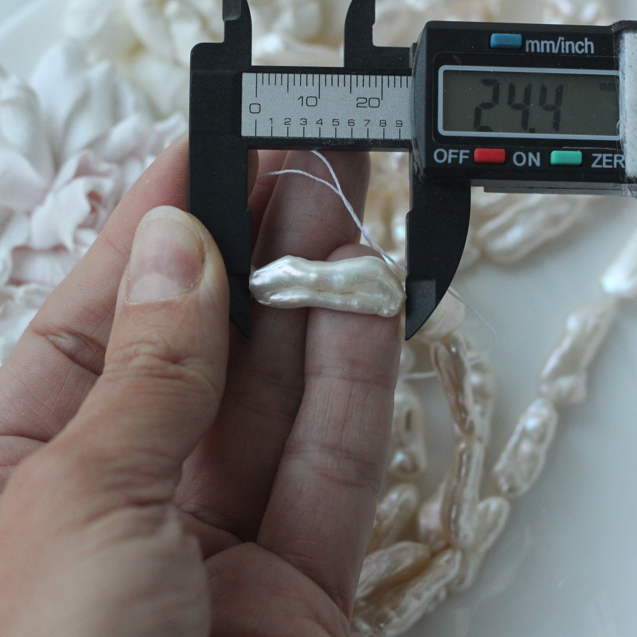 📏 Обратите внимание: размер указывается в среднем по нити, отдельные жемчужины могут иметь естественные отклонения по форме и размеру — это особенность натурального материала. Для наглядности приложили фото с замерами жемчуга. Каждая нить индивидуальна, могут быть расхождения 0,2 мм