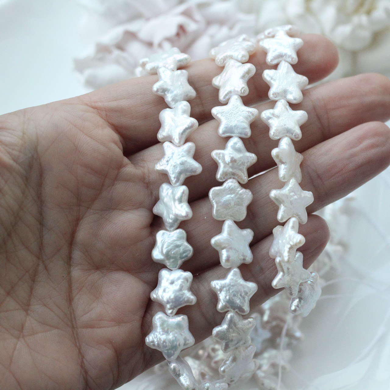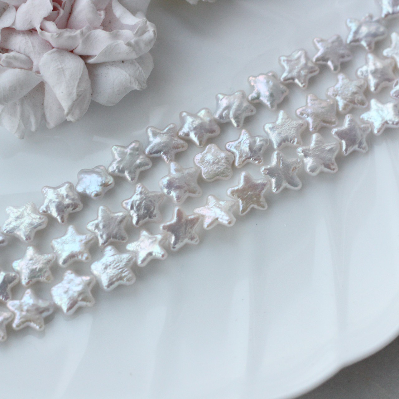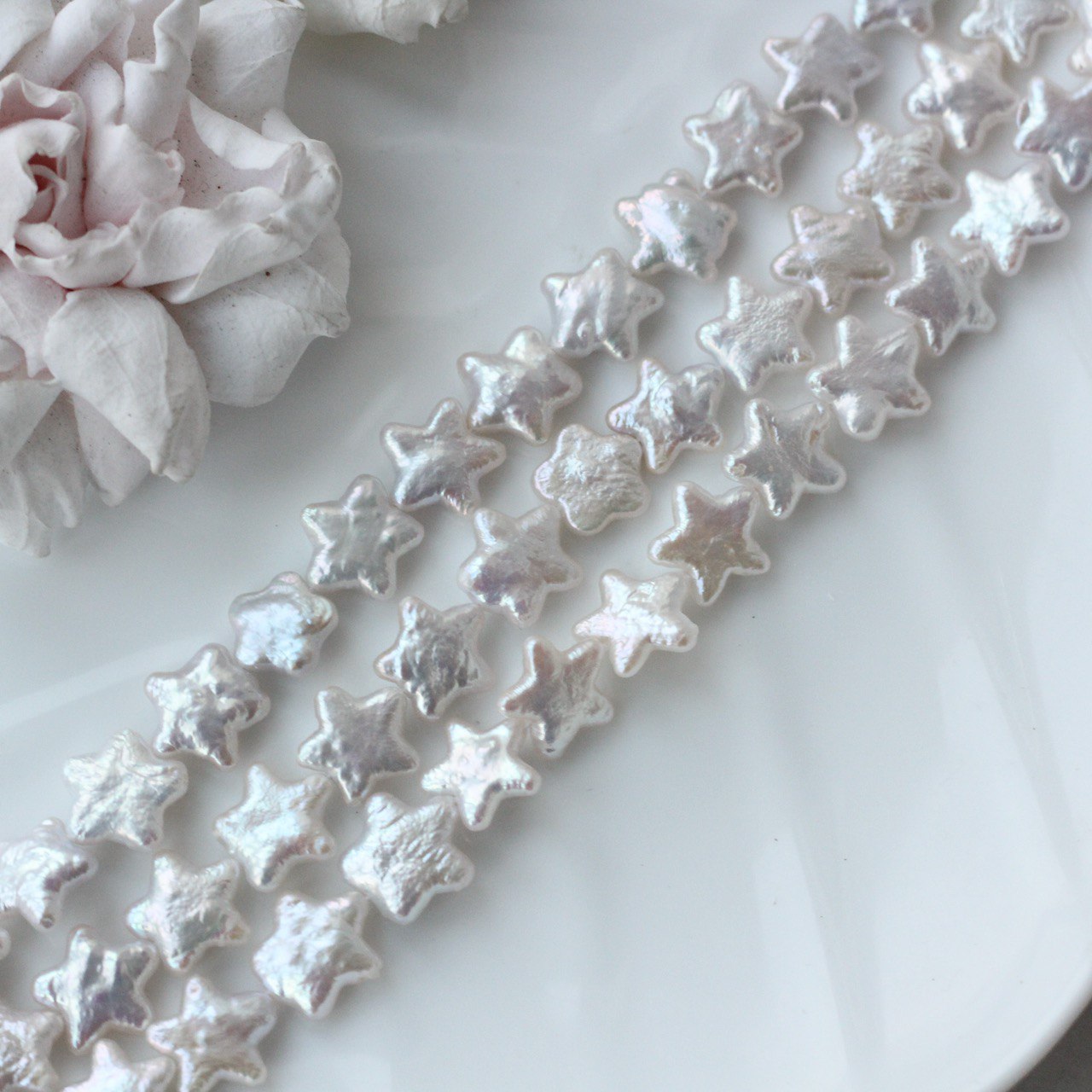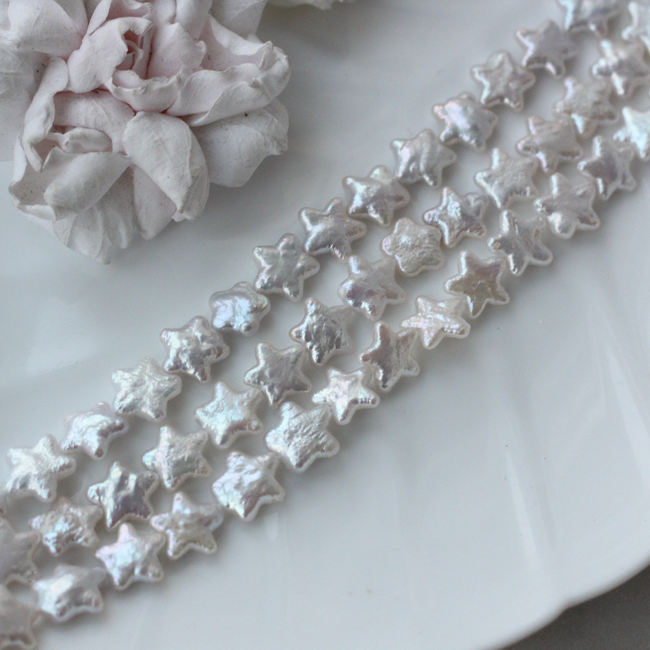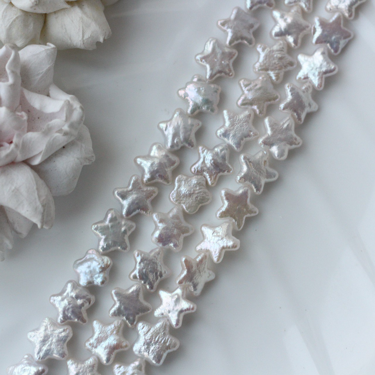 Натуральный барочный жемчуг в форме звёзд — выразительный и живой материал для авторских украшений. Каждая бусина имеет уникальную форму, мягкий перламутровый блеск и природную фактуру, благодаря чему нить выглядит особенно объёмно и атмосферно.
