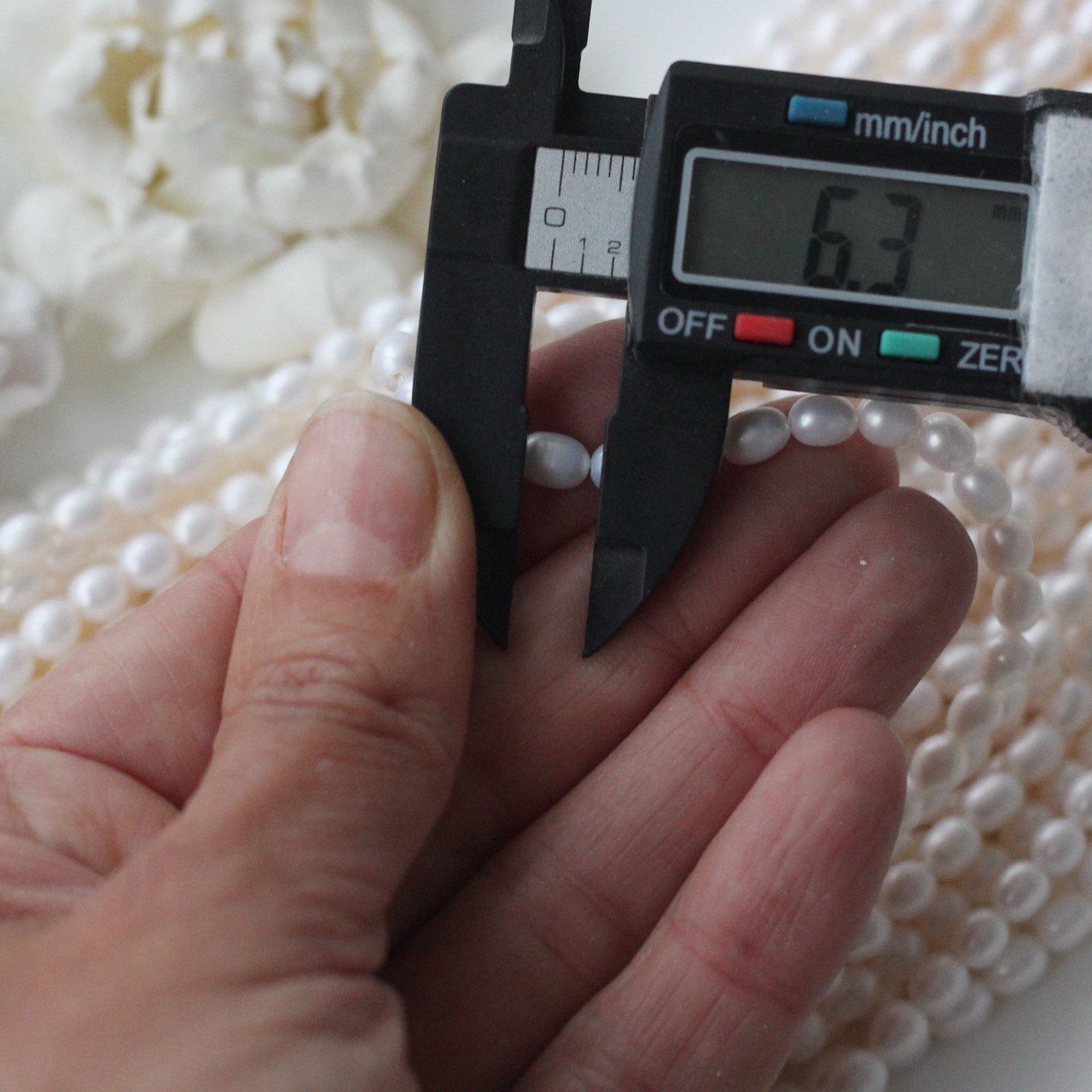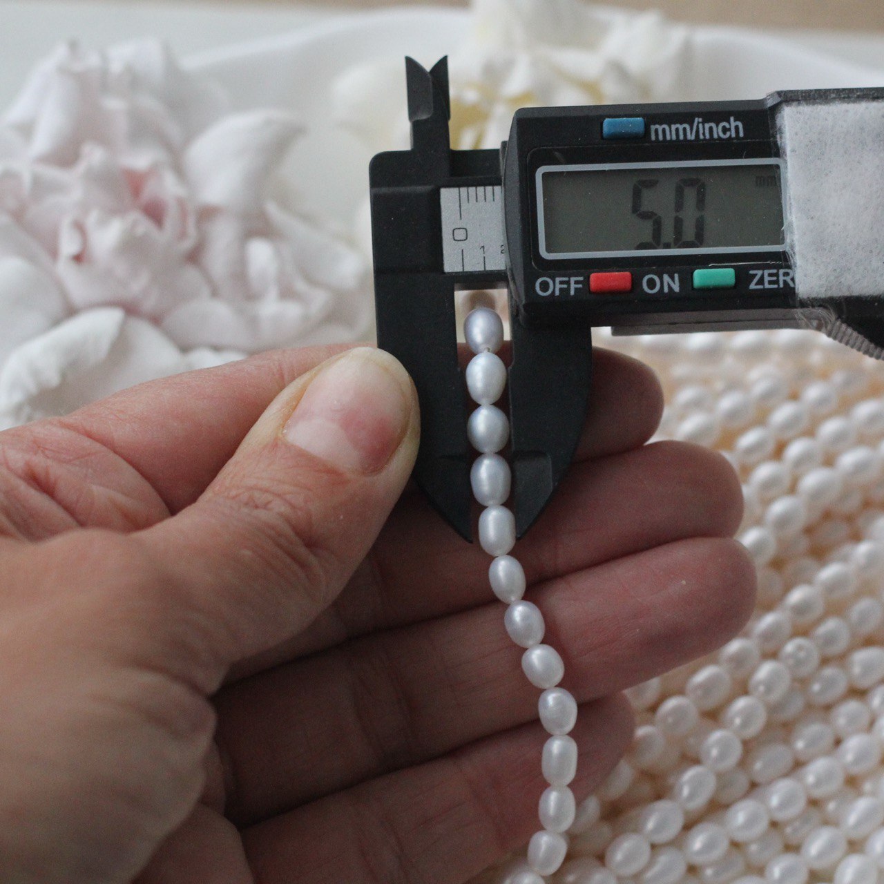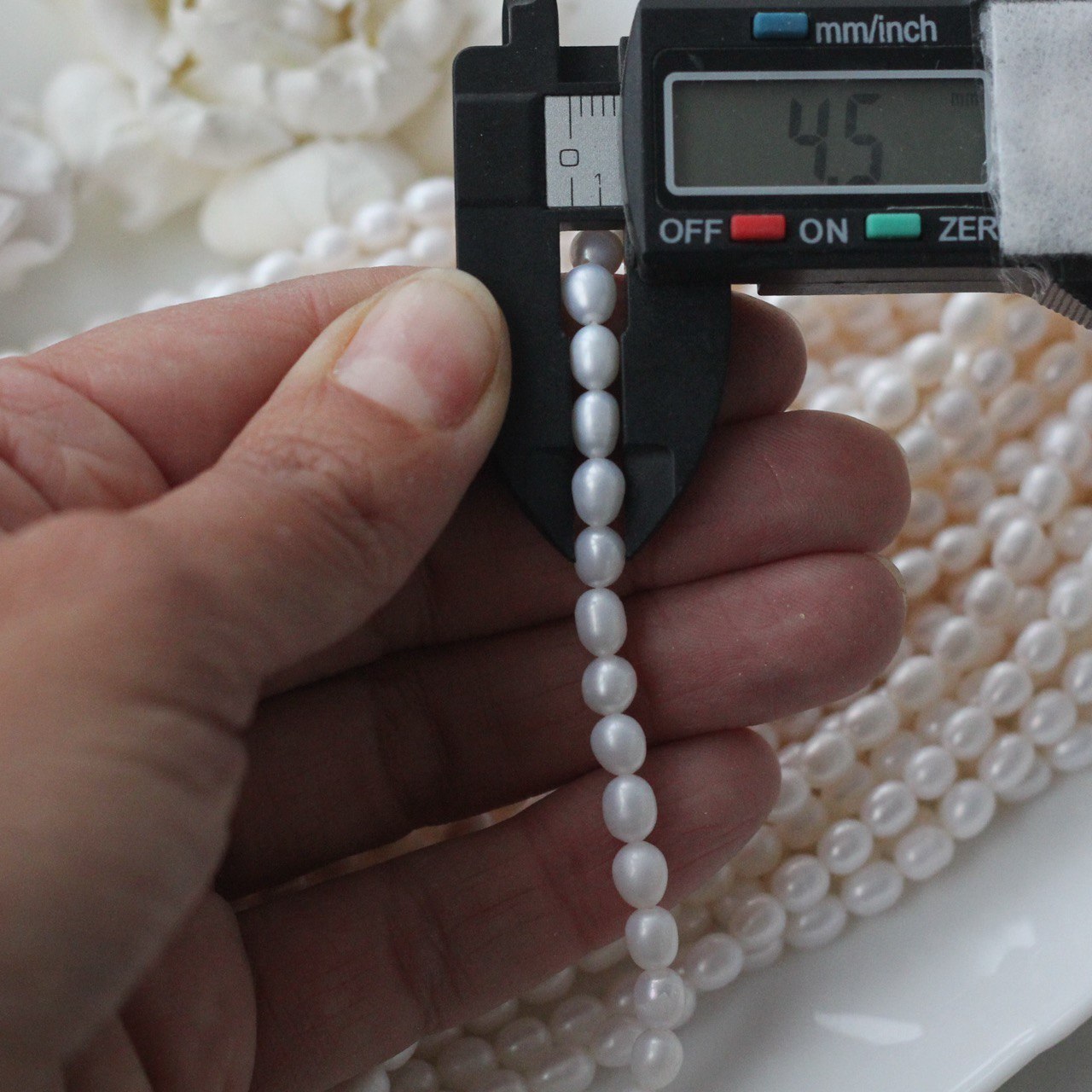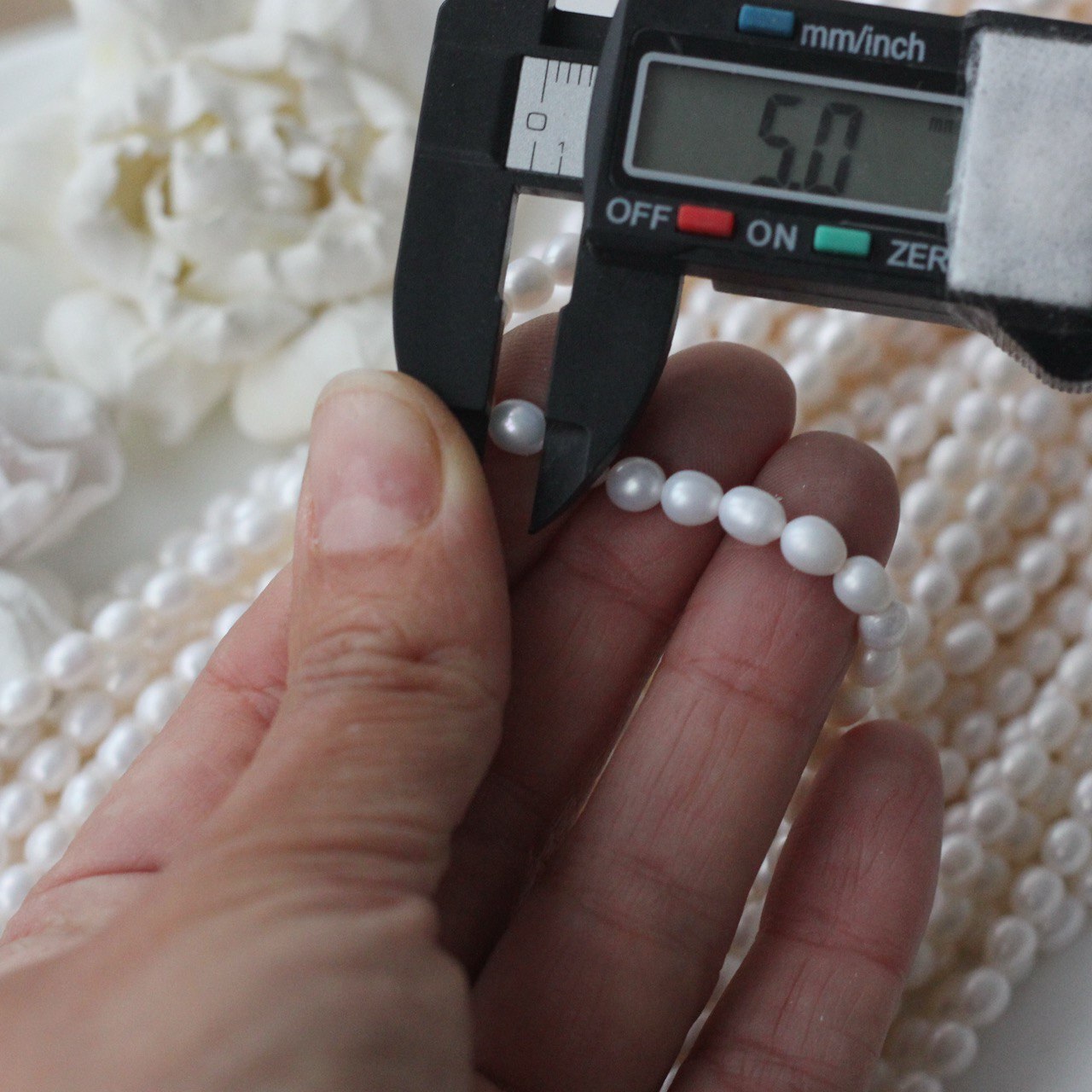 📏 Обратите внимание: размер указывается в среднем по нити, отдельные жемчужины могут иметь естественные отклонения по форме и размеру — это особенность натурального материала. Для наглядности приложили фото с замерами жемчуга. Каждая нить индивидуальна, могут быть расхождения 0,2 мм
