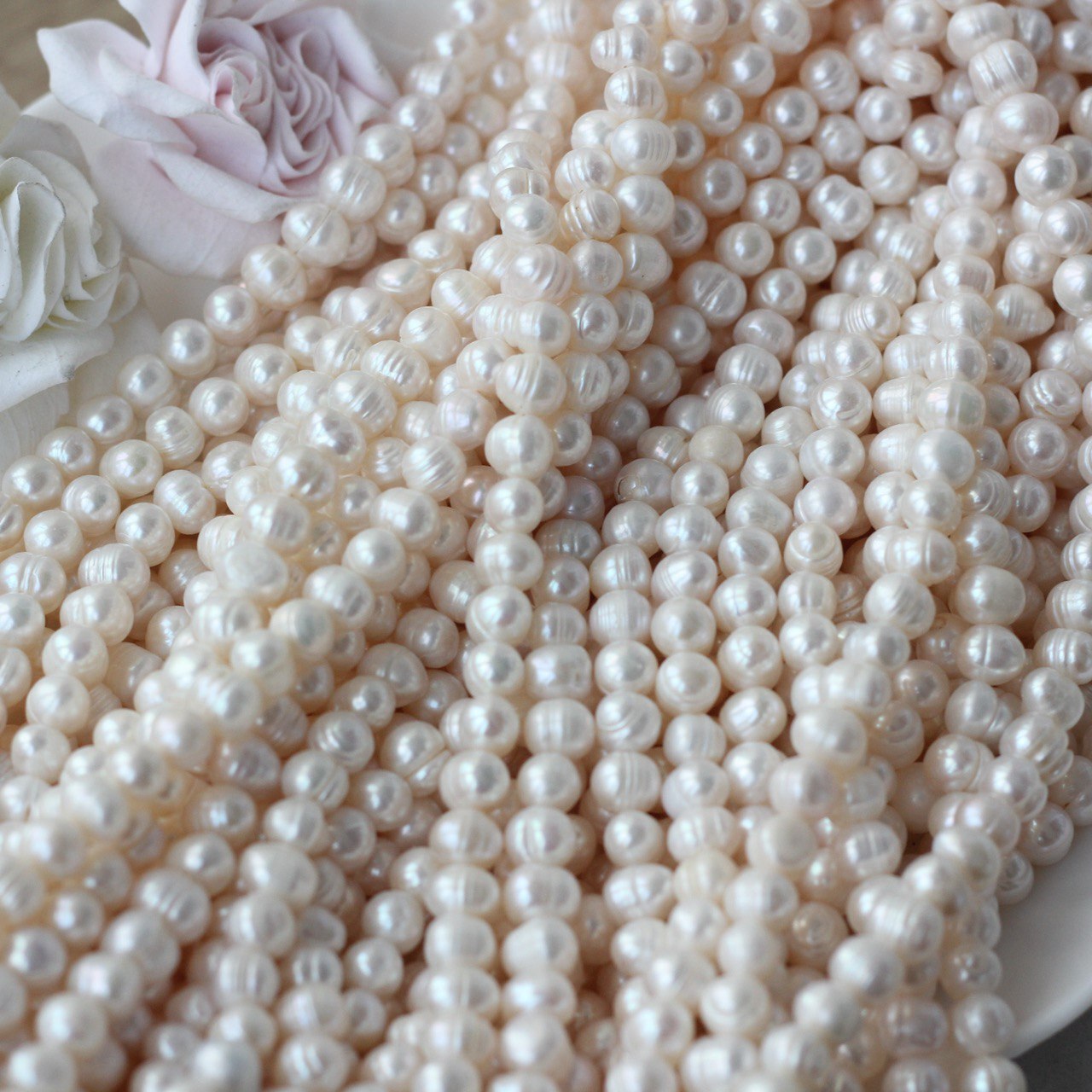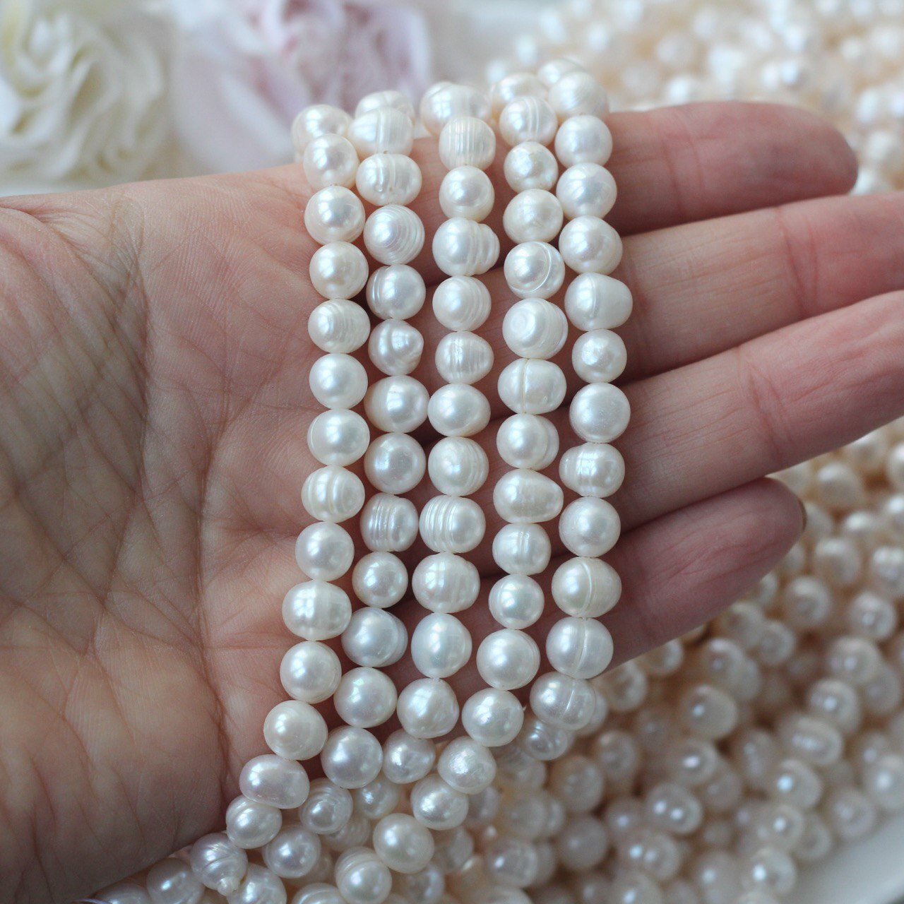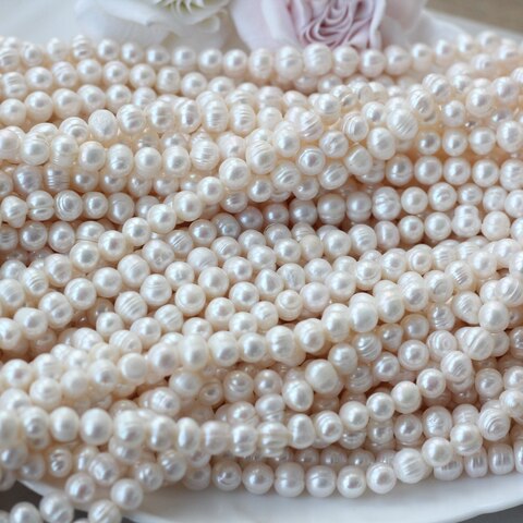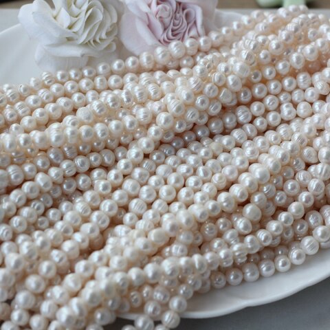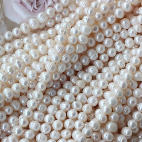 Натуральный речной жемчуг круглой слегка приплюснутой формы. Бусины имеют мягкую, живую форму и естественный перламутровый блеск, благодаря чему украшения смотрятся объёмно и благородно.