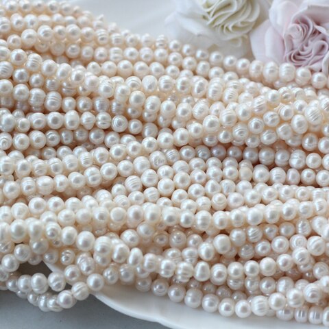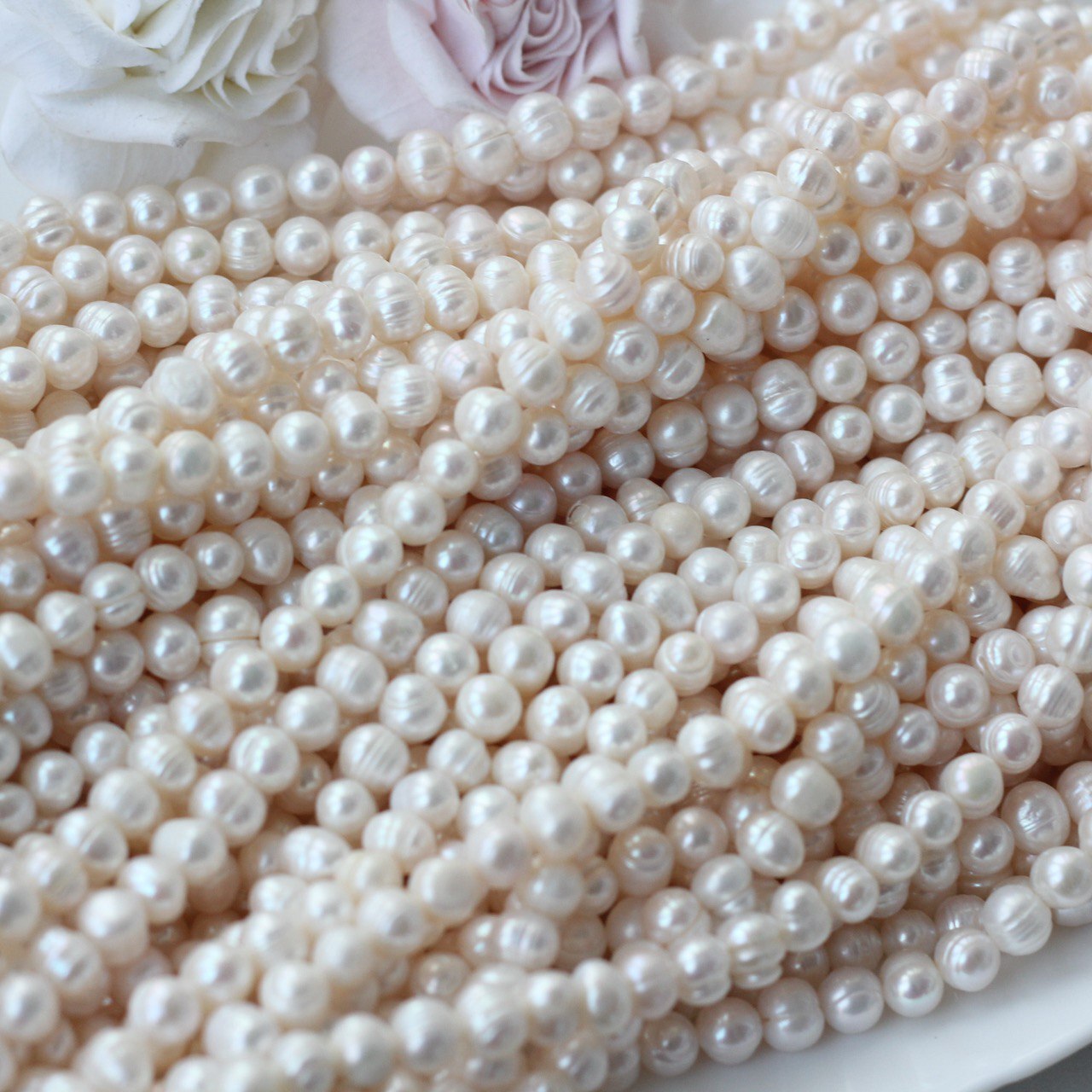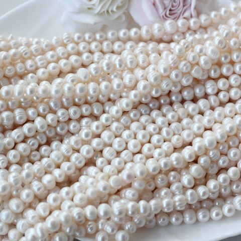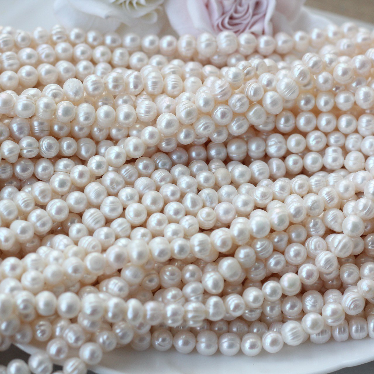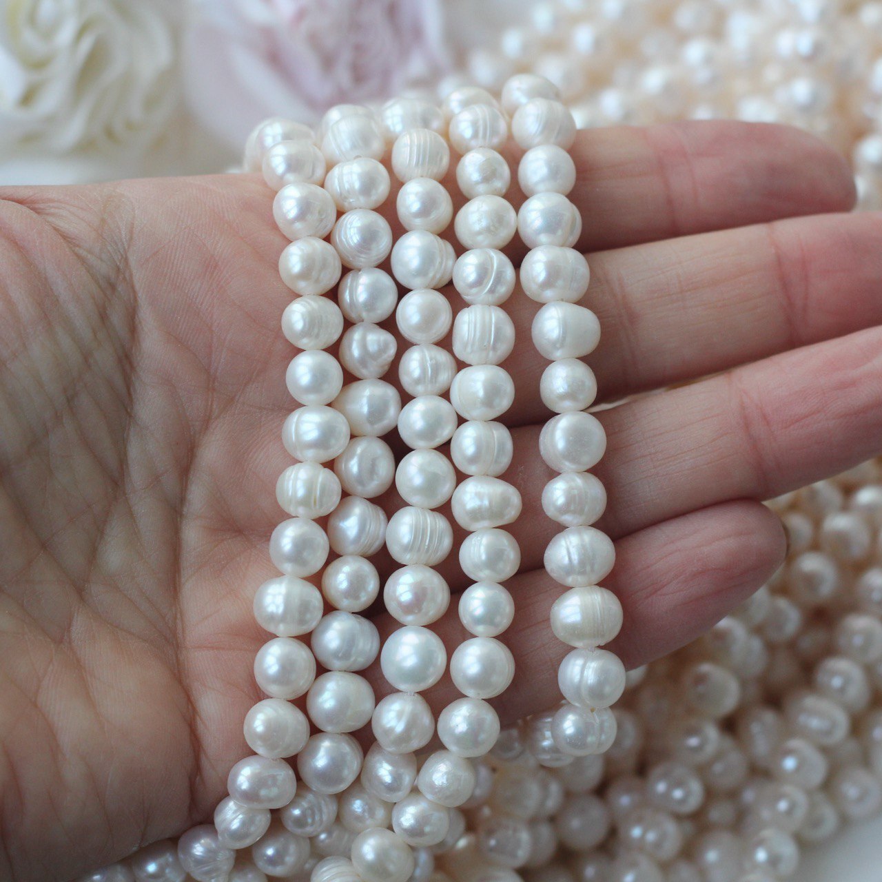 Натуральный речной жемчуг круглой слегка приплюснутой формы. Бусины имеют мягкую, живую форму и естественный перламутровый блеск, благодаря чему украшения смотрятся объёмно и благородно.